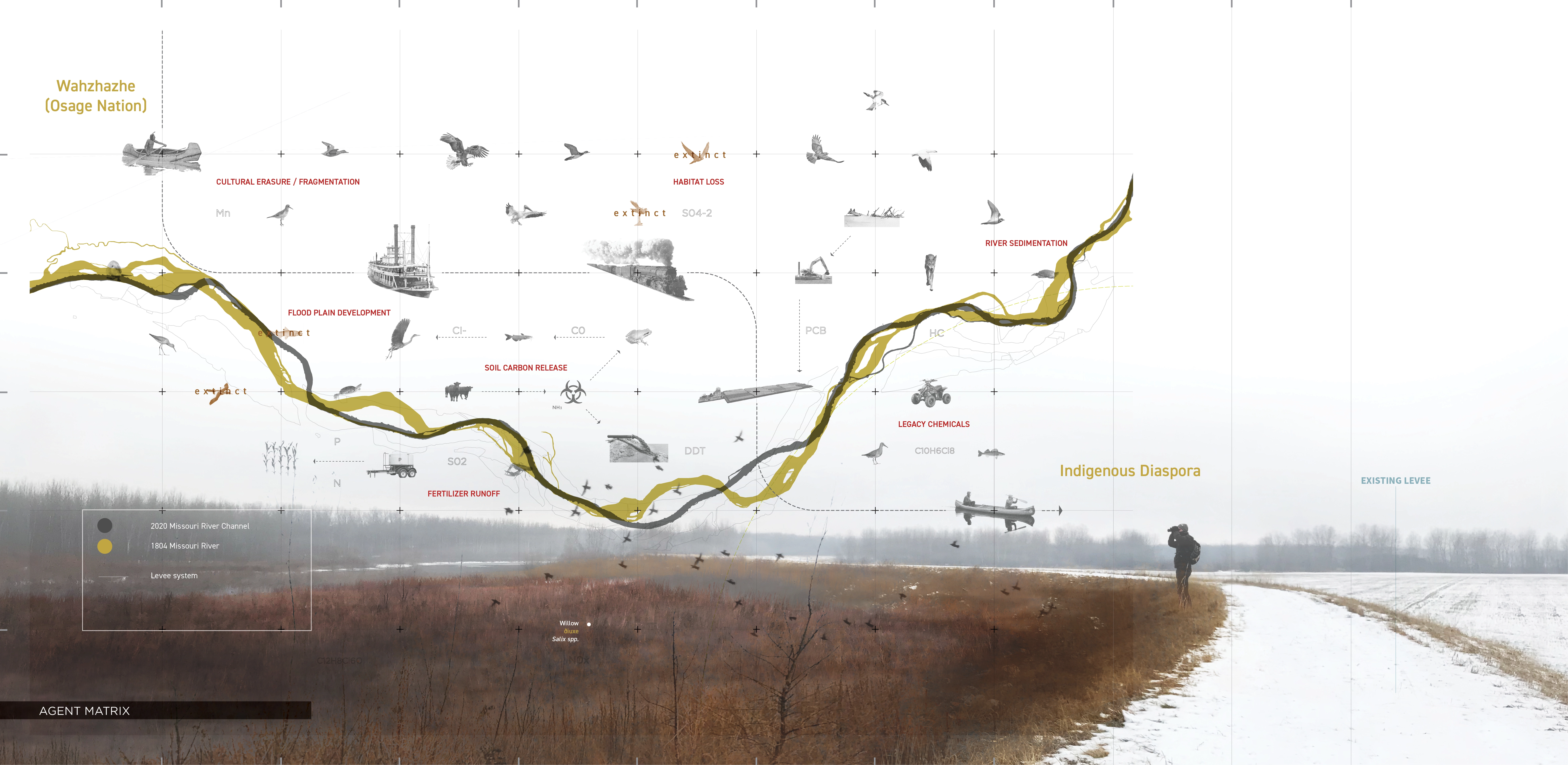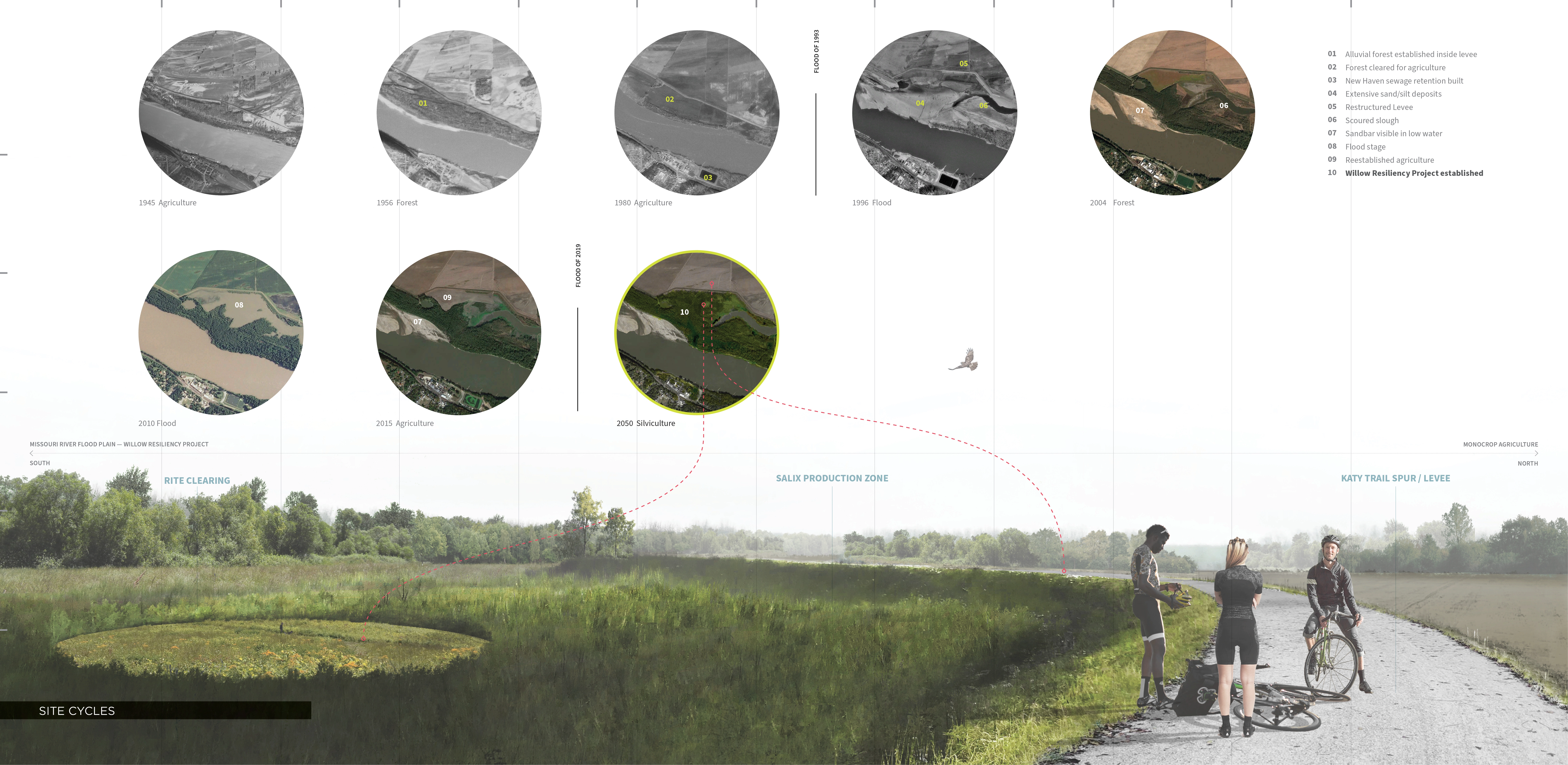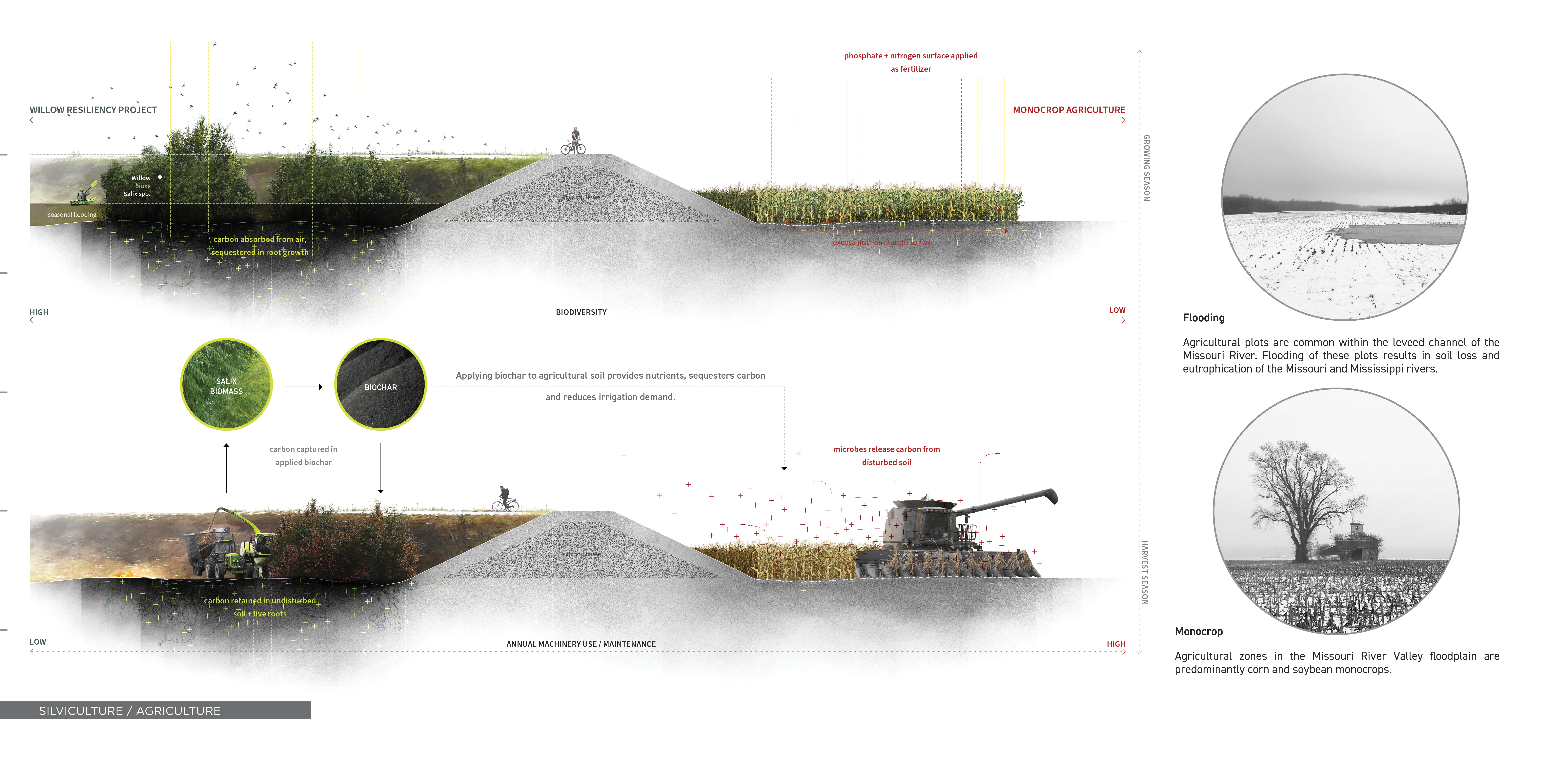 The Willow Resiliency Project proposes a biomass industry cooperative between rural communities and repatriated indigenous populations of the Lower Missouri River Valley. Hybridized program of production, research, and recreation expand the typology of rural public space and create opportunity for unconventional interactions between people, ecology, and place. The project calls for establishing an interspecies salix biomass crop within the river’s flood zone, and has integrated aspirations of ecological restoration, knowledge production, regional economic sustainability, and the advancement of social equity. When harvested and burned in a low-oxygen environment, willow cuttings are converted to biochar, a soil ameliorant that sequesters carbon, benefits agricultural crop yields and reduces irrigation demands in silt / sand soil profiles. In acknowledgment of the indigenous practice of utilizing fire for landscape management, the annual fire-rite festival marks the beginning of burn season and celebrates the interdependent nature of landscape and rural culture in the Missouri River Valley.