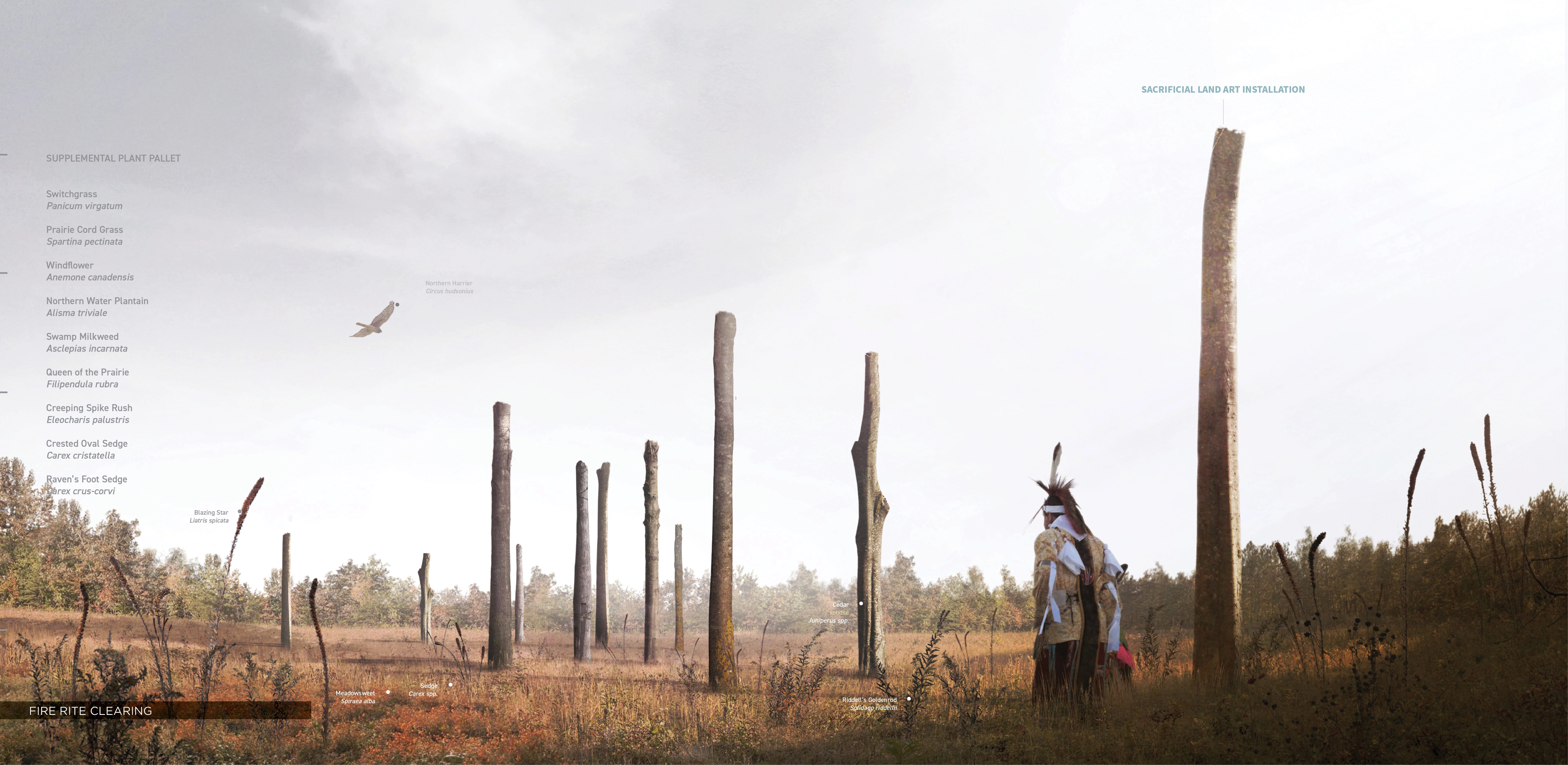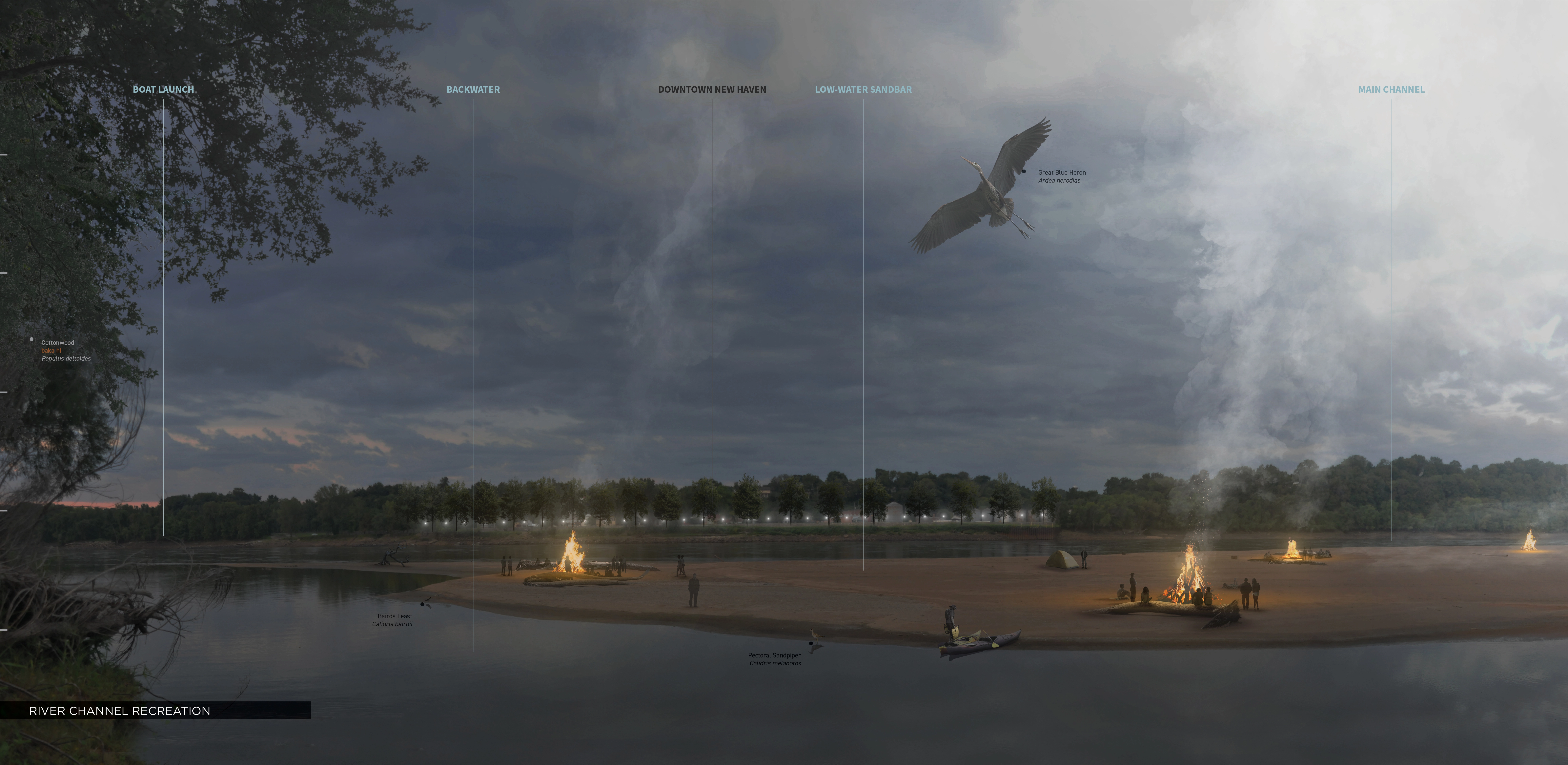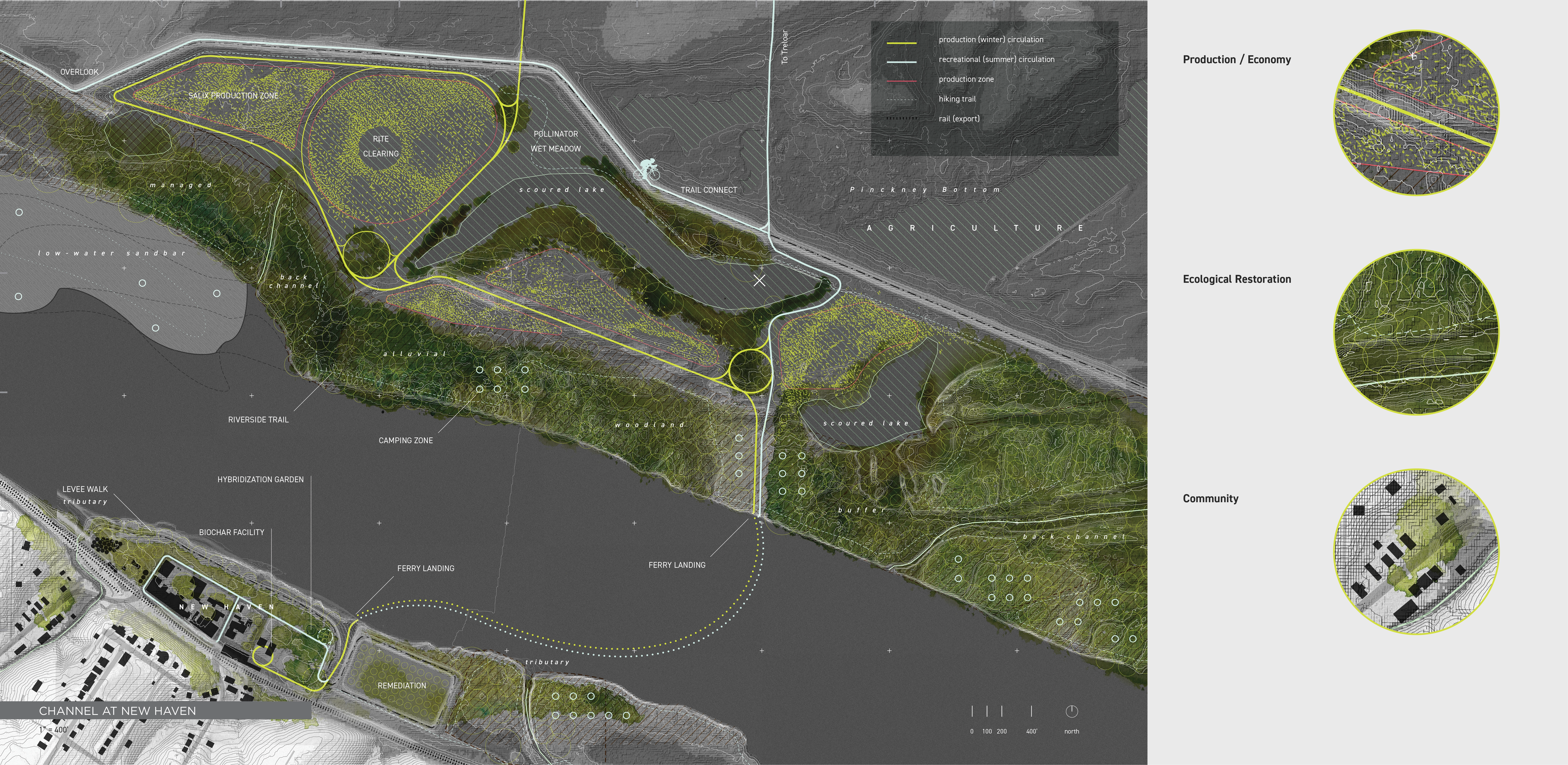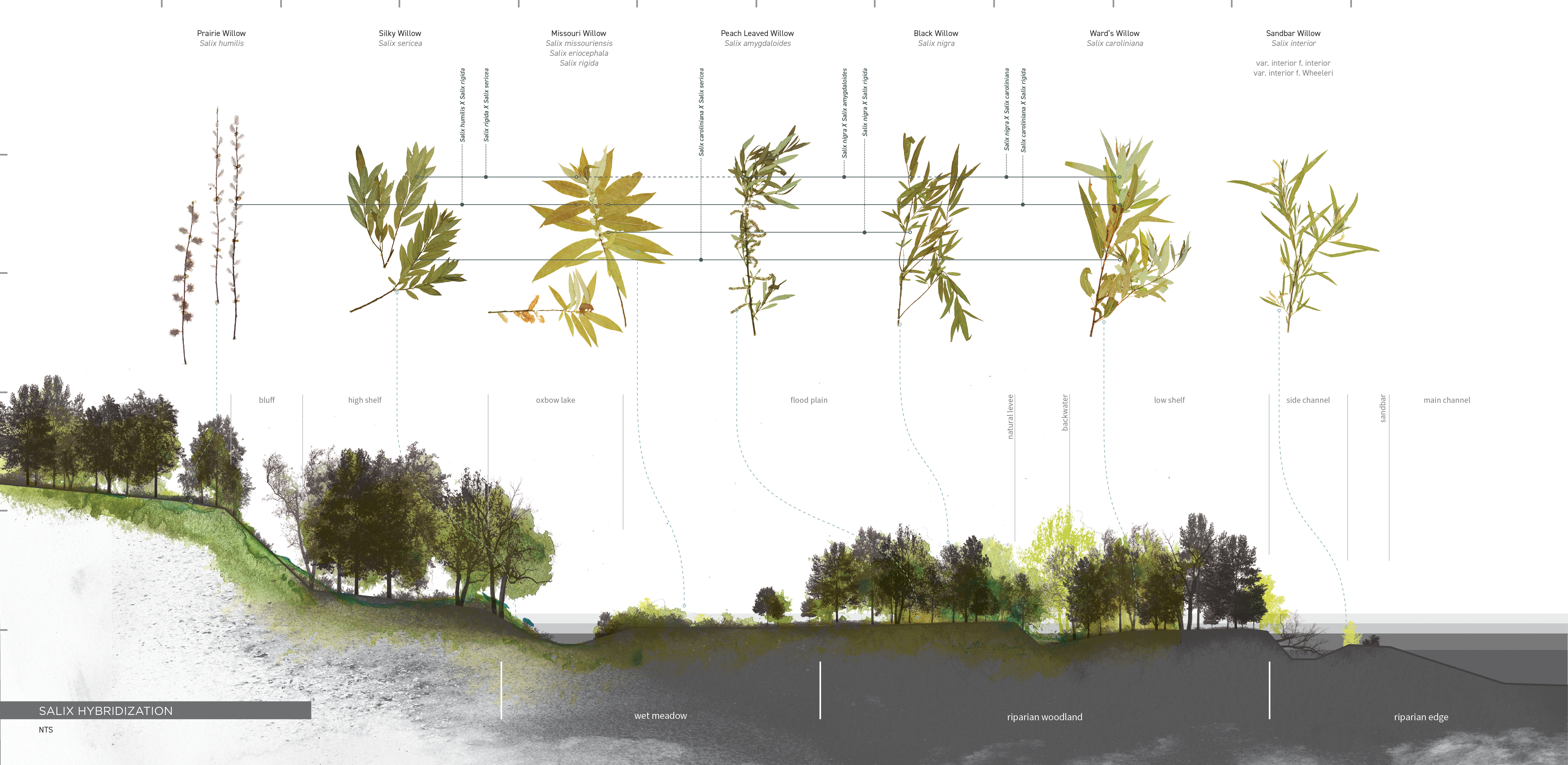 The Willow Resiliency Project proposes a biomass industry cooperative between rural communities and repatriated indigenous populations of the Lower Missouri River Valley. Hybridized program of production, research, and recreation expand the typology of rural public space and create opportunity for unconventional interactions between people, ecology, and place. The project calls for establishing an interspecies salix biomass crop within the river’s flood zone, and has integrated aspirations of ecological restoration, knowledge production, regional economic sustainability, and the advancement of social equity. When harvested and burned in a low-oxygen environment, willow cuttings are converted to biochar, a soil ameliorant that sequesters carbon, benefits agricultural crop yields and reduces irrigation demands in silt / sand soil profiles. In acknowledgment of the indigenous practice of utilizing fire for landscape management, the annual fire-rite festival marks the beginning of burn season and celebrates the interdependent nature of landscape and rural culture in the Missouri River Valley.