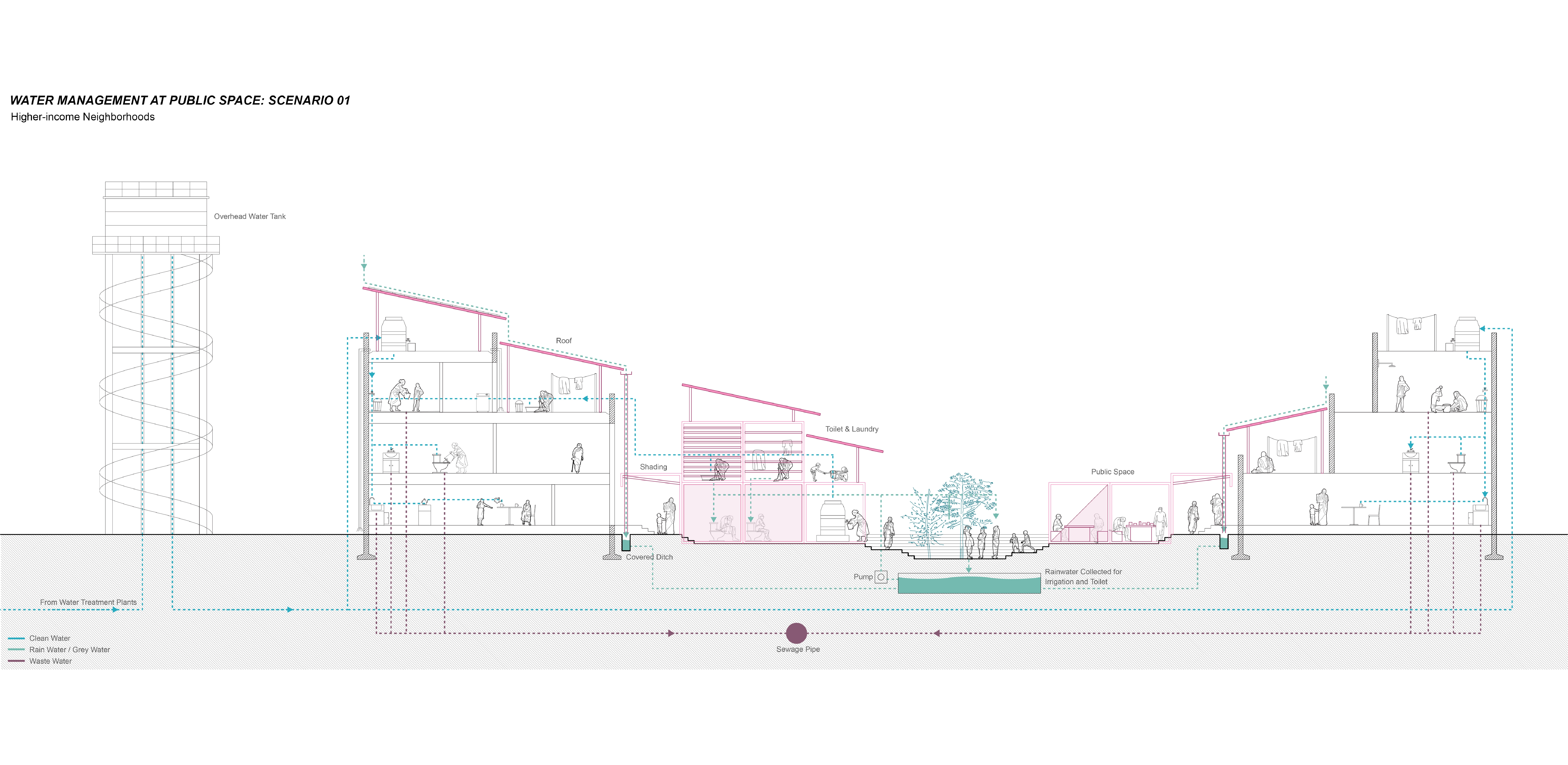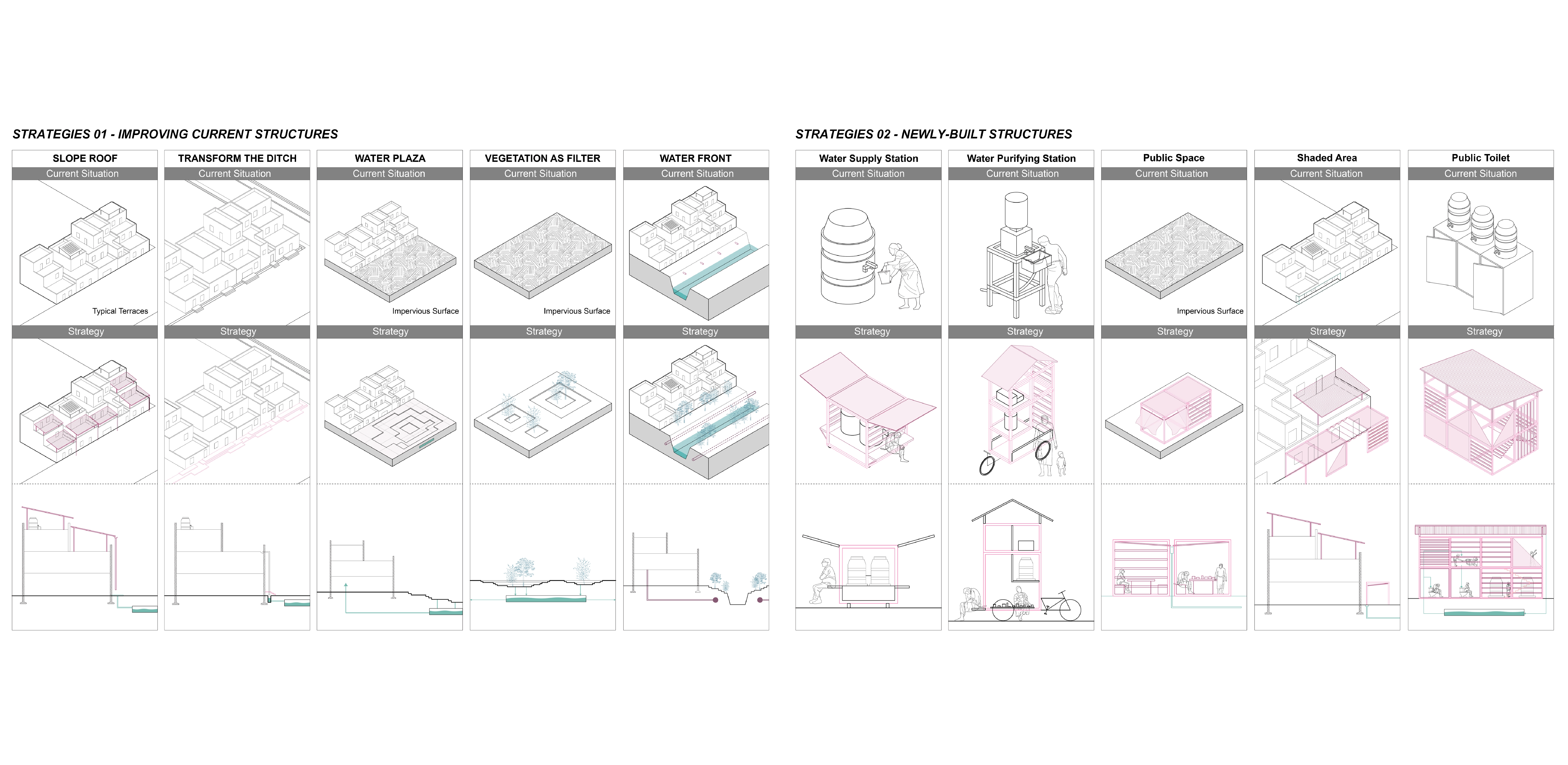 Then, a series of strategies for water management including improving current structures and building new structures are proposed, and these strategies could become a set of toolkits and prototypes that could be applied to multiple places. The whole water lifecycle - fresh water, domestic water use, waste water, and rainwater – are all considered. Prefabricated, light modular structures are inexpensive and easy to be installed at open spaces, and their dimensions are flexible according to different types of public spaces accommodating commercial and recreational activities. Potential programs of public spaces include shading area, market, handicraft studio, water supply station, water purifying station and public toilet, integrating daily activities with water use and sanitation management.