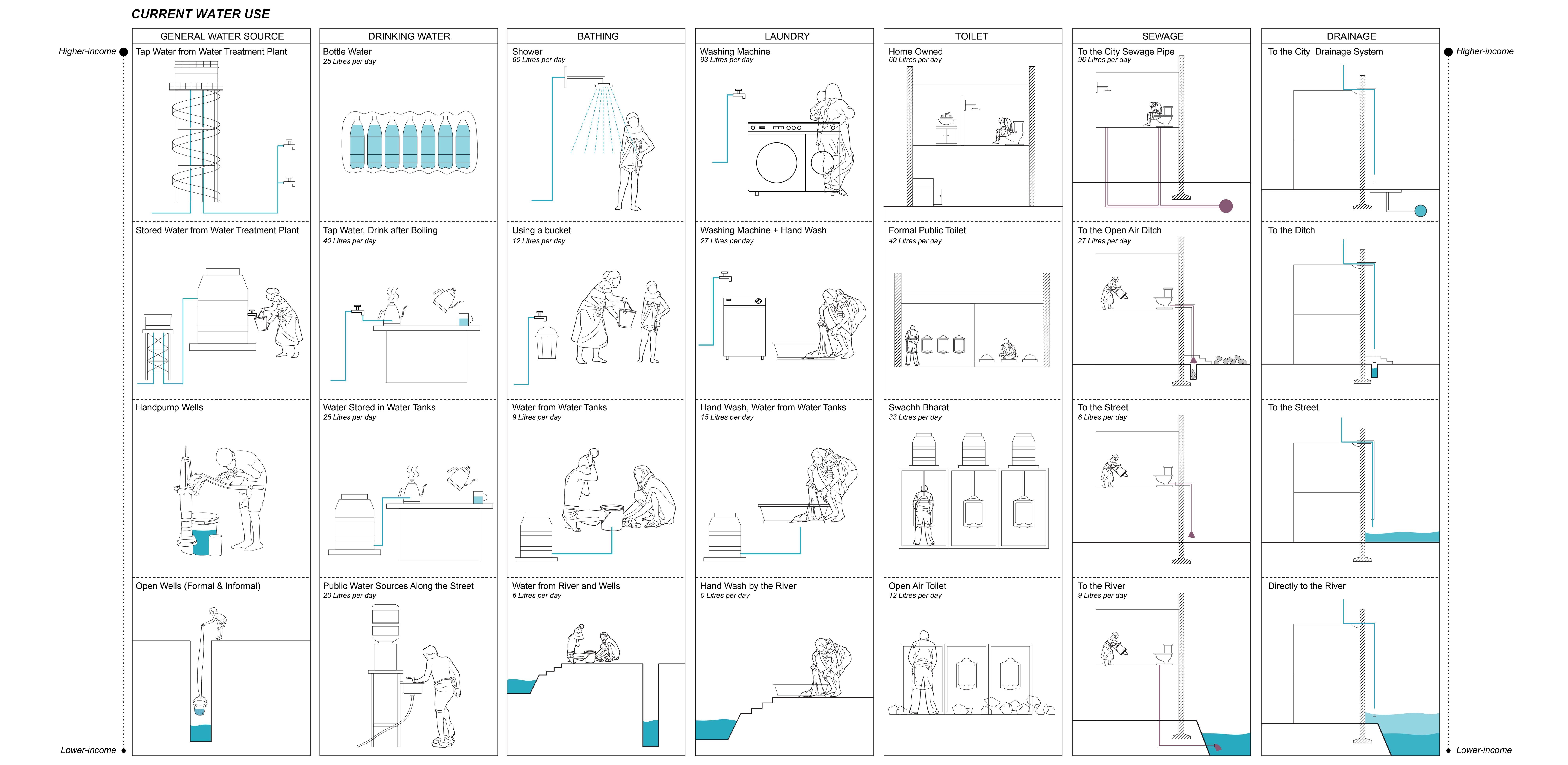 At the city scale, normally the fresh water comes from water treatment plant and goes to people’s homes, and then waste water goes to the sewage treatment plant. But there are also some informal water uses: many people cannot get treated water, so they have to obtain the unsafe water from water tanks on the streets, resulting in various diseases. Also, a lot of water is disposed directly into the river or even to the street without any treatment.