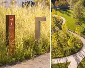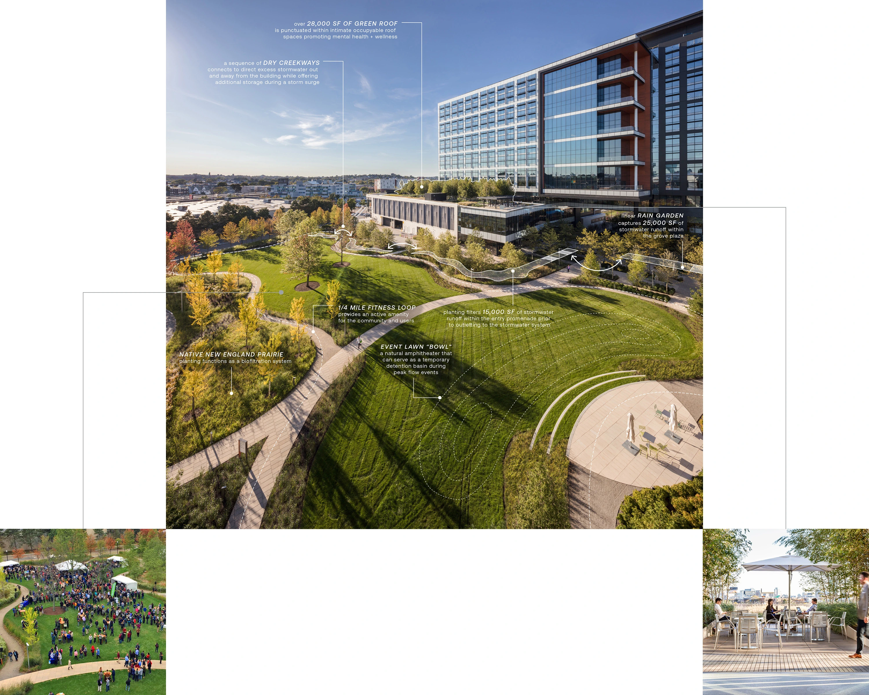 MassGeneral Brigham is the largest employer, hospital network, and physician’s organization in Massachusetts. The organization sought to consolidate its administrative operations into one location to better serve its subscribers and create a cohesive campus built on wellness and cooperation. The goal for the landscape architect was to provide a series of outdoor spaces that would scale with a new 850,000-SF building, and fuse the landscape with the transit and development influences that would continue to draw new residents and visitors to the district. The campus is located in Assembly Row, a 45-acre mixed-use transit-oriented development in Somerville, MA redeveloped by Federal Realty Investment Trust. Prior to redevelopment, the site was a Ford Motor Company assembly plant and one of the region’s strongest industrial employment centers. After the failure of Ford’s Edsel Division and the construction of nearby highways, the area fell into disrepair and saw little activity until the City of Somerville’s push for urban renewal. The client found the site attractive because it provided an array of amenities for its employees to live, work, and play. To the north, the site is adjacent to the high density, mixed-use residential complex of Assembly Square. To the east, the campus is adjacent to the Assembly Row T station and a shared use path to Boston, both encouraging commuters to use public transit or bipedal transportation. The campus’s direct connection to the train station allows the campus to act as an urban portal for visitors to flow through. Despite its highly programmed adjacencies, the site had many physical challenges. Its proximity to the Mystic River, the Boston Harbor, and the Amelia Earhart Dam subjected it to risks of sea level rise and strong onshore winds. The Northern Expressway and nearby train tracks generated significant amounts of noise pollution. Since the site was originally purposed for industrial use, the landscape architect also had to address existing brownfield conditions. These site challenges pushed sustainability and resiliency to the forefront of the landscape architect’s design priorities. The design team spent months studying NOAA data of the area’s tidal changes and sea level rise projections. In partnership with an environmental consultant, the team conducted noise, sun, and wind studies to inform the design. Significant soil and ground improvements had to be made, including the removal of 3.5 feet of contaminated soil off-site. To prevent fresh soil from settling, piles were drilled 60 to 80 feet into the bedrock and filled with compacted gravel. The entire site was then capped with fresh soil to appropriate elevations that would provide resiliency to the building from the potentials of sea level rise. The landscape architect addressed other site challenges by creatively incorporating functional and sustainable green infrastructure into the open spaces. The stormwater management system features a rain garden, detention ponds, and a large bioswale that overflows into a dry creek. Altogether, the stormwater infrastructure captures 100% of stormwater on-site. The thoughtfully conceived planting design places trees and plants in critical areas to mitigate wind and noise. A linear grove of trees located at the building’s entryway portal combat 17 mph winds from a funnel wind effect. Groves of trees line the site’s open perimeters to reduce nearby street and transit noise. Overall, the design created over 1.8 acres of permeable surface and added 333 trees that sequester approximately 40,000 pounds of carbon annually. The landscape architect made a conscious effort to design these sustainable elements attractively. The sustainable hardware features are visible in the design to enhance the overall aesthetic and character of the site, as well as encourage everyday guest interaction. The rain garden, outfitted with native coastal plants, prominently intersects the formal courtyard and the connecting path between the building and parking structure. The bioswale and dry creek are created with local New England stone, and its design transitions from a structured trough that mimics the revetment stone of the nearby Mystic River into a natural, winding creek shaded by River Birch. The large detention basins blend into the 2.5-acre event lawn and complement the space’s varying elevations. Even the custom benches are made from reclaimed wood, salvaged from the client’s Charlestown site and restored to expose their natural grain. Signage around the site accompany these sustainable features and educate guests on each element’s contribution to sustainability. The client’s commitment to sustainability was not only environmental, but also social. Much of the site’s open space and even the building’s conference center is open and free for public use. The ground floor of the building’s northern edge features retail space that parallels the Assembly Square development. To bring this public-private campus to life, the landscape architect performed a range of programming and spatial studies to develop the appropriate private, semi-private, and public amenities. The design had to consider to two very different guest experiences: the 4,500 employees who use the site daily and the visitors who pass through or live nearby. The design solution achieves this by contextualizing each space with the appropriate privacy level and its intended use. Private and semi-private courtyards are work-enabled spaces designed formally on an architectural grid to promote inside-outside connections with the building. In contrast, the streetscape, open event lawn, and fitness trail are outward facing, porous, and informal, designed to encourage visitors to wander and stay outdoors. The sinuous fitness trail loops around the lawn and guides guests on a journey through groves of Maple, Gingko and Redwood. The event lawn hosts company and community events throughout the yea
