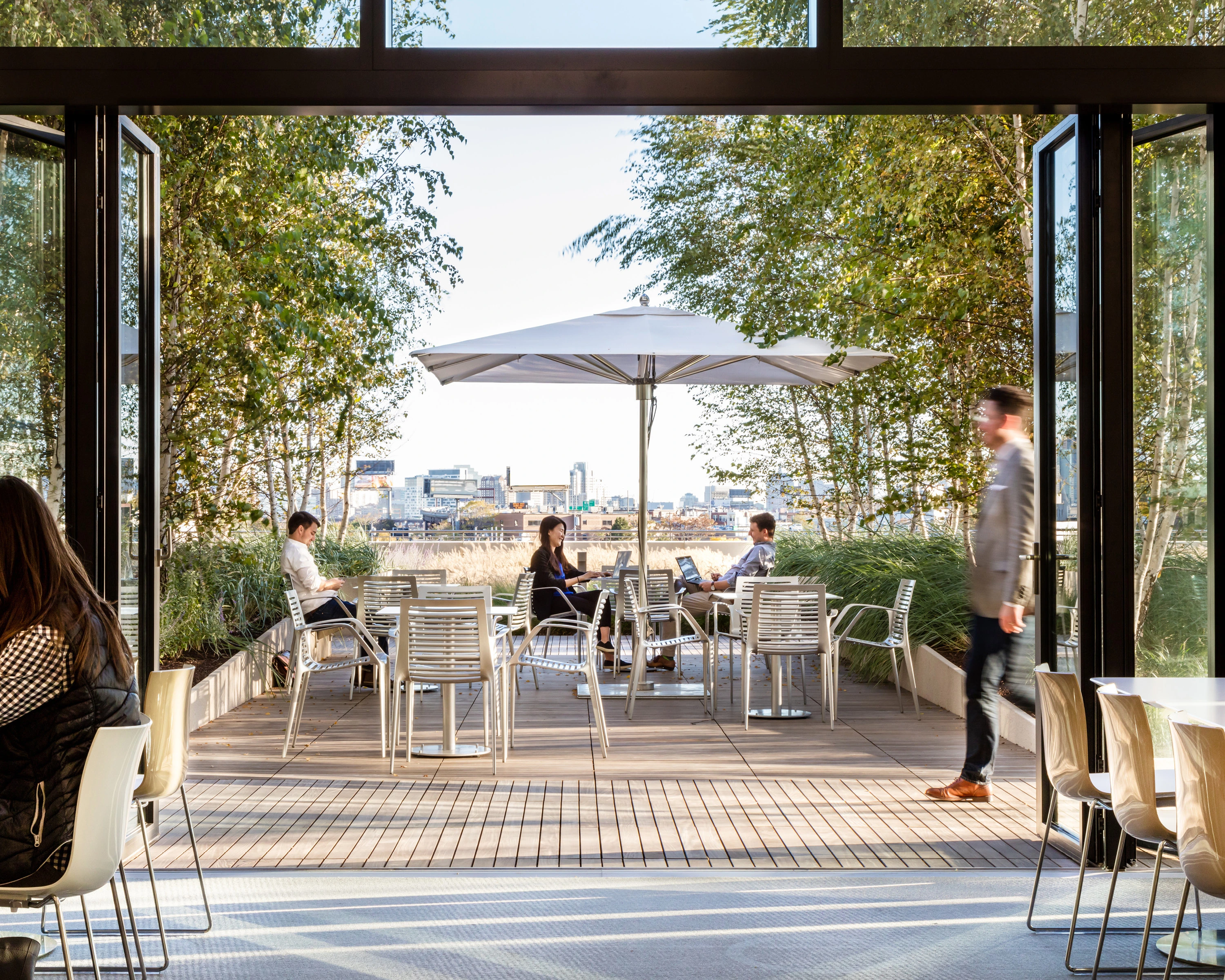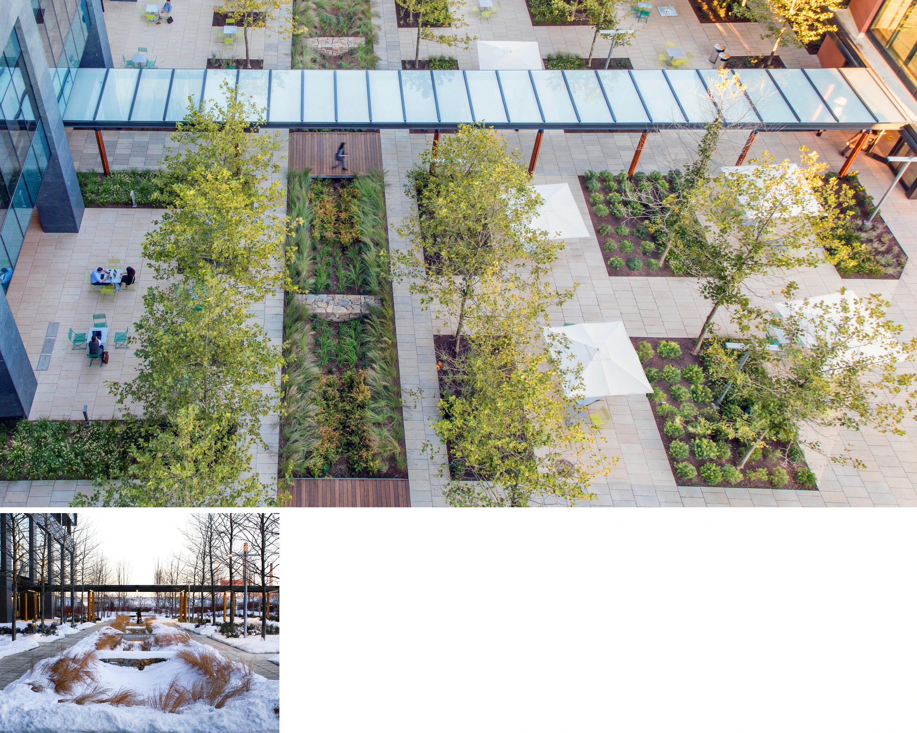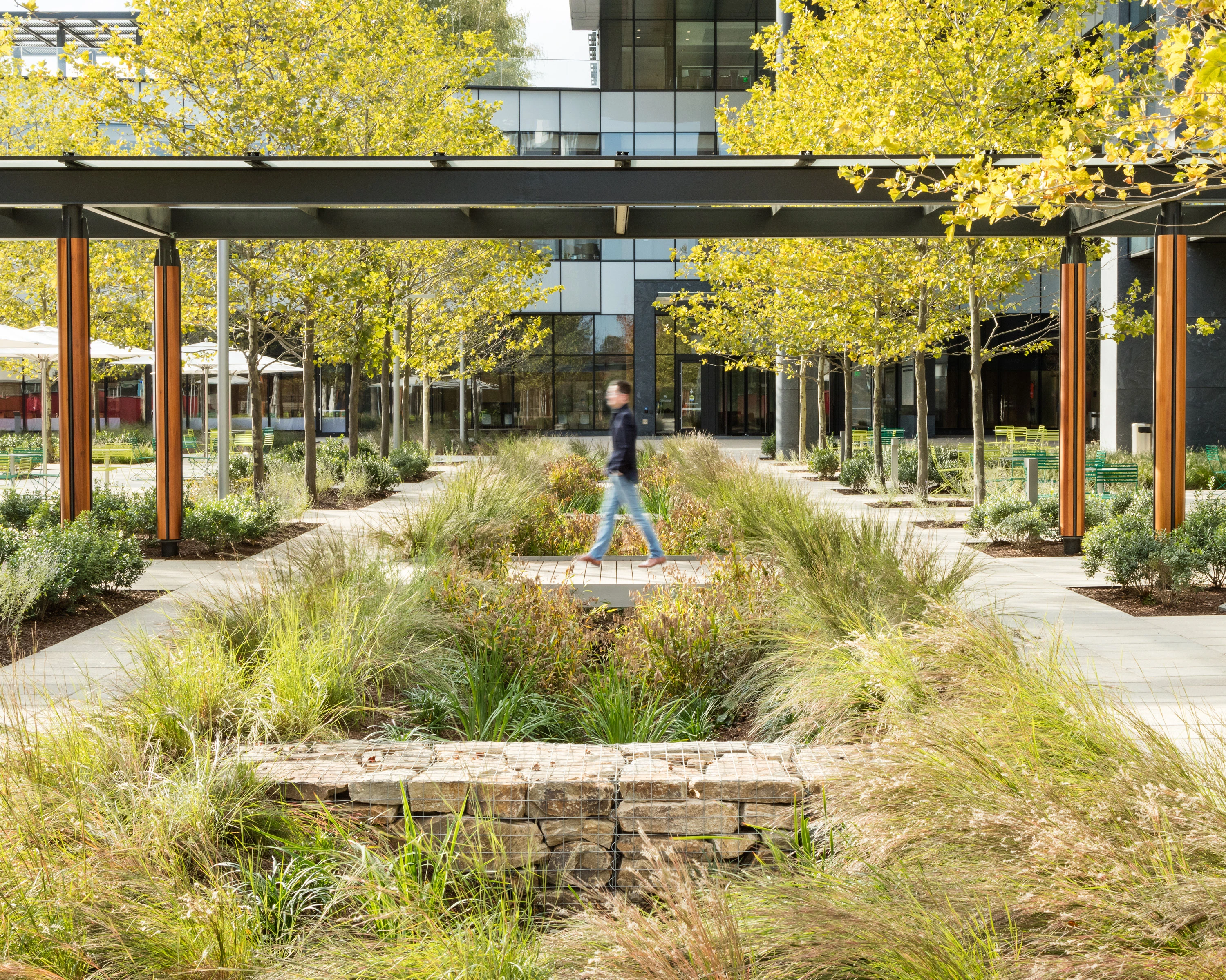 The construction of MassGeneral Brigham’s Administrative Campus, the region’s largest healthcare provider, provides a consolidated campus for the state’s largest employer, and an anchor in the burgeoning district of the city. The campus establishes a socially and ecologically sustainable locus within the 45-acre mixed-use transit-oriented development, Assembly Row. The former 9-acre brownfield site is reimagined as an open campus that serves the organization’s 4,500 employees and extends outward to welcome the growing mixed-use community within the district. The landscape architect made this unique arrangement possible by developing a range of formal to informal spaces, establishing an atmosphere of work, play, and community. Formal gridded courtyards facilitate clear indoor-outdoor connections that transform into winding paths and groves of trees that lead guests to a natural realm, all within the same campus. By using a combination of geometric and organic forms, native/adaptive plants, and local, sustainable building materials, the contemporary campus is at once a reflection of its New England context, as well as a new interpretation of a shared landscape experience.