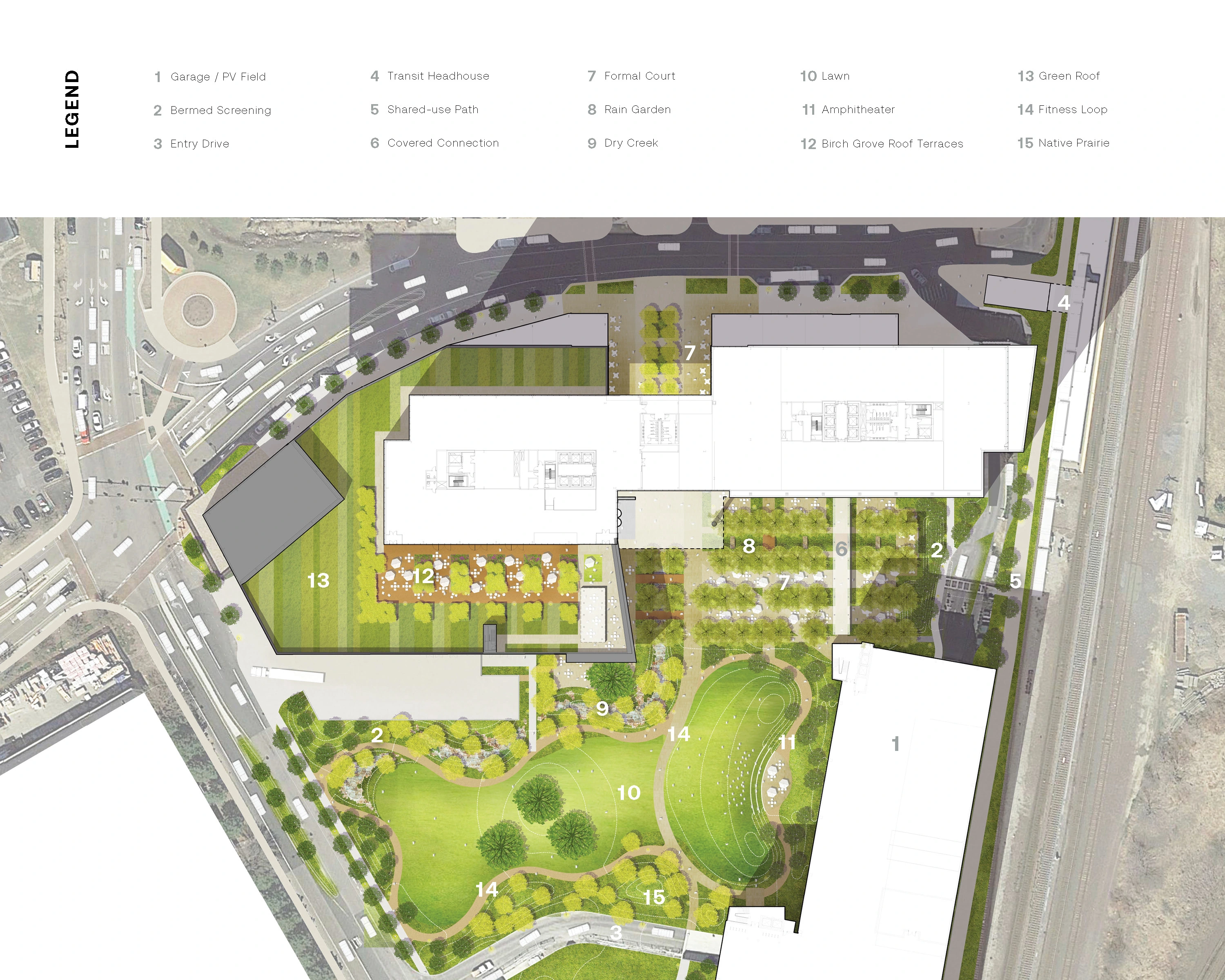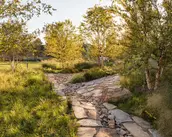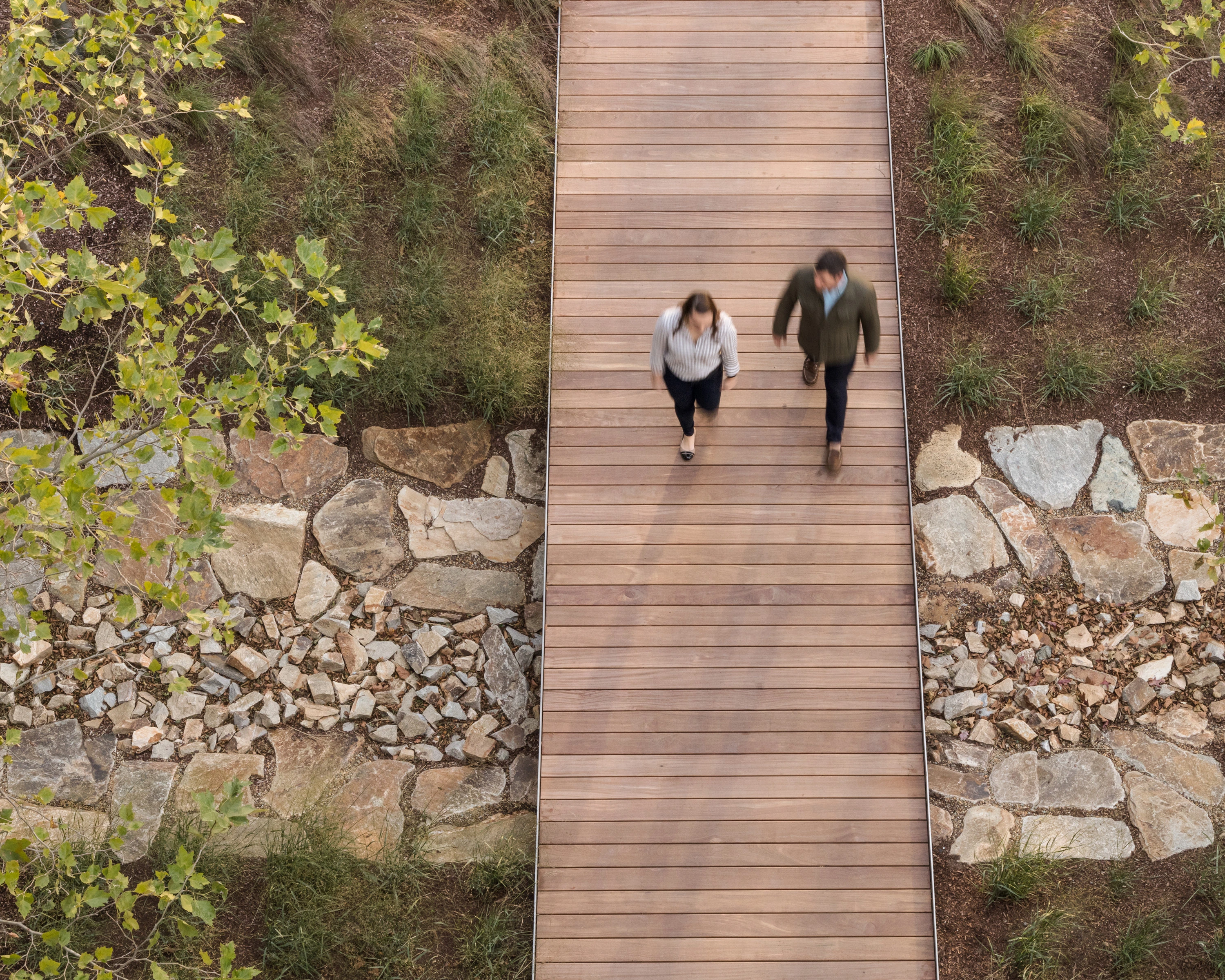 The design incorporates geometric and organic forms, native/adaptive plants, and local, sustainable building materials. Functional and sustainable green infrastructure includes a rain garden, detention ponds, and a large bioswale that overflows into a dry creek. Thoughtful placement of trees reduces street noise and the additional 333 trees sequester approximately 40,000 pounds of carbon annually. The jury called it a “truly remarkable articulation of space at numerous human scales with formal and informal geometries.”