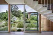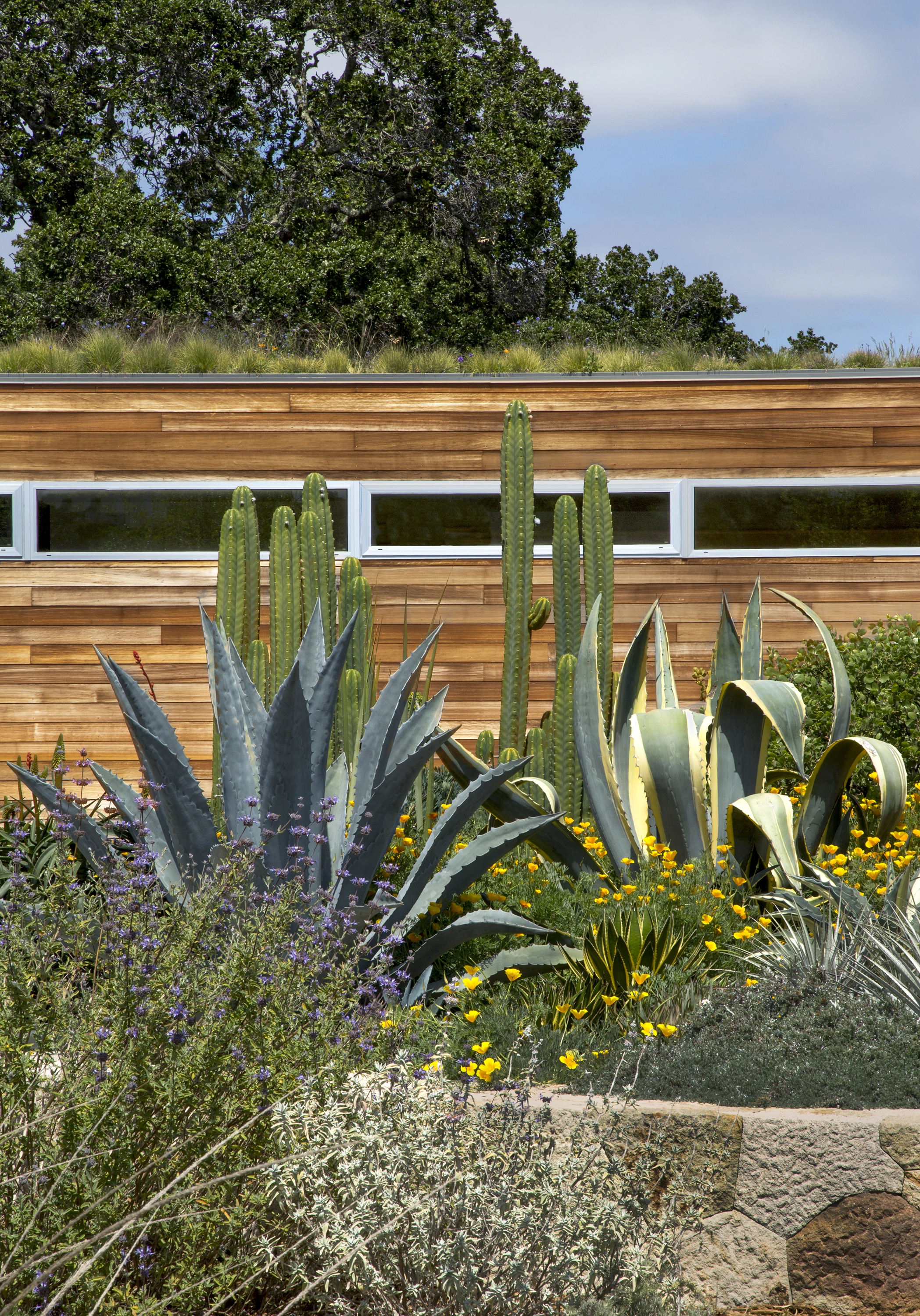 Reflecting the client's artistic interests, a sculptural planting bed of rough-hewn stone frames an extensive succulent collection in the central courtyard. An insulating roof garden of native grasses and wildflowers blends the shed-style architecture to the site. The jury called it a remarkable mix of conservation, design, and horticulture as a transition from meadows to woodlands.