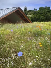 - Roof Grasses: Bouteloua gracilis 'Blonde Ambition'/Blue Grama, Festuca idahoensis ‘Siskiyou Blue’/‘Siskiyou Blue’ Idaho Fescue, Festuca mairei/ Atlas Fescue, Leersia monandra/ Bunch Cutgrass, Muhlenbergia dubia/ Pine Muhly, Nasella cernua/ Nodding Needlegrass, Poa colensoi/ Blue Tussock.