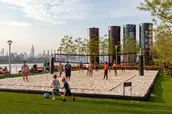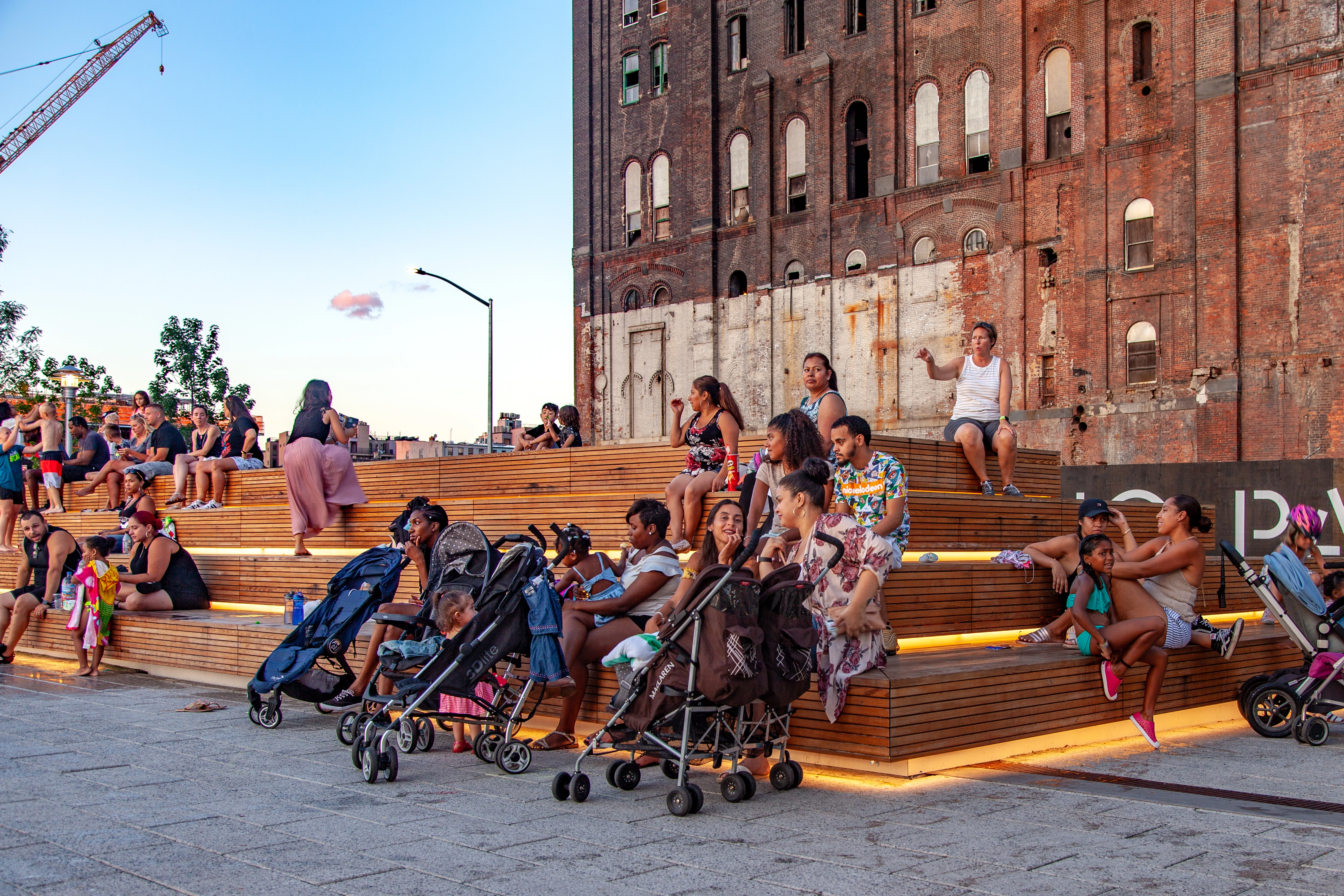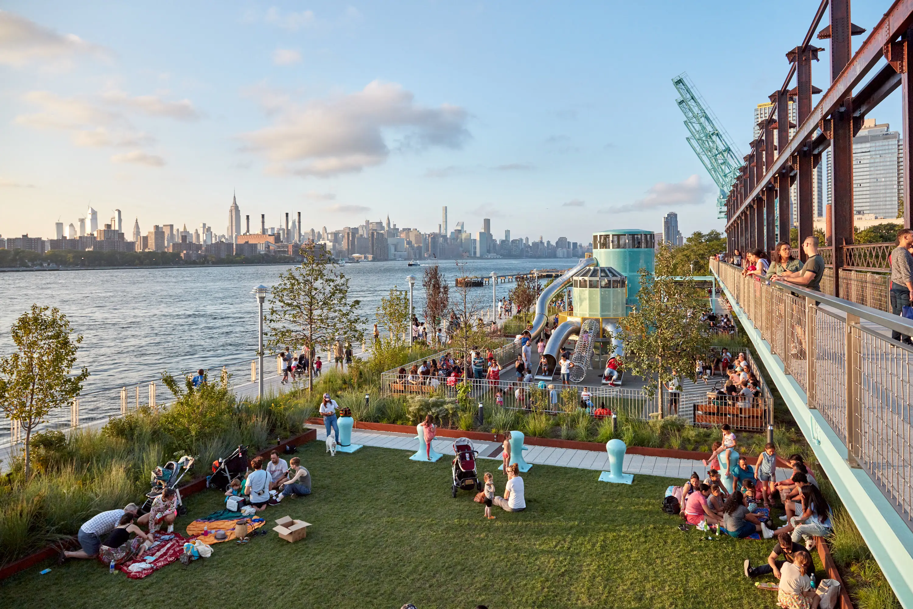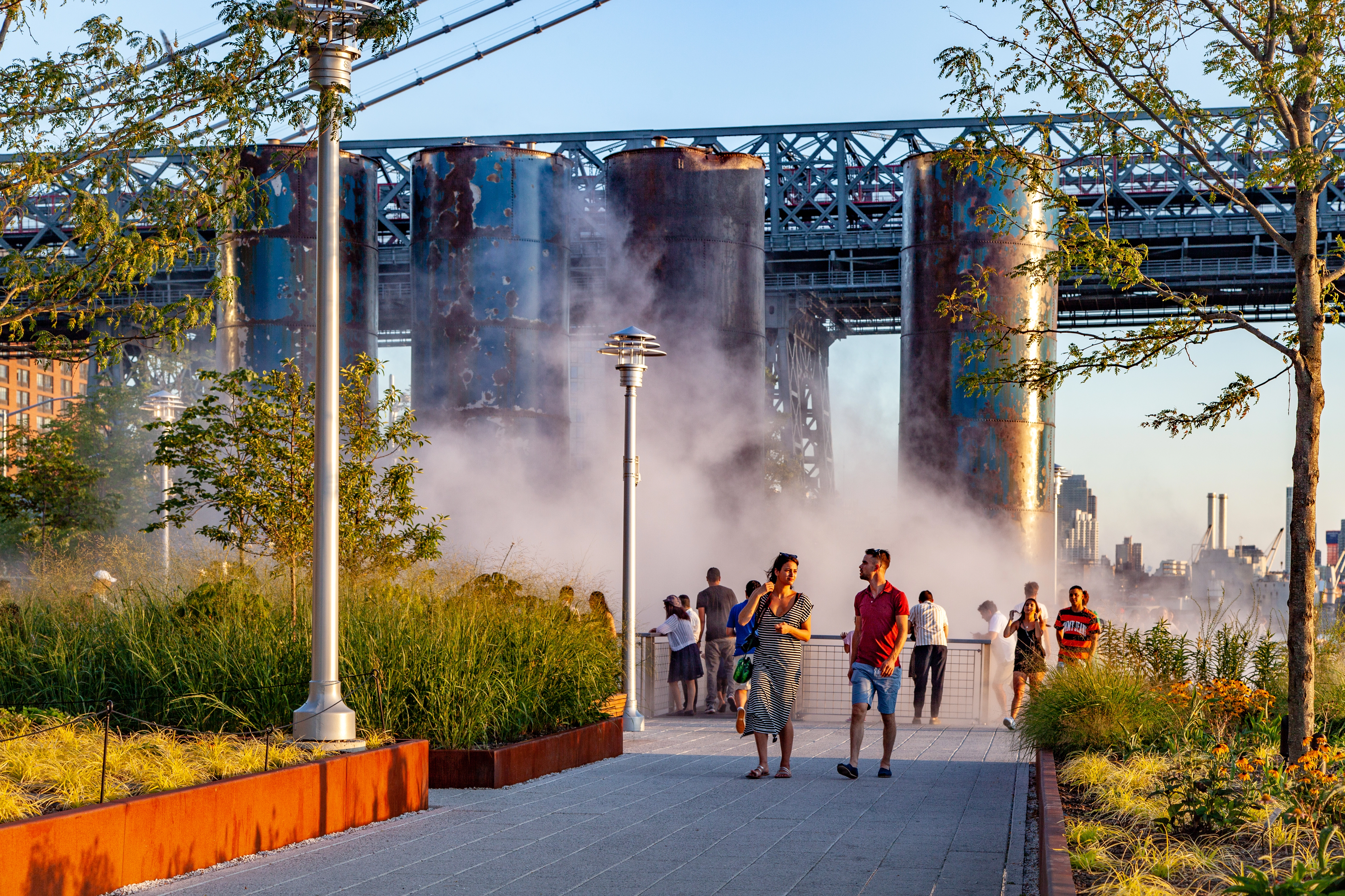 Domino Park is the first phase of the transformation of the former Domino Sugar Factory site into an ambitious mixed-use development project, sited within an area with one of the lowest ratios of open space to people. Inspired by community input and the site’s rich history, the 5-acre Domino Park reconnects Williamsburg to the East River for the first time in 160 years and provides much-needed open space for local residents while honoring its history as a working waterfront. The park integrates over 30 large-scale salvaged relics, including 21 original columns from the Raw Sugar Warehouse, gantry cranes, screw and bucket conveyors, and syrup tanks into an interpretive and educational “Artifact Walk.” Raised above FEMA flood elevations with many native plant species that reduce stormwater runoff, the park also functions as an absorbent sponge and first line of defense against sea level rise. Domino Park has seen over 4 million diverse visitors from nearby Latino, Hasidic, and Black communities and hosted hundreds of events and gatherings for local organizations.