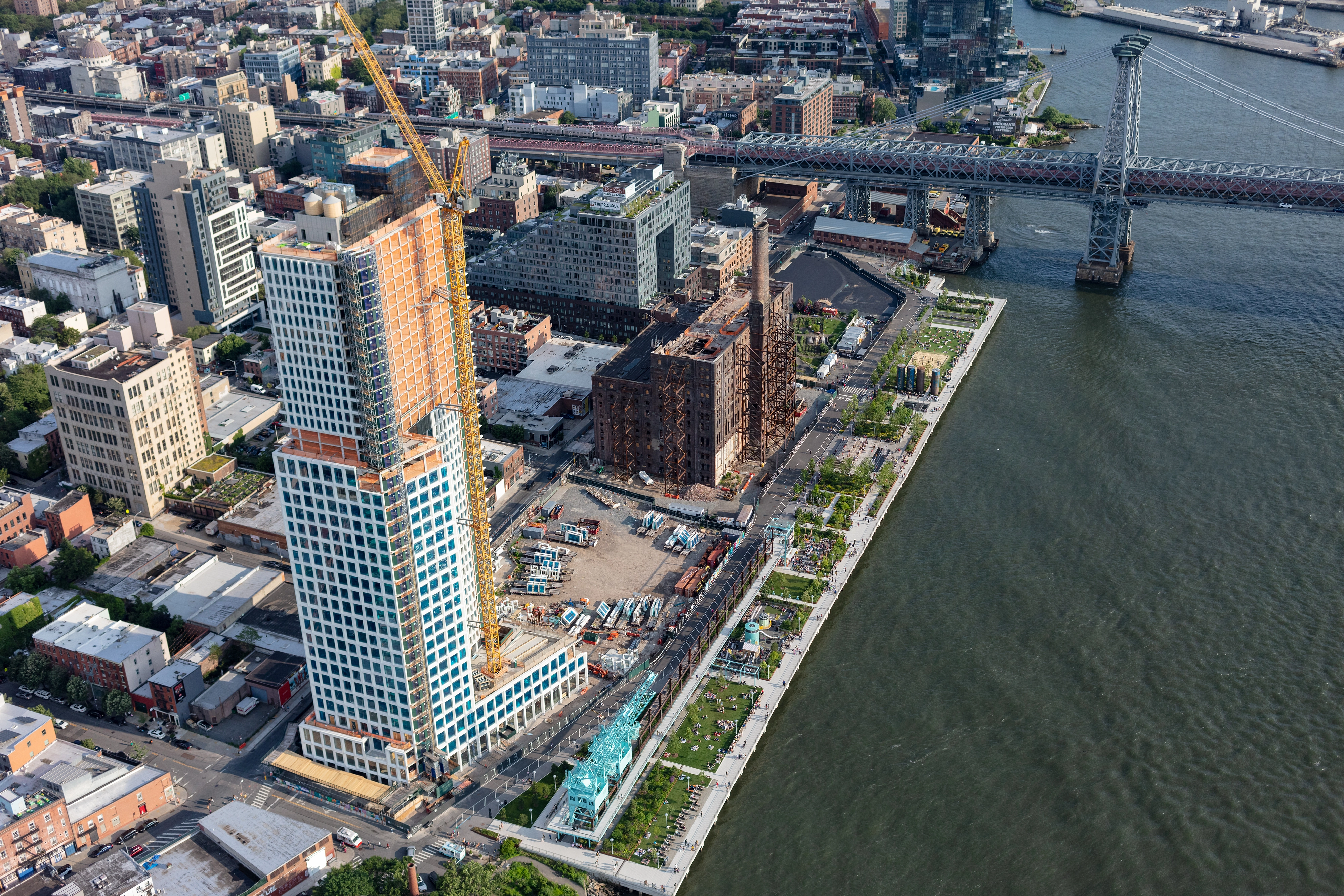 Industrial Legacy Domino Park is built on the former Domino Sugar Refinery, a site of incredible significance to the growth and development of the Williamsburg neighborhood and Brooklyn waterfront on the East River. It was once the largest and most productive sugar refinery in the world, producing up to 98% of the sugar consumed in the United States. Closing in 2004, the Refinery was the last major active industrial operation on Brooklyn’s once-bustling East River waterfront. Today, the park is a tribute to the story of this site and is dedicated to the diversity and resiliency of generations of Domino workers, their families, and their neighborhood. Domino Park was the first built portion of the 11-acre site’s transformation into an ambitious mixed-use development project, representing a commitment to deliver public space for the surrounding community. The park reconnects Williamsburg to the East River for the first time in 160 years and provides much-needed open space for local residents, while honoring its history as a working waterfront. Combining with upcoming Two Trees’ River Ring development, Domino Park creates an integral link for a fully connected waterfront of the future. The overall project includes adaptive reuse of the landmark Refinery building for creative office space and four new mixed-use residential buildings, including 700 units of affordable housing. Artifact Walk One of the primary park features is an interpretive and educational “Artifact Walk,” which integrates over 30 large-scale salvaged relics that showcase the inner workings of the sugar refining process. Restored artifacts include 80-foot-tall gantry cranes and a crane platform that once unloaded sugar; syrup tanks; bucket and screw conveyors; a hoist bridge; and 21 columns from the Raw Sugar Warehouse. A 2-block-long elevated walk reinvents the catwalk experience that was distinctive of the original factory complex and provides an up-close view of the artifacts, a unique perspective from above, and views of the Manhattan skyline. It is a nexus of old and new—a trace of the past and a new social balcony. As impressive and tactile pieces of history, the artifacts provoke a sense of wonder, discovery, and inquiry about the history of the site. Park Experience An important first move was the extension of River Street to reconnect the park back to the city grid and deepen a sense of publicness rather than a perception of a private front lawn for new development. The new street also significantly improves connections between the upland and the waterfront, eliminating the need for stairs and ramps and increasing the park’s accessibility. Domino Park offers a range of activities that appeal to a diverse user group, with spaces for visitors and locals alike to come together. Active uses are clustered in the south near the Williamsburg Bridge, where there is more noise and urban context, including a dog run, bocce courts, a flexible playing field, and volleyball court. The Refinery building, with its distinctive smokestack, represents the physical and spiritual heart of the redevelopment, with features that awaken a strong connection to water. A large tiered seating feature serves as a gathering place and vantage point to view a playful interactive water feature, one which transforms into an open plaza for public gatherings when the water is turned off. The Fog Bridge spans an open cut to the river below, revealing historic timber piles and allowing visitors to see the waves and hear the sound of the tides. A set of misters surrounding the bridge emit a gentle cloud of fog that envelops passersby in the shoreline’s wind patterns, creating a dramatic entryway to the massive Syrup Tanks. The northern part of the park is defined by the emblematic Gantry Cranes and Elevated Walk with a focus on more passive and family-oriented uses. An inventive playground designed by artist Mark Reigelman creates a fun journey through the site’s history for children. Tacocina offers a laid-back setting for tacos, beer, and cocktails enjoyed next to a large rolling lawn that provides a relaxing place to hang out and watch the sunset. The park’s materials are inspired by the tough, industrial character of the Williamsburg waterfront including weathered, galvanized, and stainless steel, concrete, and reclaimed wood from the factory itself. A custom furniture palette constructed from reclaimed pine and powder-coated steel includes a mix of tables, lounge chairs, and benches. Original metal finishes and patinas were preserved where possible. New steel was painted a turquoise “Domino blue” to match a color found throughout the original Refinery, along with relics that needed a new finish, such as the gantry cranes and mooring bollards. Resiliency The project started days after Hurricane Sandy and was greatly influenced by that event and subsequent discussions in NYC regarding resiliency. One of the first decisions was to set the buildings back beyond the required distance and raise the platform to be above predicted post-Sandy FEMA flood elevations. This resulted in a more generous park while protecting the buildings and infrastructure. 43% of the park is vegetated with nearly 175 new trees and a hardy native understory that reduce stormwater runoff and function as an absorbent sponge and first line of defense for the neighborhood. The park is one of the first projects to be certified under WEDG (Waterfront Edge Design Guidelines), an incentive-based ratings system to make waterfronts more resilient, environmentally healthy, accessible, and equitable for all. The park’s landscape is managed 100% organically, and plant material and debris from the park is composted and redistributed back into the plant beds. Building Community A robust grassroots community outreach effort complemented the official rezoning process, including large public forums as well as numerous small meetings with respected community groups and lea