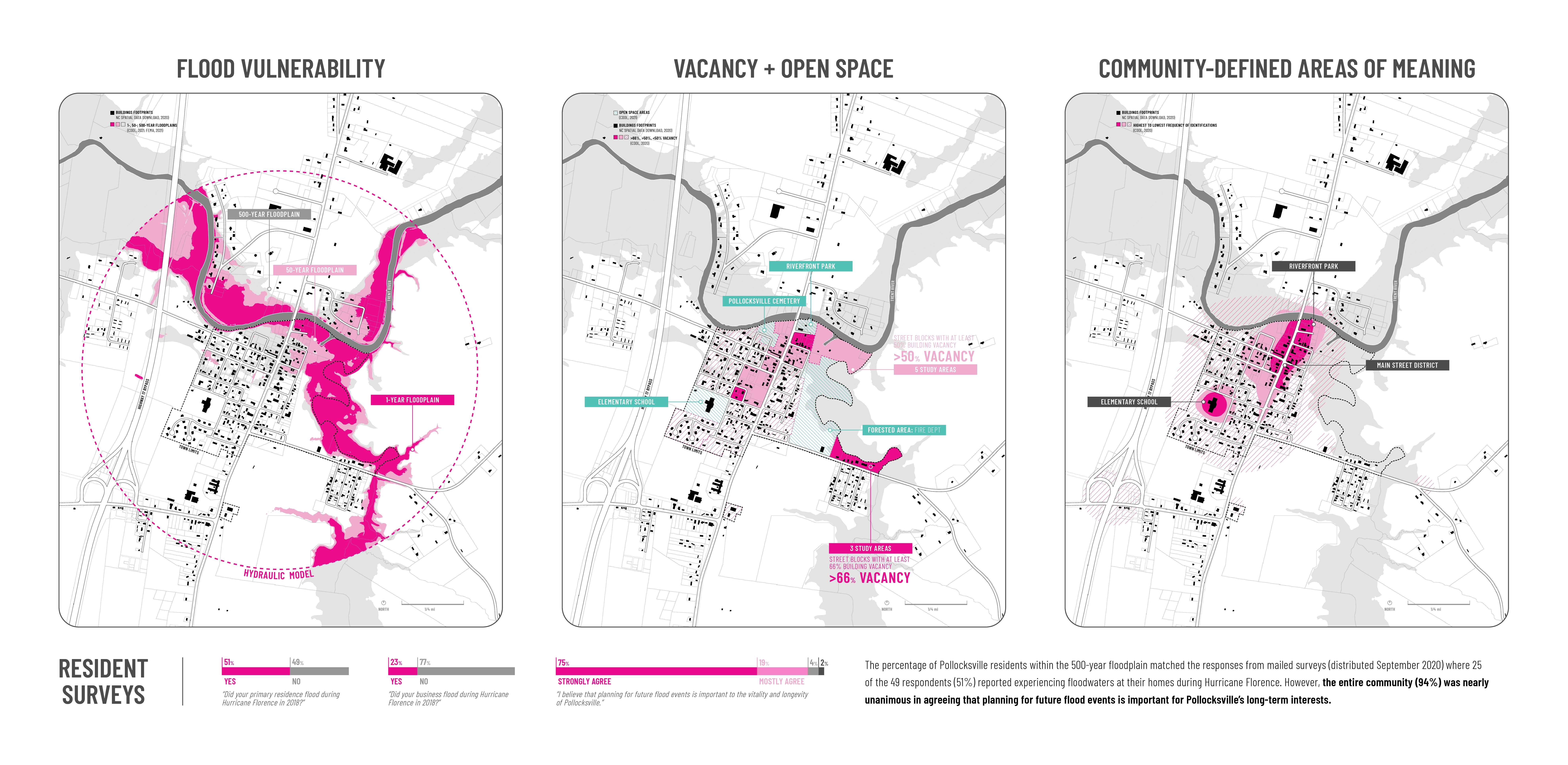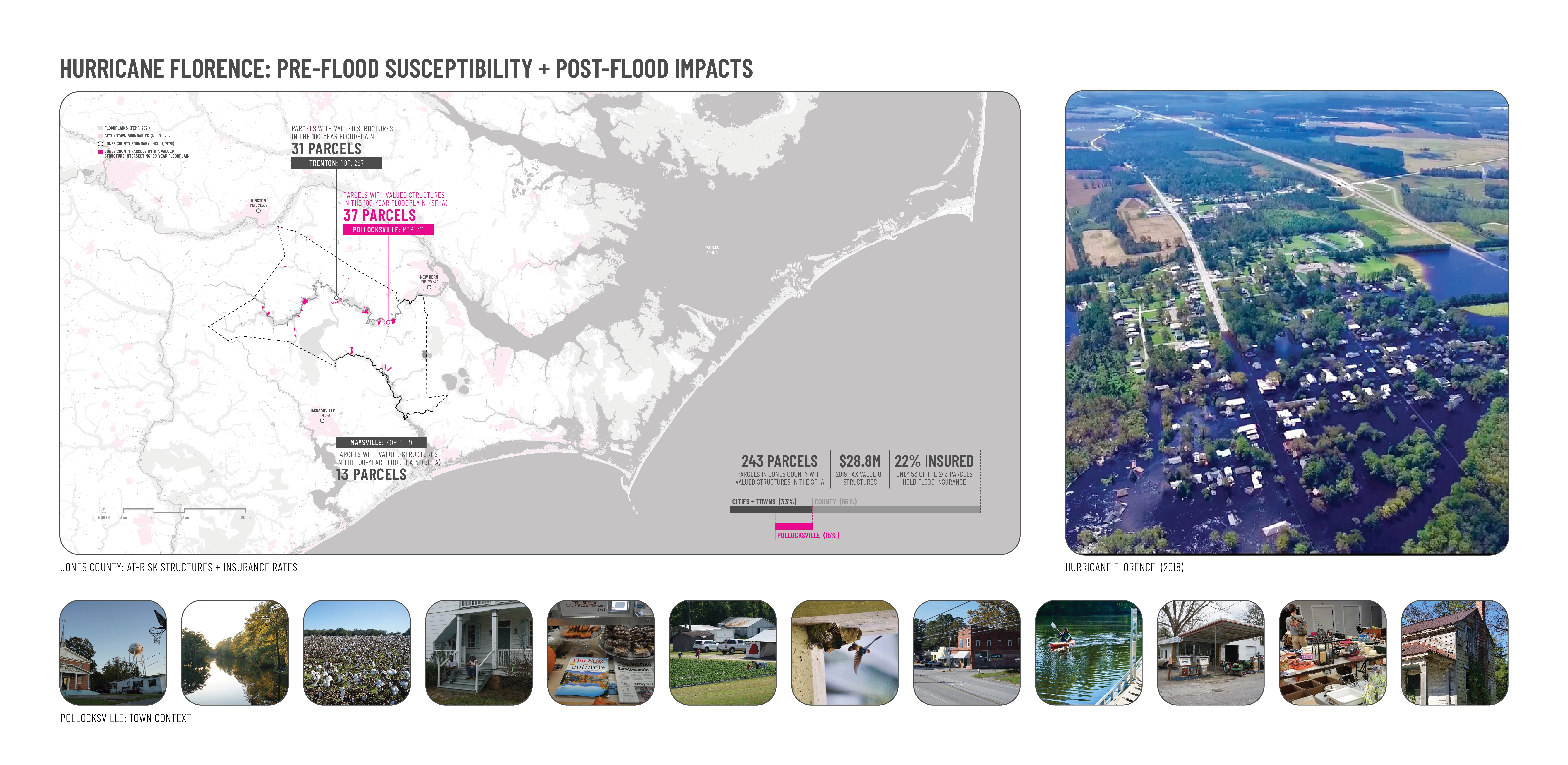 Overview: The Town of Pollocksville, North Carolina (population 216) is in the midst of a multi-year flood recovery process resulting from Hurricane Florence (2018). The rainfall generated by Florence was equivalent to a 1,000-year storm event, causing over $17B in monetary damages in North Carolina. In Pollocksville, the impacts of riverine flooding from the storm far exceeded the 500-year floodplain, inundating dozens of homes and nearly two-thirds of the town’s commercial properties. The Pollocksville Community Floodprint is bolstering community recovery efforts through an integrated portfolio of rebuilding projects. The project team led mixed-method participatory processes to co-produce the plan with the community. The rigorous planning and analysis undertaken by the project team continue to assist local leaders attract the financial resources needed to make Pollocksville a vibrant place to live and work while simultaneously increasing its resilience to future shocks. Context: The Town of Pollocksville is a small, rural community located on the banks of the Trent River in Jones County, North Carolina. Like other places across Eastern North Carolina, Pollocksville is deeply rooted in an agrarian past. The community maintains a direct connection to agricultural commodities including corn, soybean, cotton, and timberlands that adjoin much of the town’s periphery. Pollocksville is increasingly referred to as the “Gateway to Nature” due to its direct access to the Trent River, the Croatan National Forest, and classification as a Bird Sanctuary. In recent years, Pollocksville has leveraged its location through investments in its Riverfront Park, fishing pier, and kayak launch. These amenities, combined with the existing building stock in the Main Street commercial district and newly completed NC Highway 17 exit that accesses the town, afford Pollocksville a unique opportunity to rebuild in a way that increases its overall community resilience – social, economic, and environmental. Rural, Overburdened & Underserved: Often limited in the financial resources or technical capacity required to adequately recover from and plan for disasters, small towns across America are often left with few options for building back more resiliently. Specific to Eastern North Carolina, the long-term planning processes and infrastructure projects required for improved community resilience are seldom accessible. For citizens of Pollocksville, and more generally Jones County, the community faces a combination of demographic and environmental vulnerabilities that meet the U.S. Environmental Protection Agency criteria for both an “overburdened” and an “underserved” community. In the census tract that includes Pollocksville, the average per capita income is $22,183 (NC average: $30,783), the percent of the population age 65+ is 23.5% (NC average: 16.7%), and the percentage of the population who identify as People of Color is 40.5% (NC average: 29.4%). These figures: i) represent income, age, and race characteristics that are representative of a community with elevated social vulnerability risk factors; and ii) contribute to the inability of Pollocksville residents to attain the resources necessary to make the community more resilient to environmental stressors. As witnessed after Hurricane Florence, these vulnerabilities become active threats to life and property during and long after a natural disaster. Pollocksville and Jones County also face significant obstacles to financing the infrastructure projects needed to better prepare for weather extremes. Of the 80 counties classified by the NC Rural Center as having ‘rural’ population densities, 17 of them (including Jones County) share the dual characteristics of having: i) annual, per capita capital expenditure budgets that are less than the average for NC rural counties ($78.74/person/year); and ii) total budgets for annual capital expenditures that are not able to finance the local cost-share requirement (25%) of a single ‘resilient infrastructure’ project based on 2020 national average costs ($1,400,510.00, FEMA). Together, these data points suggest that without external financial support, communities in Jones County are both under-resourced compared to other rural counties in the state and lack the ability to self-fund capital improvement projects that may be necessary for community viability and sustainability. The Pollocksville Community Floodprint responds to these financial and technical challenges by strategically aligning community-identified values for resilience with potential funding sources that are external to local funding streams, and creating support materials that make Pollocksville more competitive to receive the external investments, grants, and resources it needs and deserves. Role of the Landscape Architect: As documented in Pollocksville and other rural communities, the overlap of vulnerable populations and heightened environmental risks imposes barriers to accessing the long-term technical support and financial resources needed to better prepare for future disasters. In response to these shortfalls, the project team – led by landscape architects – secured external grant funding to develop the Pollocksville Community Floodprint at no cost to the community. The project team led a mixed-method community engagement campaign. The project occurred during the height of the pandemic; engagement activities were hosted outside (with masks) and interactive sessions were designed to promote social distancing. Even with these challenges, the attendance for in-person activities included 30% of the town’s population. These efforts were further bolstered by mailed (included with monthly water bills) and online surveys. The project team also worked with town officials to assemble a Technical Advisory Committee that included representatives from state mitigation and emergency management agencies, local non-profits, and county fl