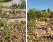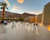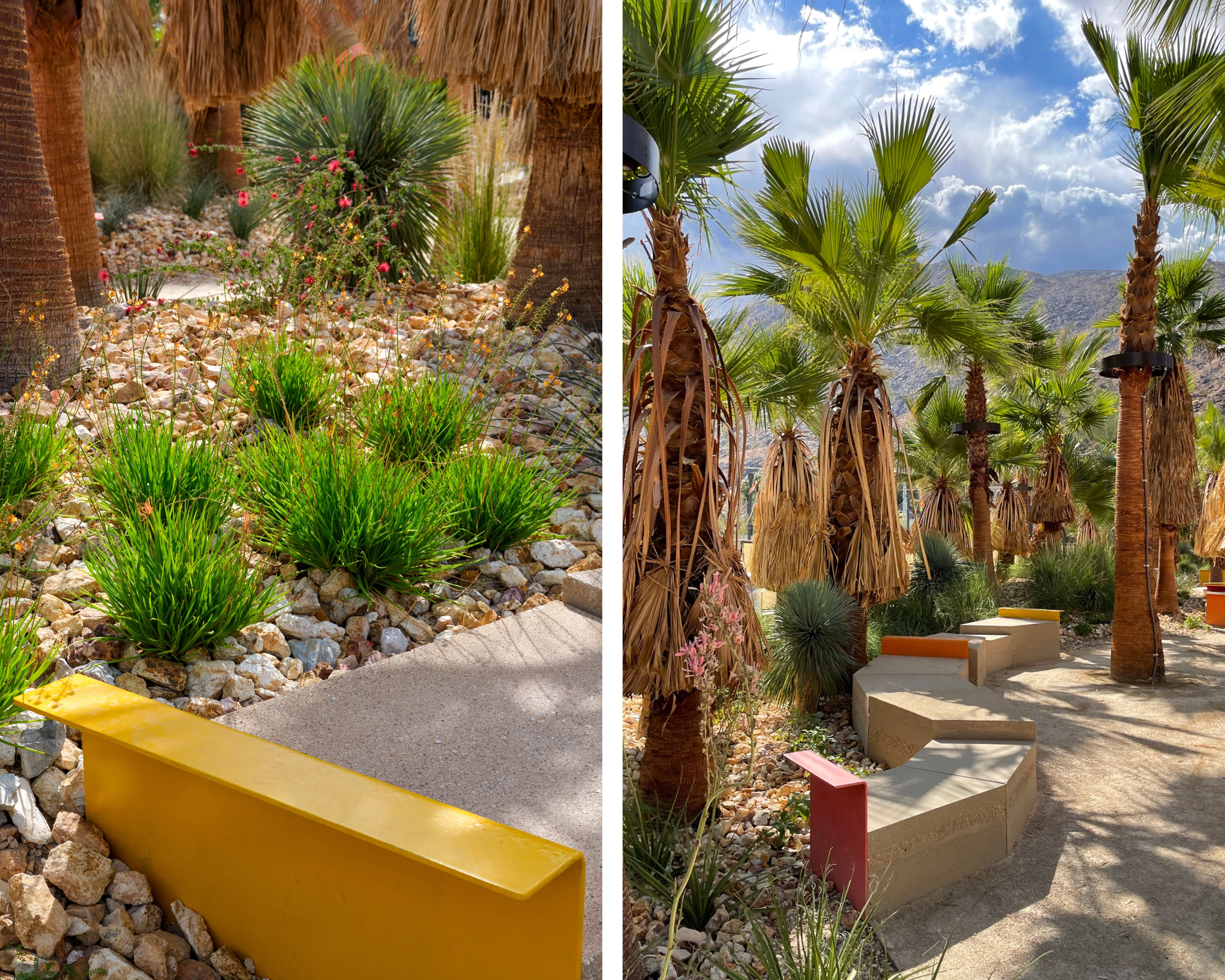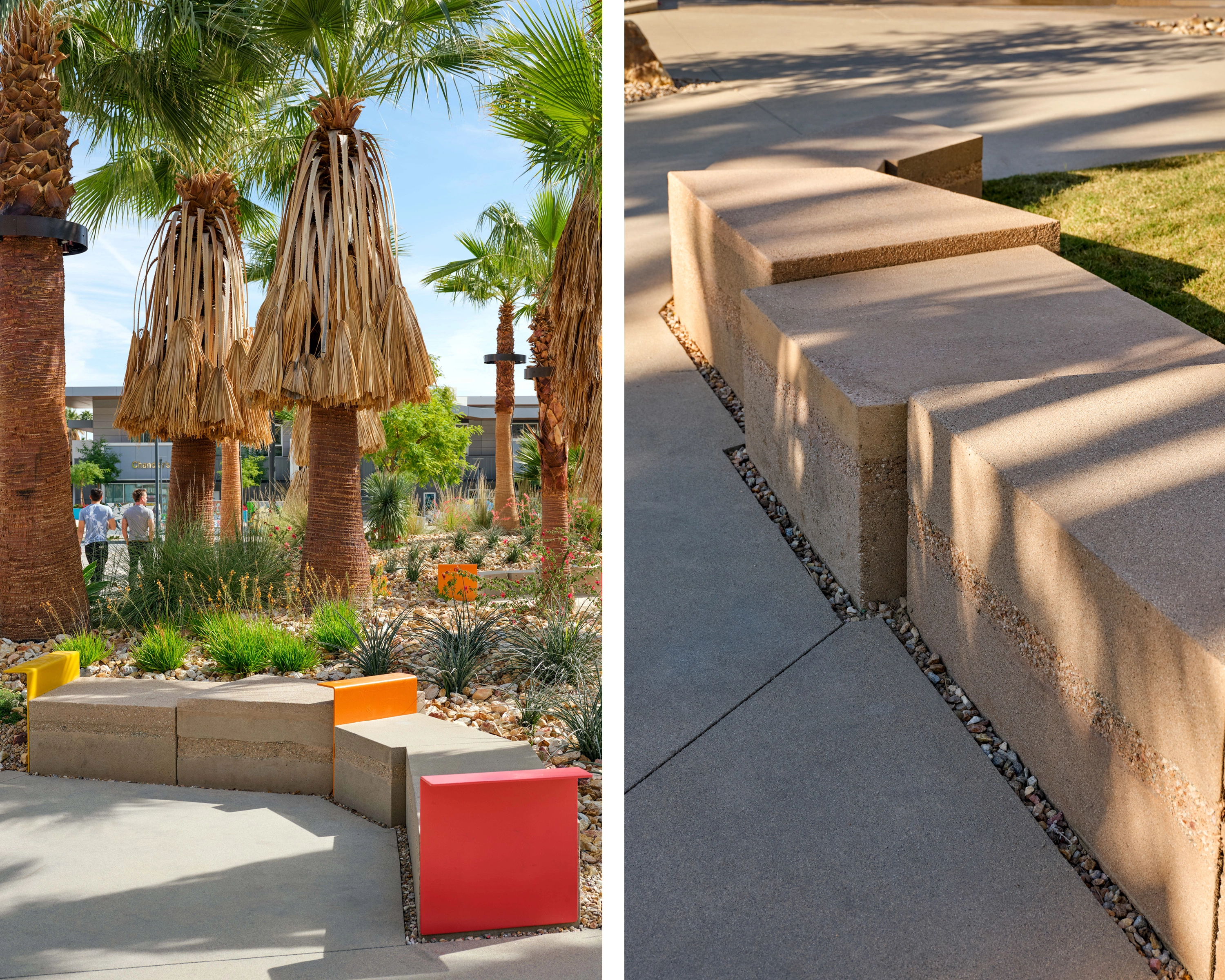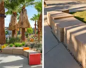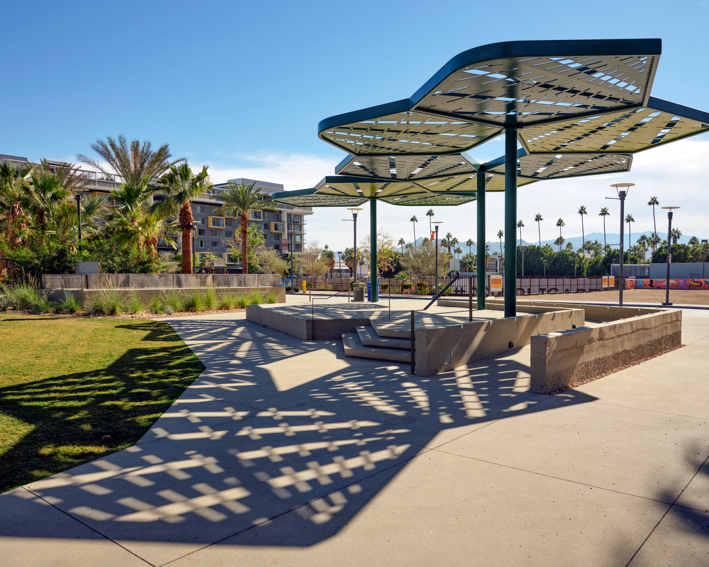 Palm Springs Downtown Park is an inviting 1.5-acre urban oasis for residents and visitors to Palm Springs, a design-forward desert destination nestled along the base of the San Jacinto Mountains along the southwestern boundary of the Coachella Valley in California's Sonoran Desert. The park lies in the ancestral homeland of the Agua Caliente band of the Cahuilla people who seasonally migrated between the shady palm groves and meltwater creeks of mountain canyons in summer and the hot springs and temperate climate of the valley floor in winter. The park is also located on the historic site of Nellie Coffman’s Desert Inn. An early booster of Palm Springs, Coffman stressed the space, stillness, solitude, and simplicity of Palm Springs. Nellie’s “four S’s” would inspire the park’s design, which amplifies the intrinsic qualities of this extraordinary place to immerse visitors in the multisensory beauty of the desert and celebrate Palm Springs’ legacy as a destination for health, nature, and pleasure seekers. The park is made up of three spaces: the Palm Grove, the Outcrop, and the Theater.