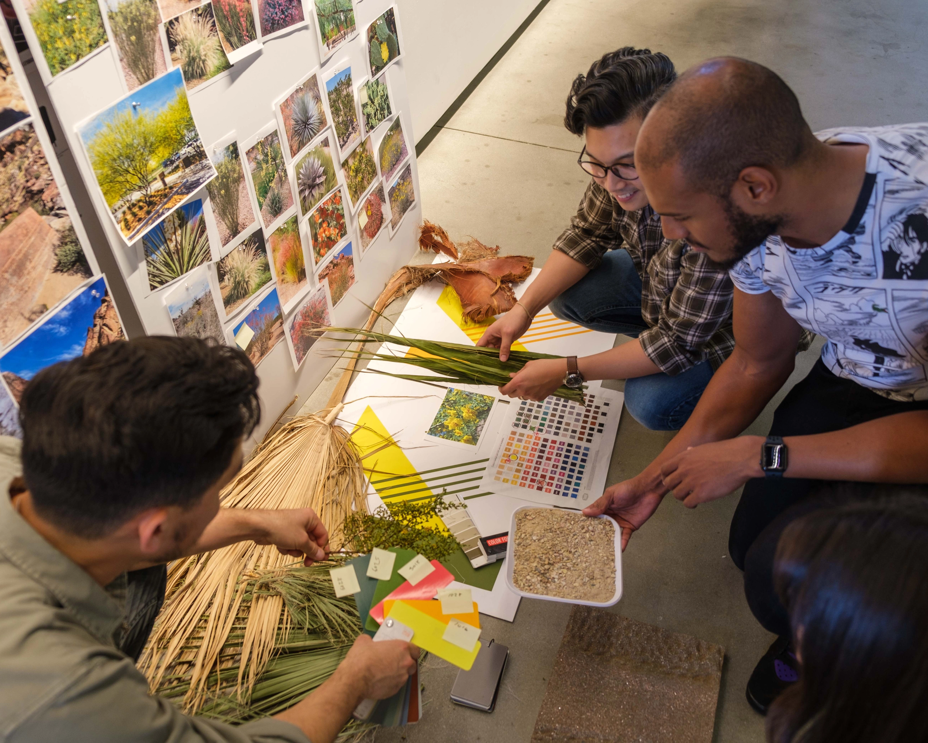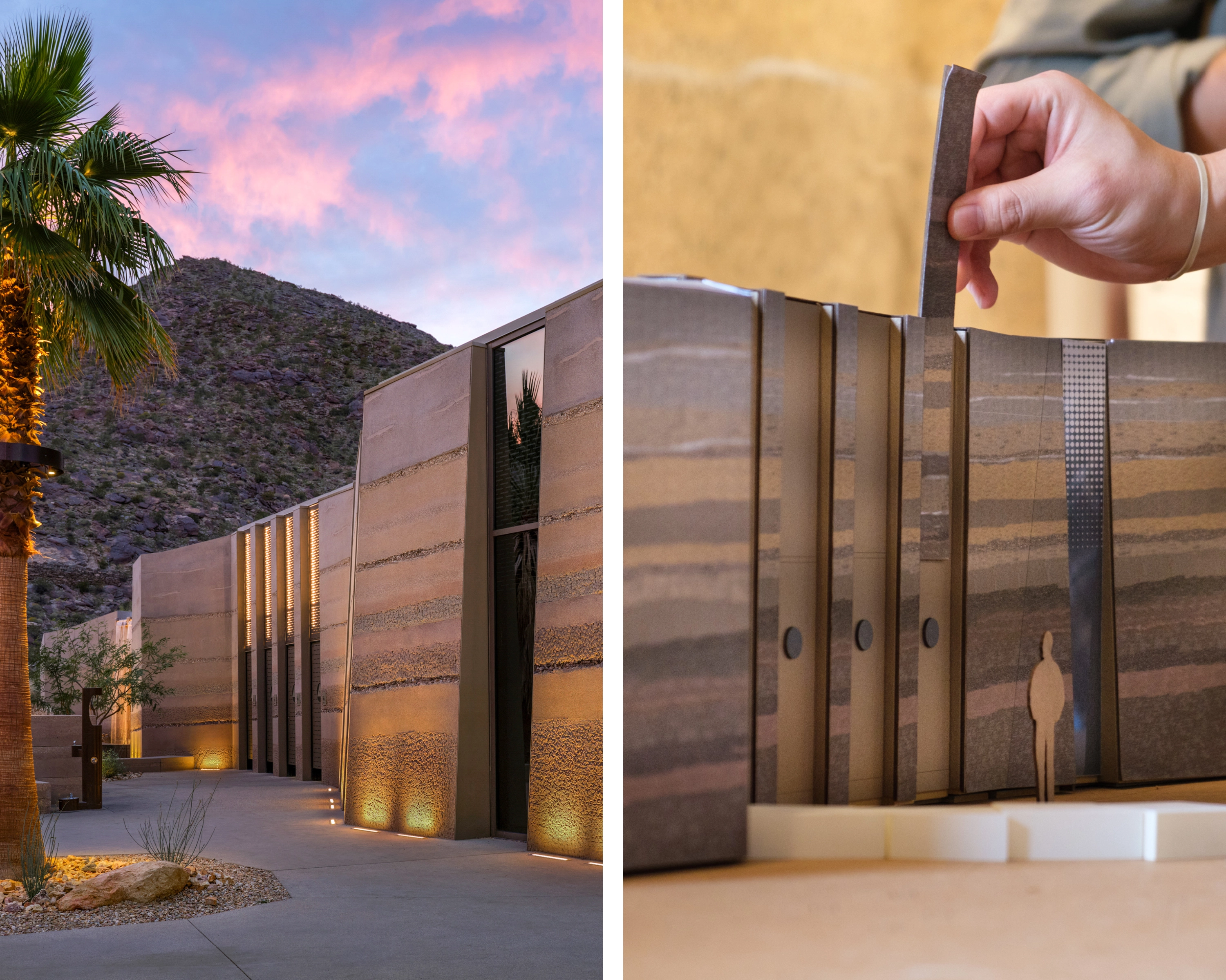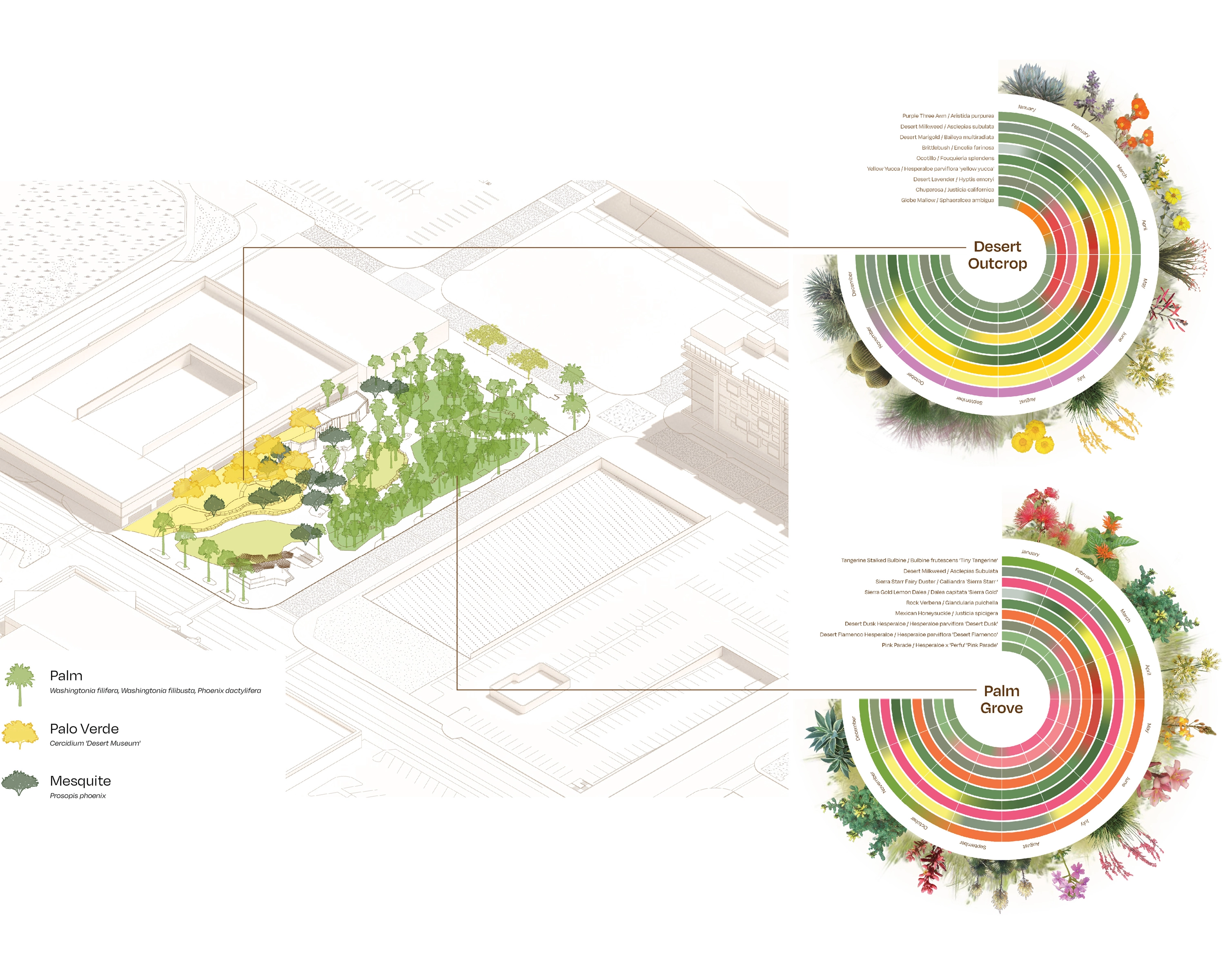Vision Palm Springs Downtown Park is an inviting 1.5-acre urban oasis for residents and visitors to Palm Springs, a design-forward desert destination nestled along the base of the San Jacinto Mountains along the southwestern boundary of the Coachella Valley in California’s Sonoran Desert. The park lies in the ancestral homeland of the Agua Caliente band of the Cahuilla people who seasonally migrated between the shady palm groves and meltwater creeks of mountain canyons in summer and the hot springs and temperate climate of the valley floor in winter. The park is also fortuitously located on the historic site of Nellie Coffman’s Desert Inn. An early booster of Palm Springs, Coffman stressed the space, stillness, solitude, and simplicity of Palm Springs. Nellie’s “four S’s” would inspire the park’s design, which amplifies the intrinsic qualities of this extraordinary place to immerse visitors in the multisensory beauty of the desert and celebrate Palm Springs’ legacy as a destination for health, nature, and pleasure seekers. The park is made up of three overlapping spaces: the Palm Grove, the Outcrop, and the Theater. Each offers distinct programmatic capacities and reveals facets of the region’s dynamic geology, distinctive vegetation, and rich history. The Palm Grove The densely planted Palm Grove satisfies the need to achieve thermal comfort in the extreme heat of summer days that can exceed 120 degrees. The tight arrangement of over 130 Washingtonia filifera, California’s only native palm, was inspired by team hikes to Palm Canyon on the Agua Caliente Reservation. The canyon’s sandy floor and continuous canopy formed a cooling cathedral that would significantly influence Downtown Park’s identity. The design team measured air temperatures inside and outside Palm Canyon and mapped the spacing of its palms, most of which retained their frond skirts except where a fire had burned them off and charred their trunks. Some had even been struck by lightning creating a sinuous trunk form known as a “snake palm”. For the park, palms of varying heights were selected for their unique and irregular forms and composed to create shady social eddies of varying sizes. 3D modeling of seasonal shade scenarios was used to ensure coverage throughout the year. Custom aluminum park furnishings stay cool to the touch and are left loose for users to “follow the shade” throughout the day. Visitors move them around to support morning coffee klatches, family picnics, or quiet reading. After dark, the grove is illuminated to glow like a lantern inviting park use into the cooler evening hours. The Outcrop The dramatic Outcrop rising along the park’s northern edge was initially conceived to obscure an adjacent parking garage to allow for an immersive park experience that relates to the surrounding mountains. Team hikes in Tahquitz Canyon offered an up-close experience of the colorful banded rock formations which offer such striking views from the valley floor. The team abstracted this geology into a custom “sedimentary” finish for shotcrete vertical walls and pre-cast concrete modular seat blocks that retain slopes and form gathering spaces in the park. The uplifted geologic layers of the Outcrop reflect the ombre of tones that make up the San Jacintos, reddish and rumpled sandstones along the base to desaturated and smooth granite along the top. Meandering trails rise with a landform at the east as the Outcrop becomes the backdrop for the park’s dramatic centerpiece, a powerful cascade inspired by Tahquitz Canyon’s iconic waterfalls. In front of the waterfall is an interactive water feature of jets and fog emitters that cools the heart of the park while bringing the magic of surrounding mountains into the urban core. The Outcrop’s westernmost extent contains park restrooms and a police substation fully integrated into the geologic structure. The Theater Park visitors flock to the shade of the Palm Grove and the relief of the Outcrop’s water features to beat the heat during the day, but at night as temperatures come down, the Theater comes to life. This space honors the cultural heritage of Palm Springs and the Coachella Valley, a world-class destination for the performing arts from the days of singing cowboys to contemporary music, dance, and film festivals. The Theater hosts an array of events from live performances, lectures, film nights, and music festivals taking place on an elevated stage with a capacity of over 1000 on the event lawn and amphitheater seat blocks stepping up into the Outcrop. The stage is framed by a palm frond-inspired shade canopy and has a dramatic backdrop of the Palm Springs Art Museum and the San Jacinto Mountains. Materiality The materials and the plantings in the park are rooted in the character and natural history of Palm Springs. Local ‘Palm Springs Gold’ stone was sourced from a quarry 10 miles away and used as boulders, cobble mulch, concrete topcast, and decomposed granite to complement the hues and tones of the surrounding mountains. Climate-appropriate native and regional desert plantings were specified to provide ecological habitat, attract native pollinators such as monarch butterflies and hummingbirds, and showcase the biodiversity of the desert. Mesquite and Palo verde trees provide shade and anchor a more arid and sculptural palette of ocotillo, agave, and barrel cactus on the Outcrop. Hesperaloe, bulbine, and desert milkweed are among the more colorful species in the Palm Grove planting areas, which also contain a series of rain gardens receiving and filtering all stormwater from the park. Armrests on the seat blocks increase accessibility while offering pops of vibrant color sampled from the blooms of surrounding flora.