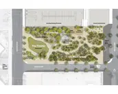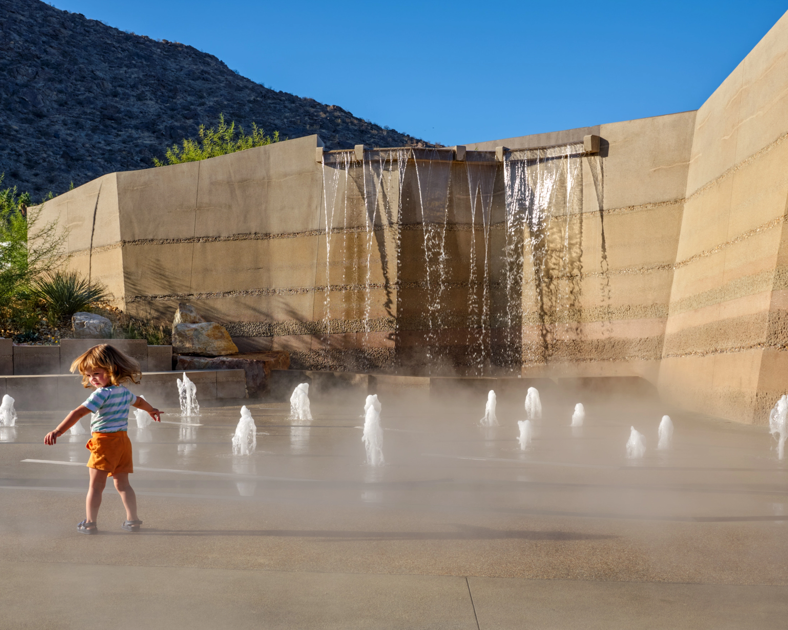 Sited on the grounds of the historic sanitorium resort, the Desert Inn, the design draws on its legacy as a destination for health, nature, and pleasure seekers. The park comprises three overlapping spaces: the Palm Grove, with over 130 Washingtonia filifera, California’s only native palm; the Outcrop, on the park’s northern edge designed as an immersive park experience that relates to the surrounding mountains; and the Theater. Each offers distinct programmatic capacities and reveals facets of the region’s geology, vegetation, and rich history. The park’s dramatic centerpiece is a powerful waterfall and an interactive water feature of jets and fog emitters, which the jury called remarkable!