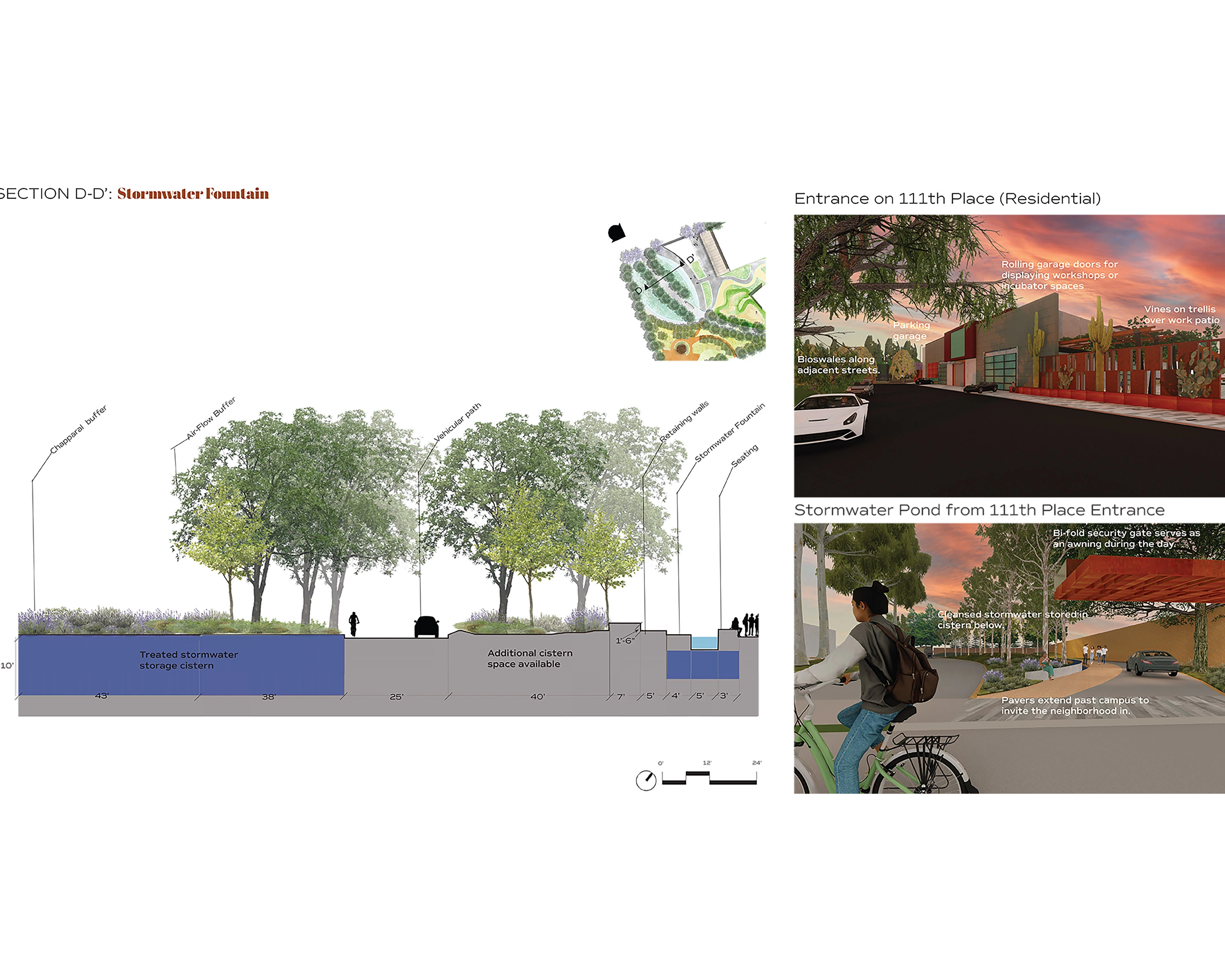 The soil of the Lanzit Site has been remediated yet a groundwater contamination plume with an undetermined spread still remains. Ongoing pollution from the nearby junkyard railroad and locally-owned auto shops on the edge of Compton Creek are also potential point pollution sources, according to The Lanzit Sites 23021 Semi-Annual Groundwater Monitoring Report. The Stormwater Center of Excellence would include a closed-loop, holistic watershed plan to intertwine stormwater capture within the local watershed, phytoremediation at the edges of the auto businesses and railroad, and water reuse in the landscape. The site offers a space for the university partners of the Better Watts Initiative to collaborate with the community in the research and development of groundwater and stormwater treatment. The phytoremediation chain also visibly demonstrates the cleansing process and defines the campus circulation system.