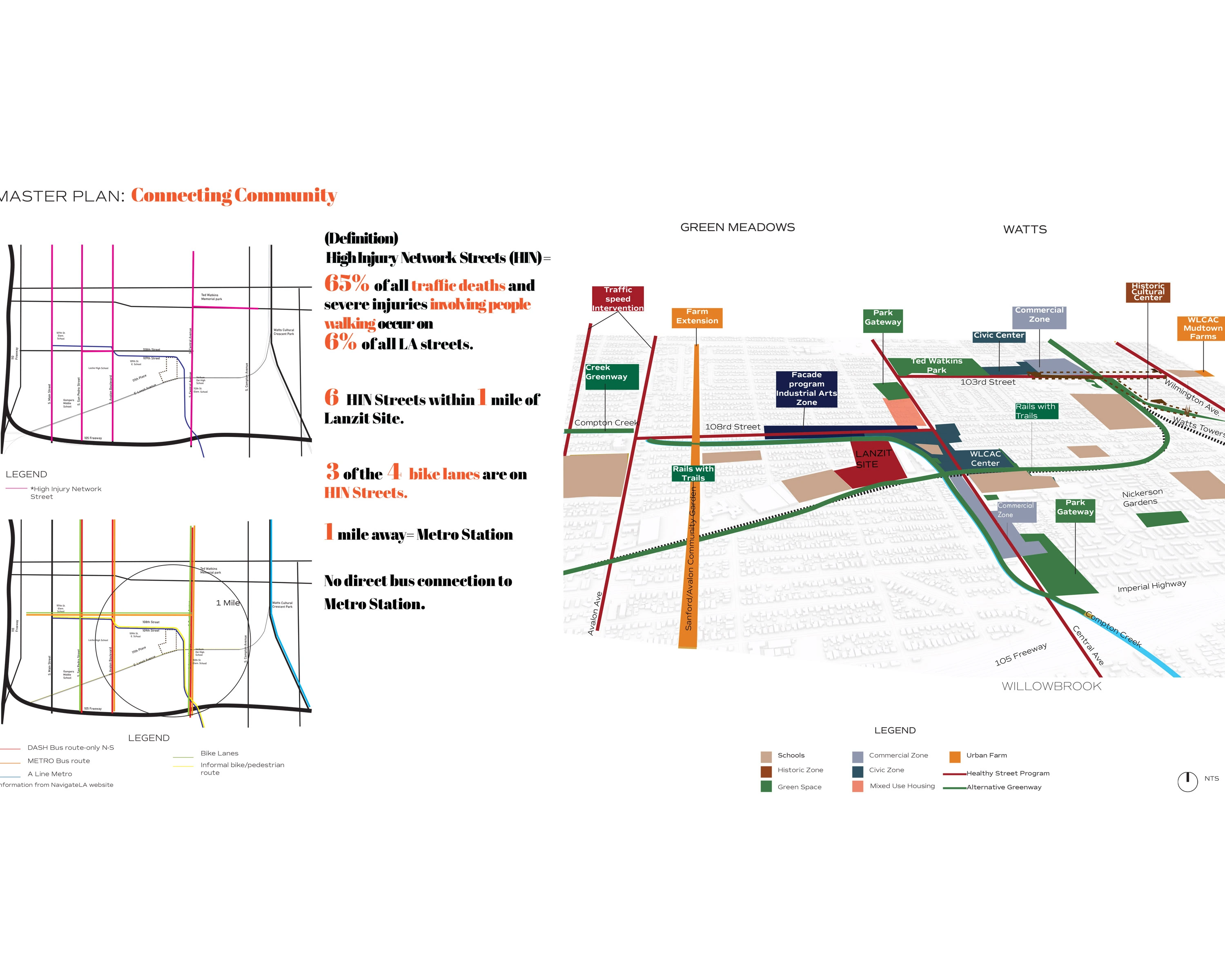 The project site is a former Cal Trans maintenance yard, the Lanzit Site, that borders the South Pacific Railroad Right of Way and the Compton Creek. The project incorporates the 9-acre Lanzit Site and an adjacent 4-acre junkyard. It is located at a crucial point along the impaired Compton Creek within the neighborhood of Green Meadows at the border of Watts. This part of the Compton Creek is not included in the LA River Master Plan, in spite of the local industrial impact on the health of the creek and the neighborhoods' critical need for connection and nature immersion. It is within walking distance of local schools and young people who deserve to decide the future they would like to steer towards. It is a tabula rasa that has the potential to support a mosaic of programs that bring diverse people together to experiment with economic, social, and environmental models that are small enough to fail, thereby paving new pathways to success.
