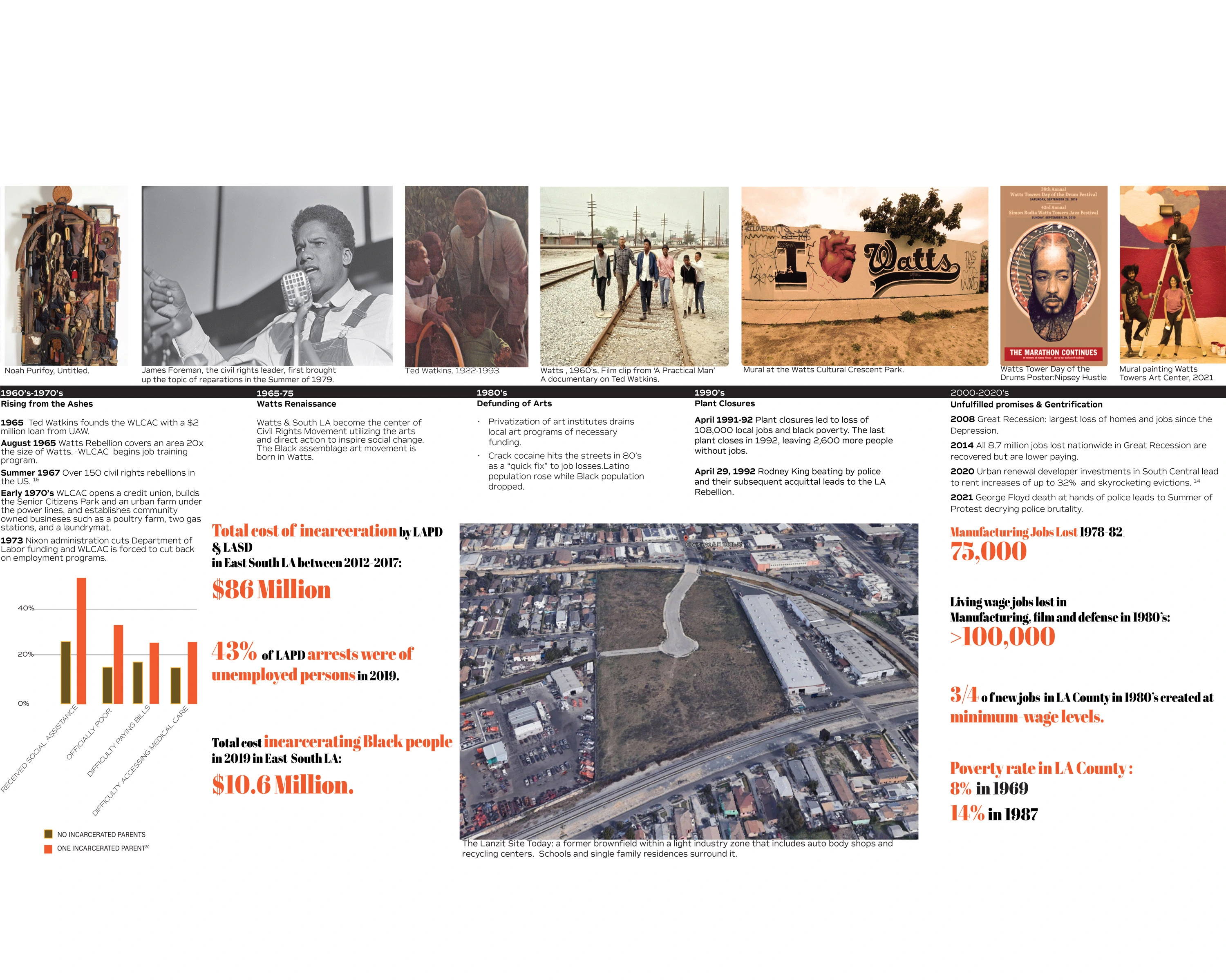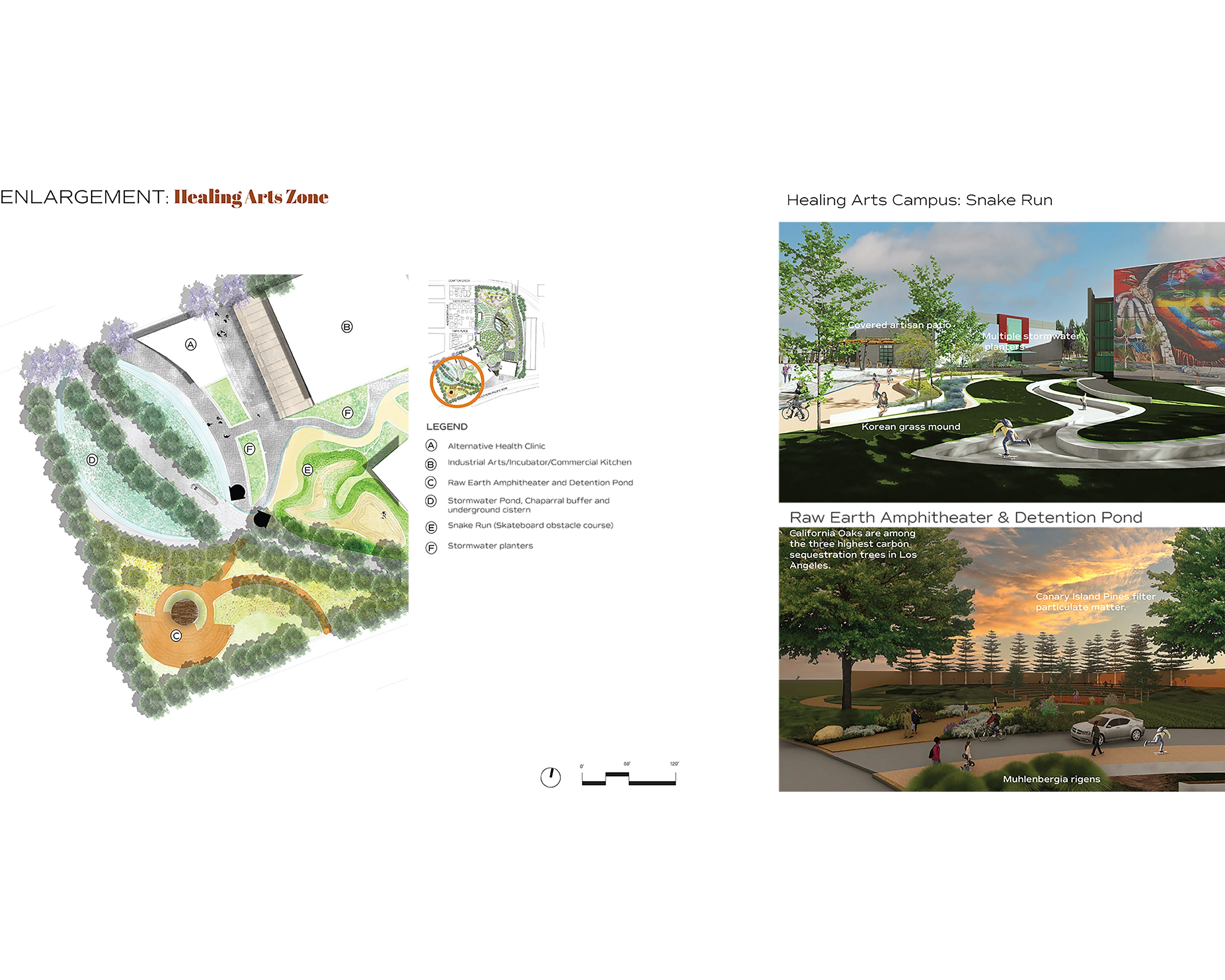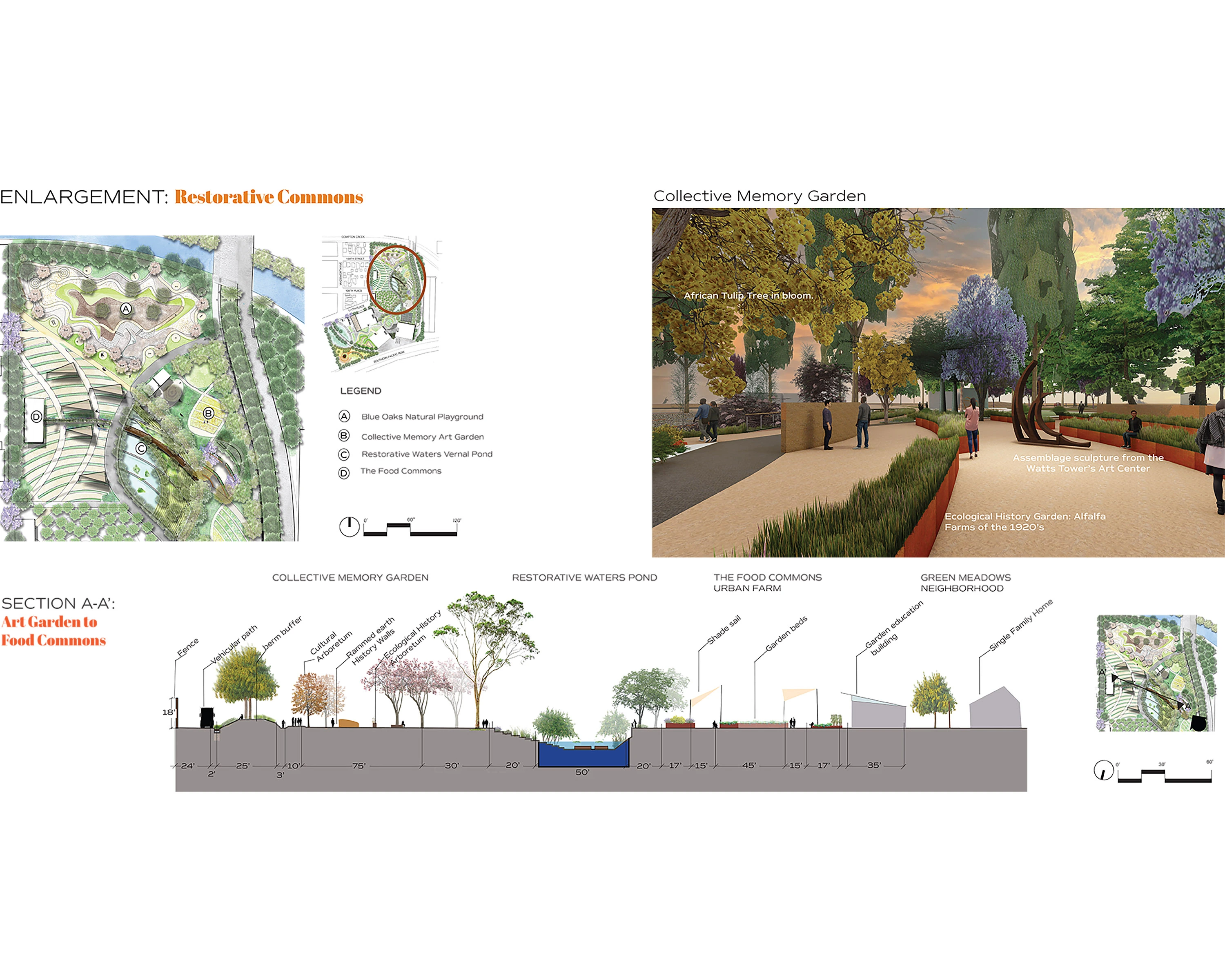 Healing is addressed through alternative health, gathering, communal dining, performance, and celebration. Art installations are mixed with cultural and ecological history garden exhibits that memorialize the Collective Memory of the land and the people, from the earliest Chumash land stewards to the Black jazz musicians of the First Great Migration, the Japanese farmers who grew strawberries before the Japanese-American internment, to the Mexican and Italian laborers, like Simon Rodia, who created the Watts Towers as a gift to his beloved neighbors. A public plaza serves as a gathering place for new workers, The Food Commons Farmers Market, and a place for cultural events to allow for different voices within the landscape and demonstrate a 'shifting, steady mosaic' that is the new understanding of ecology. This mosaic draws from the vernacular of local art and culture and is reflected in the materials (and the graphics) that reflect the vibrancy and warmth of South LA.