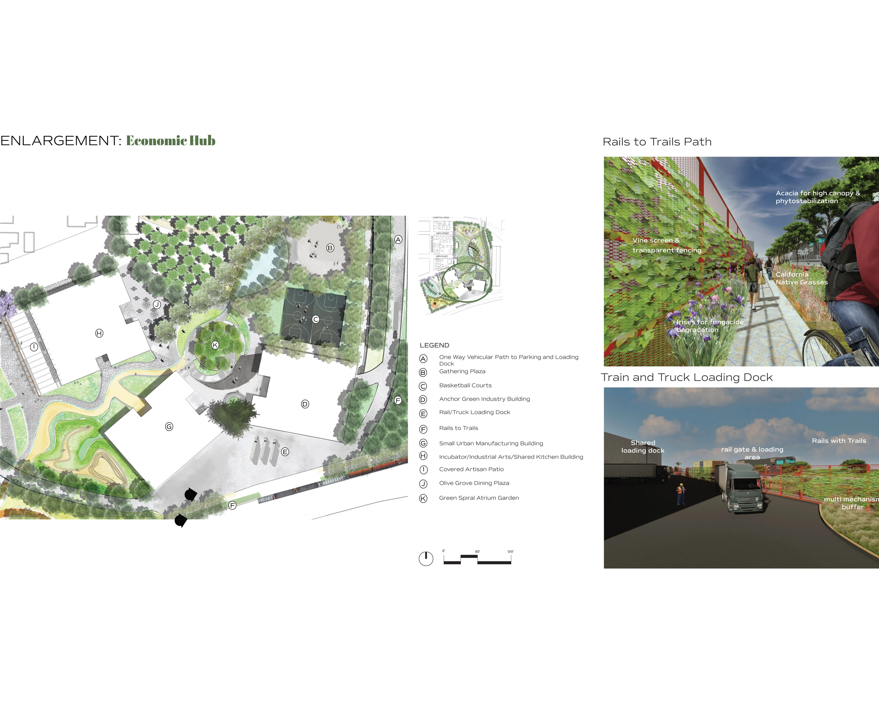 The economic model was defined by the Watts Labor Community Action Committee (WLCAC), the largest and oldest non-profit service provider and developer in Watts that has been dedicated to Black and Brown economic self-reliance since 1965. The WLCAC program includes an anchor green industry that provides the initial investment and job opportunities, a small urban manufacturing shared space for entrepreneurs, an industrial arts and education center, a community kitchen, and an incubator program. WLCAC has a 55-year history of working with the formerly incarcerated whose exclusion from the economy and society has deep repercussions throughout South LA. They designed a flexible and inclusive job entry program that cycles people into living wages jobs and entrepreneurship. The Eco Hub takes advantage of the railroad adjacency for the greener transport of goods and materials and provides a Rails-with-Trails for pedestrians and bicyclists. The WLCAC Plan also inspired the Food Commons and the Center for Alternative Health found in the other zones.