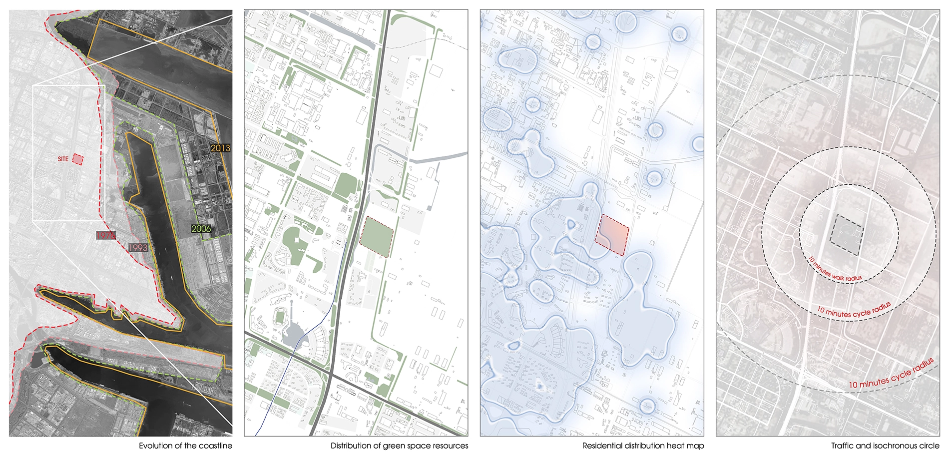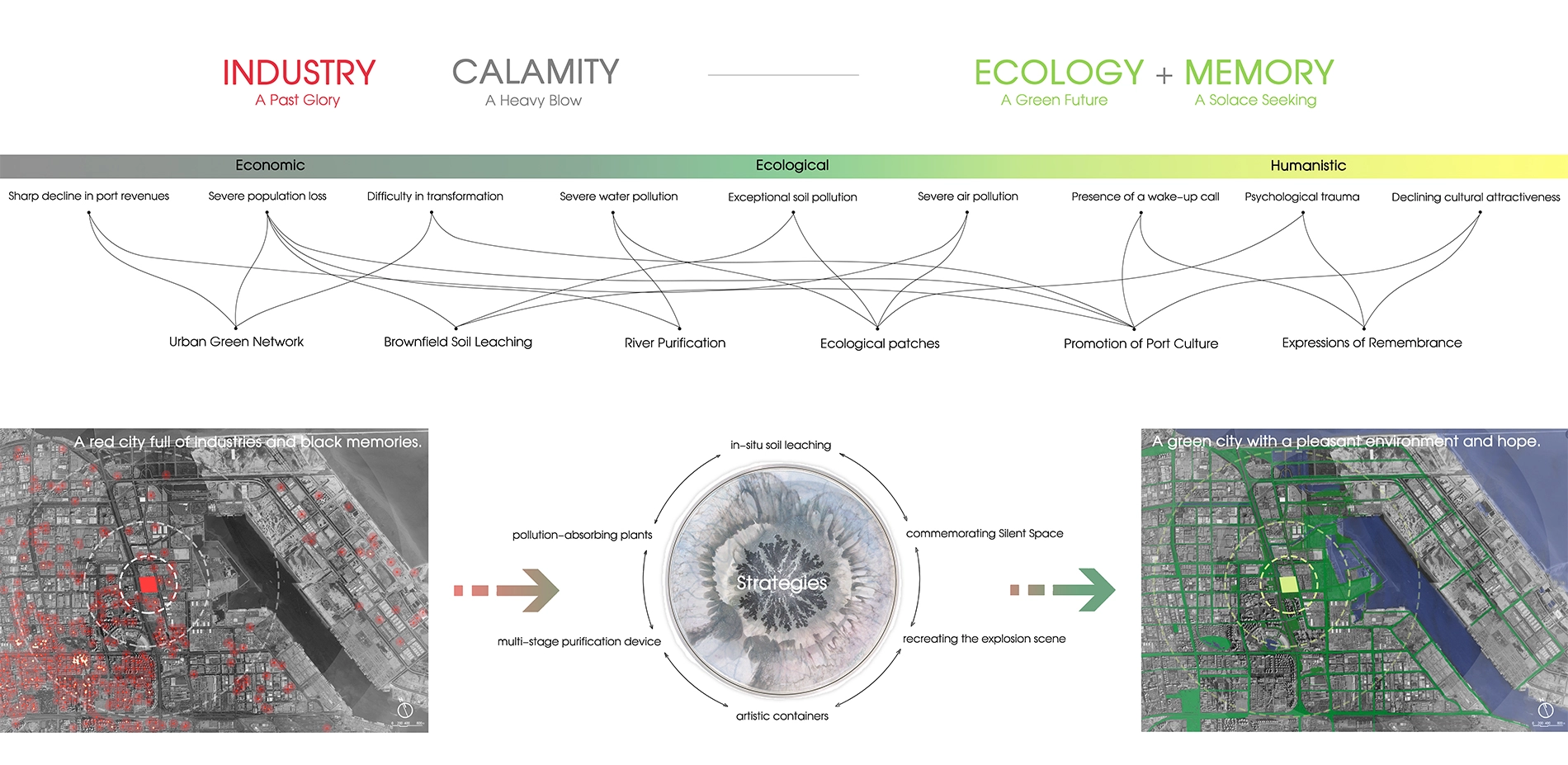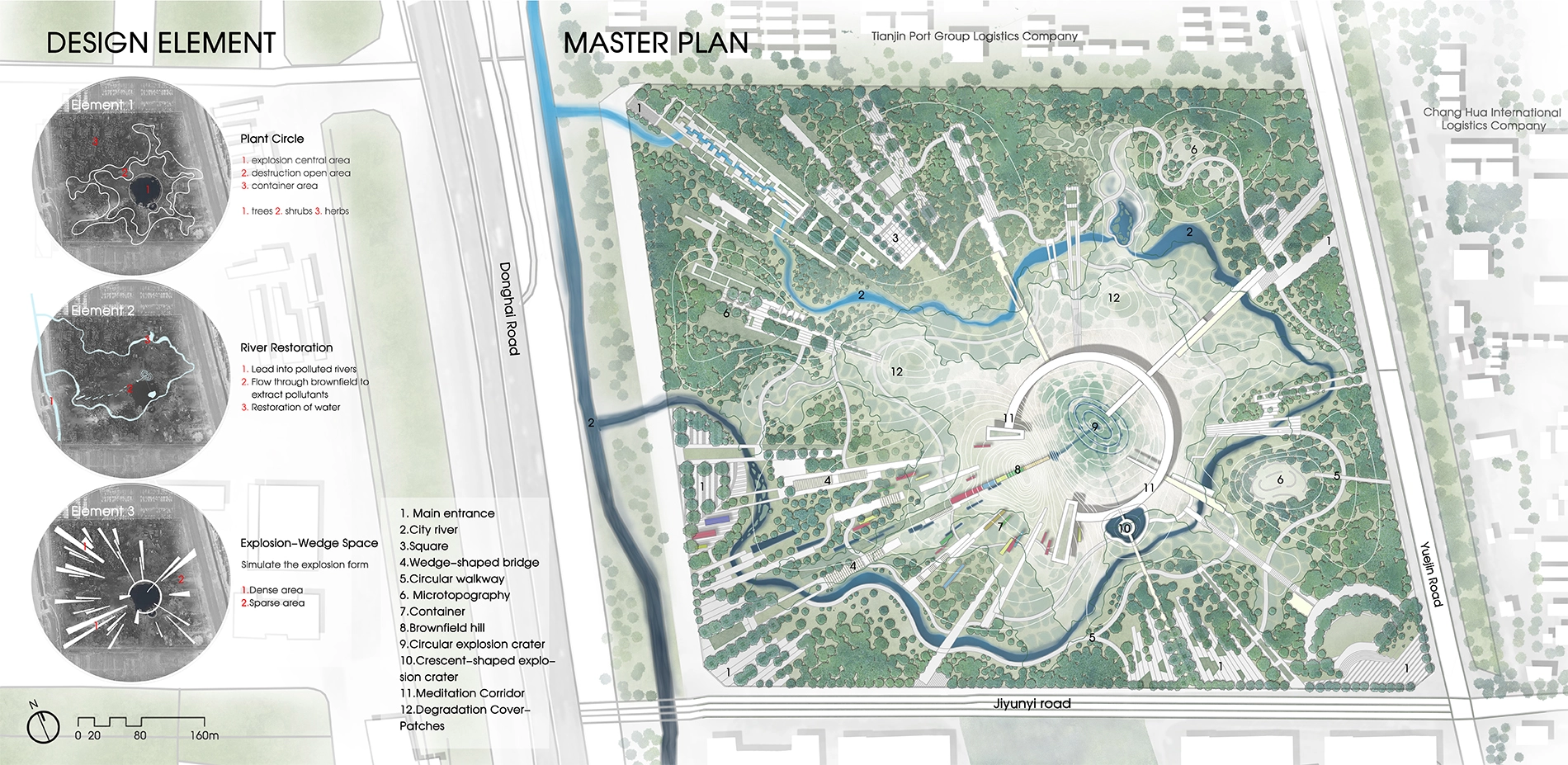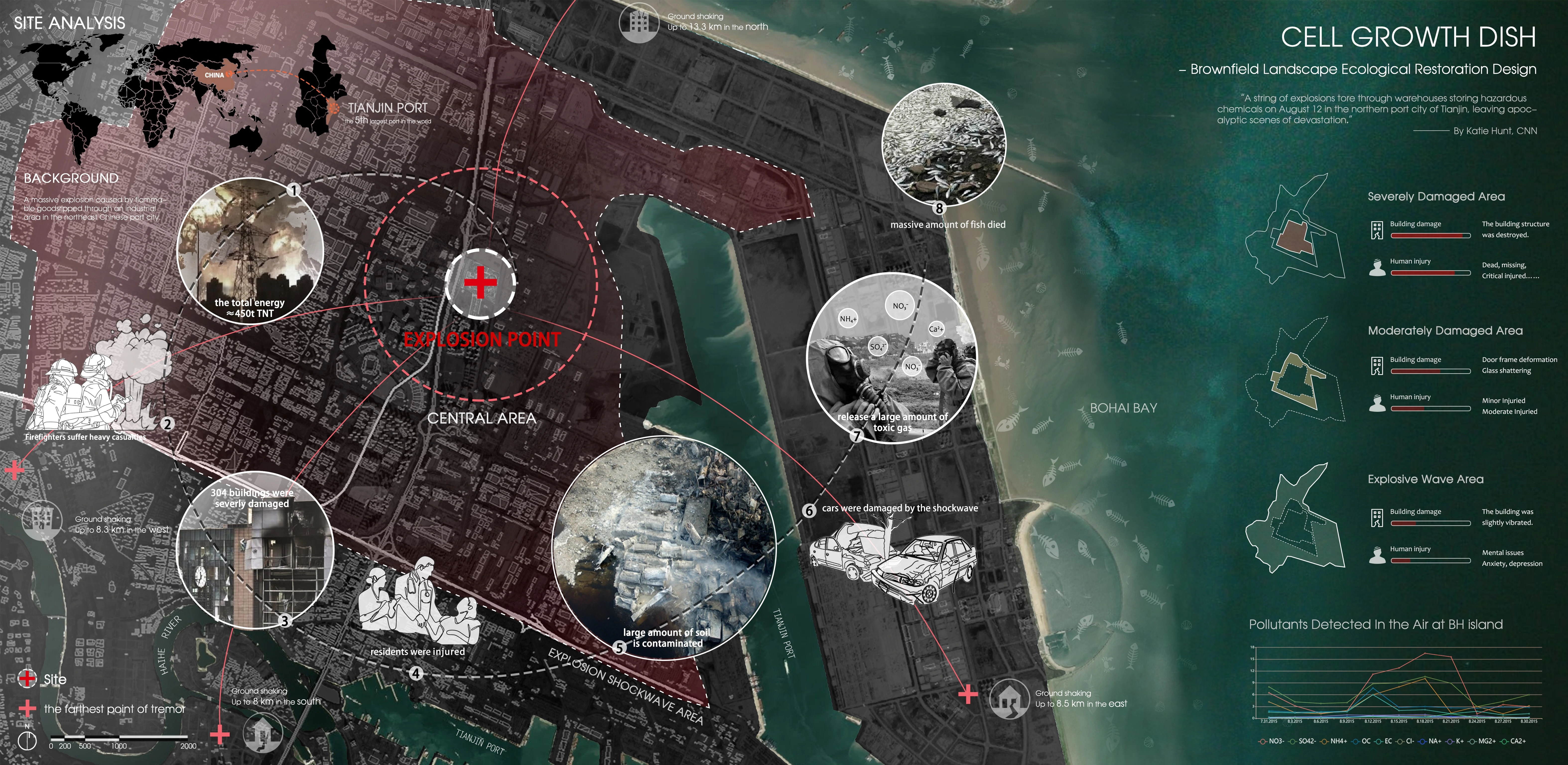 The port of Tianjin, once the fifth largest port in the world, carried a huge volume of trade traffic. In 2015, a sudden explosion of hazardous chemicals in a warehouse shattered all prosperity. A large amount of brownfield soil from the explosion site needed to be contaminated. The loss of chemical components in the environment caused varying degrees of contamination and caused intense unease among the surrounding population. The hard-hit Tianjin citizens and firefighters desperately longed for a place to soothe their inner grief.
