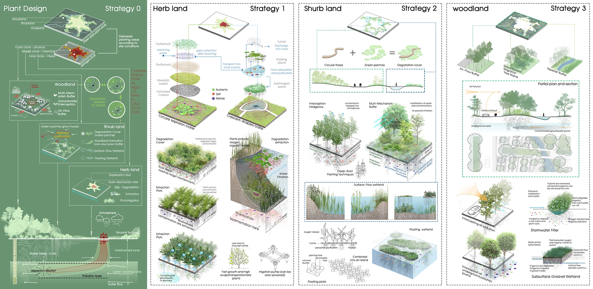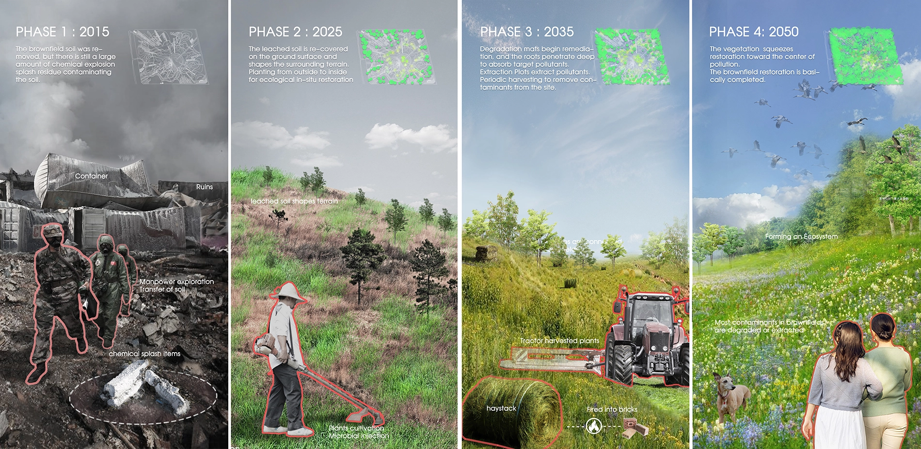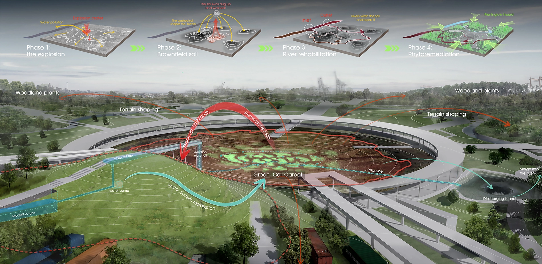 Combined with the settlement of pollution over the years and the year-by-year improvement of the bioremediation effect of the site, the planning and development of the site in the next 5, 20 and 50 years and the restoration process are envisioned to move towards the goal of a sustainable and resilient space. Plants in the form of grouped patches spread and squeeze towards the central blast pit like cell growth, eventually turning the barren soil in the blast pit into an ecological green island. The process of gradual settling and dissipation of pollution is visualized through the growth of plants, vividly demonstrating the ability of bioremediation to repair contaminated soil. Eventually the vibrant green will finally cover the "scars" produced by the explosion, and the power of biology slowly heals it all.