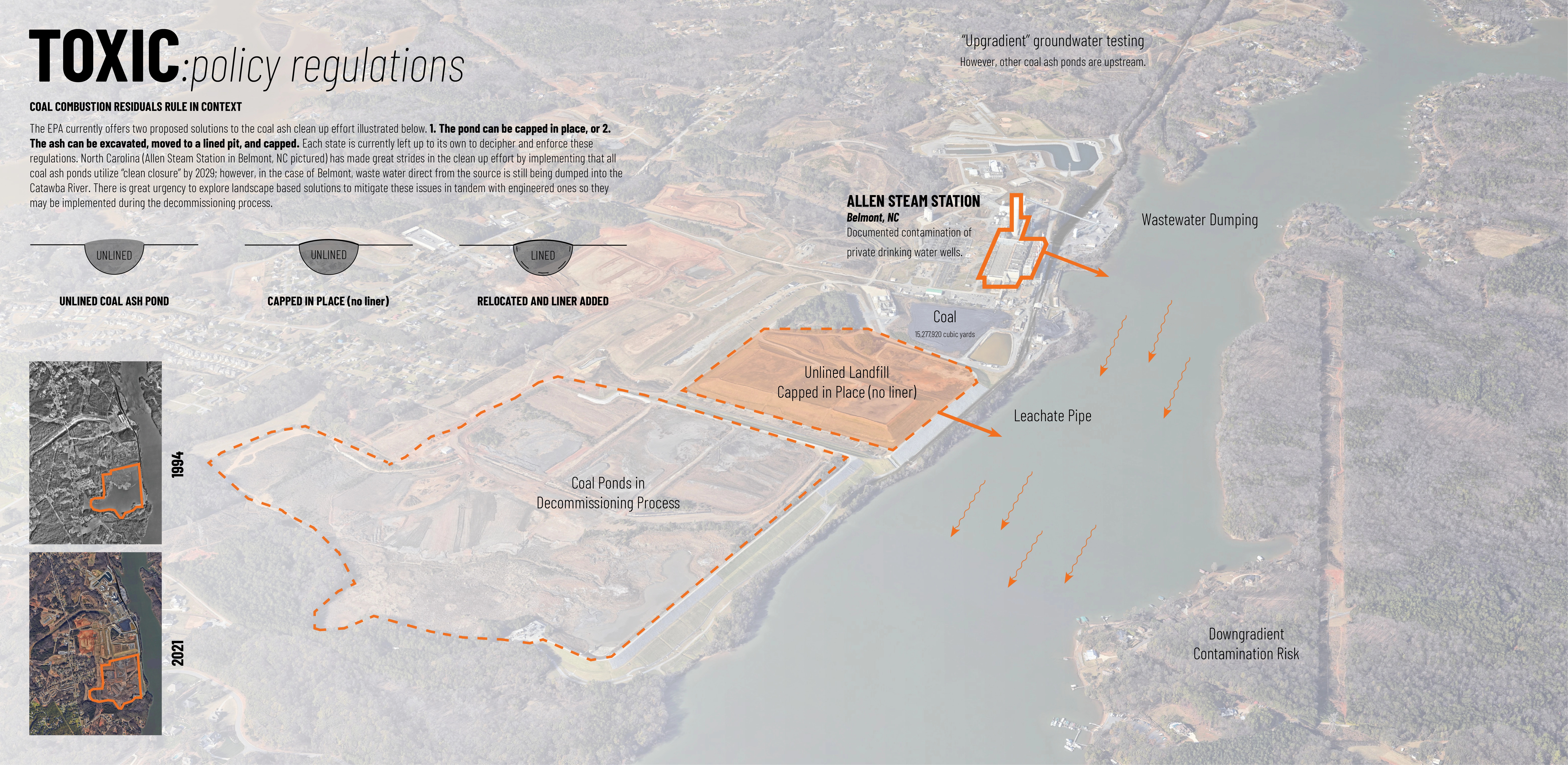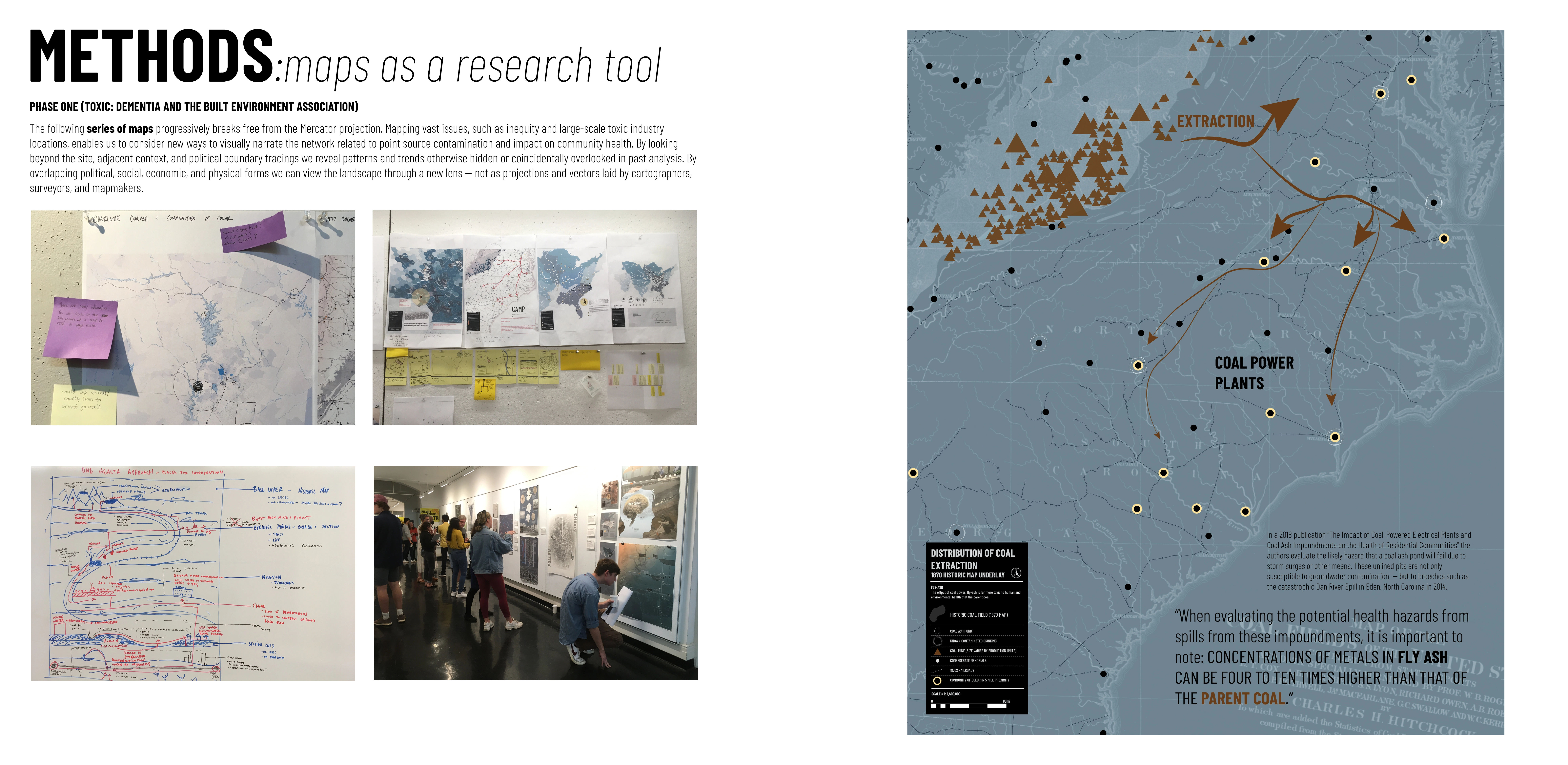 This research benefited from a descriptive and testing approach in two phases: during the first phase, mapping strategy was used to understand and communicate the problem, and the second phase involved testing to understand the ability of a potential strategy that can mitigate the problem at a localized level. In Landscape Architecture, the act of mapping as a research tool is vital. Mapping informs designers through multiple lenses and is inherently a community development approach to unraveling injustices. In the first phase, maps were generated and used as an inductive approach to uncover patterns related to these TOXIC landscapes, generating new perspectives to hypothesize the future for places impacted by toxic landuse practices. Data from various sources, including the EPA, Center for Disease Control, United States Census, Earthjustice, and the Environmental Integrity Agency, was collected, formatted, tabulated, and imported into ArcGIS Pro. Spatial analysis revealed the relationships between utility companies and rates of Alzheimer’s mortality. Further map-based visual storytelling was used as a strategy for demonstrating complex socio-temporal problems in the built environment, particularly in areas in proximity to the Allen Steam Station Coal Power Plant near Charlotte, NC.