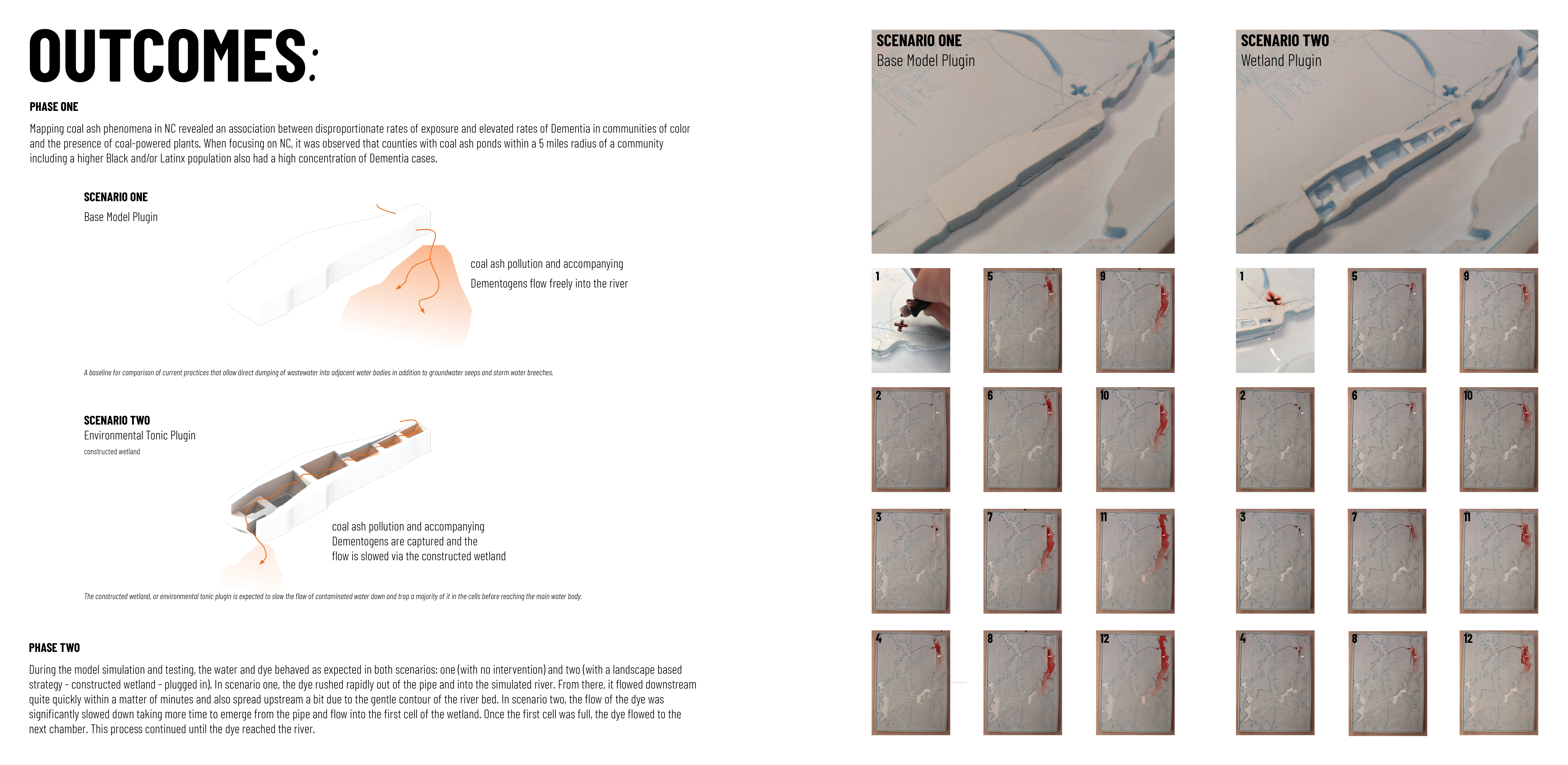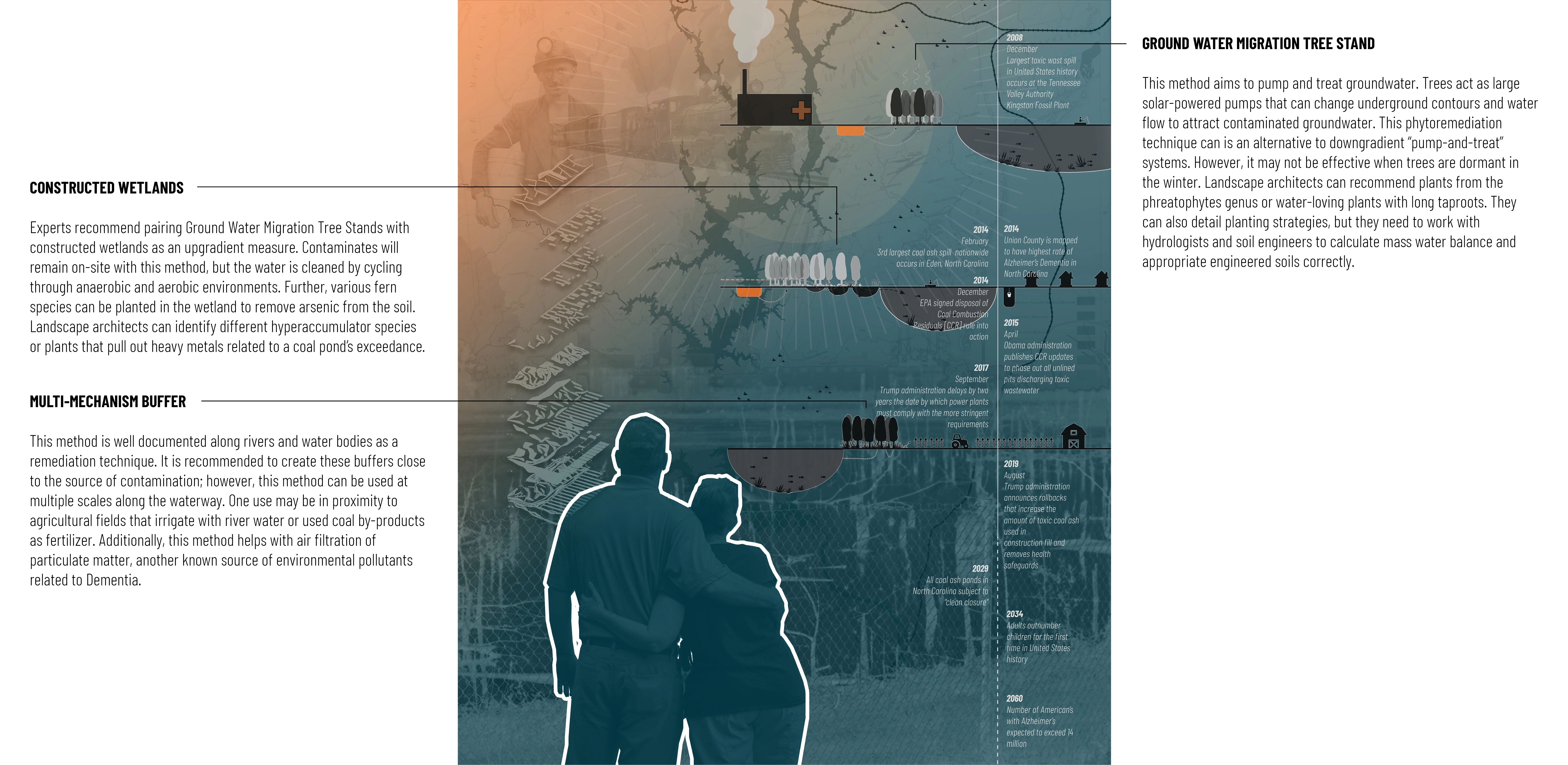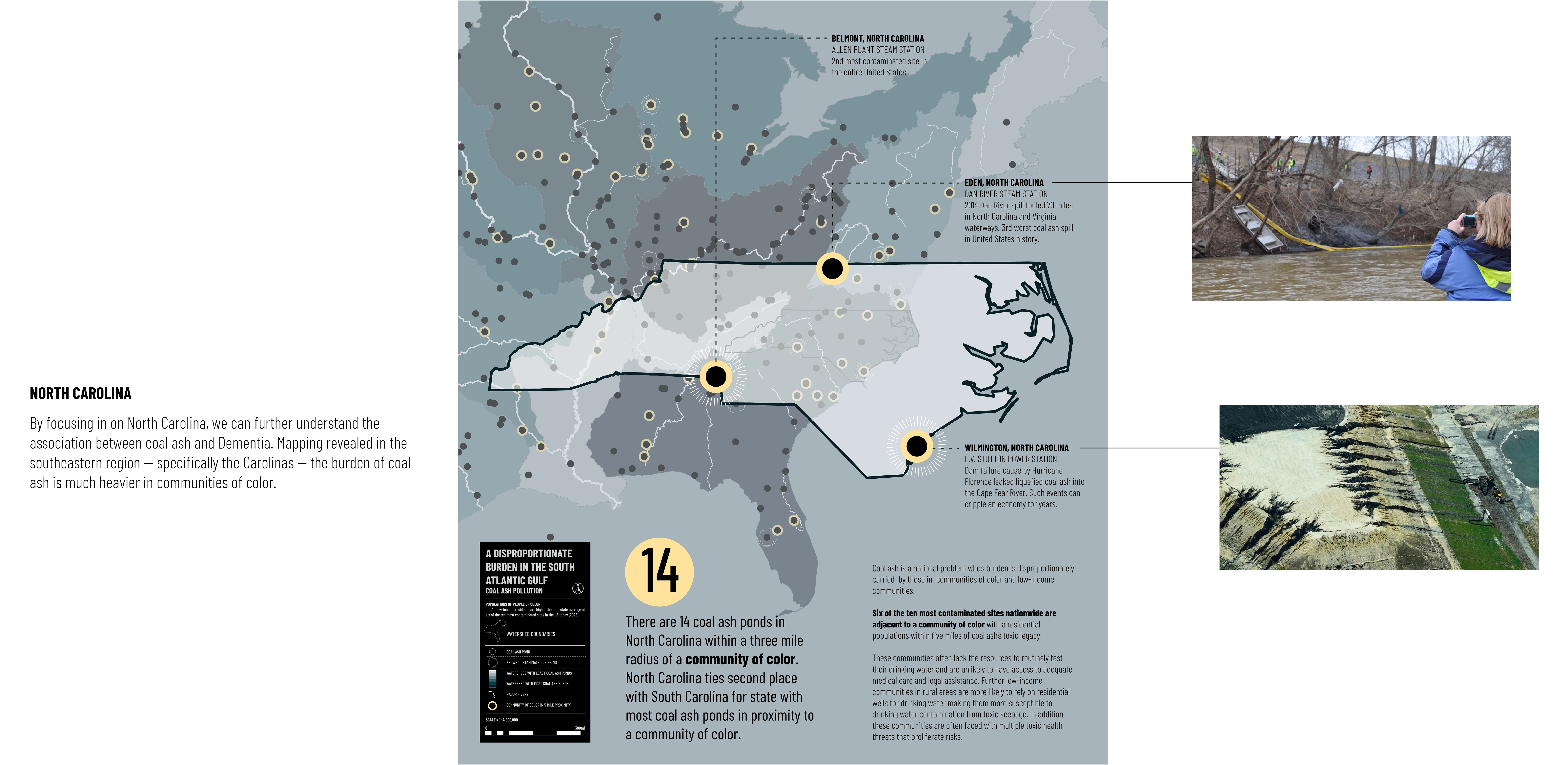 Mapping coal ash phenomena in NC revealed an association between disproportionate rates of exposure and elevated rates of Dementia in communities of color and the presence of coal-powered plants. When focusing on NC, it was observed that counties with coal ash ponds within a 5 miles radius of a community including a higher Black and/or Latinx population also had a high concentration of Dementia cases. Although there are documented landscape-based solutions to combat pollutants emerging from these plants, such as groundwater mitigation tree stands, constructed wetland, and multi-mechanism buffers, not much consideration has been given to the strategic implementation of these strategies. Mapping as a research tool provided an understanding of how and where landscape-based solutions can be considered in addition to engineered ones to mitigate the leaching of Dementogens and combat a disproportionate burden on communities.