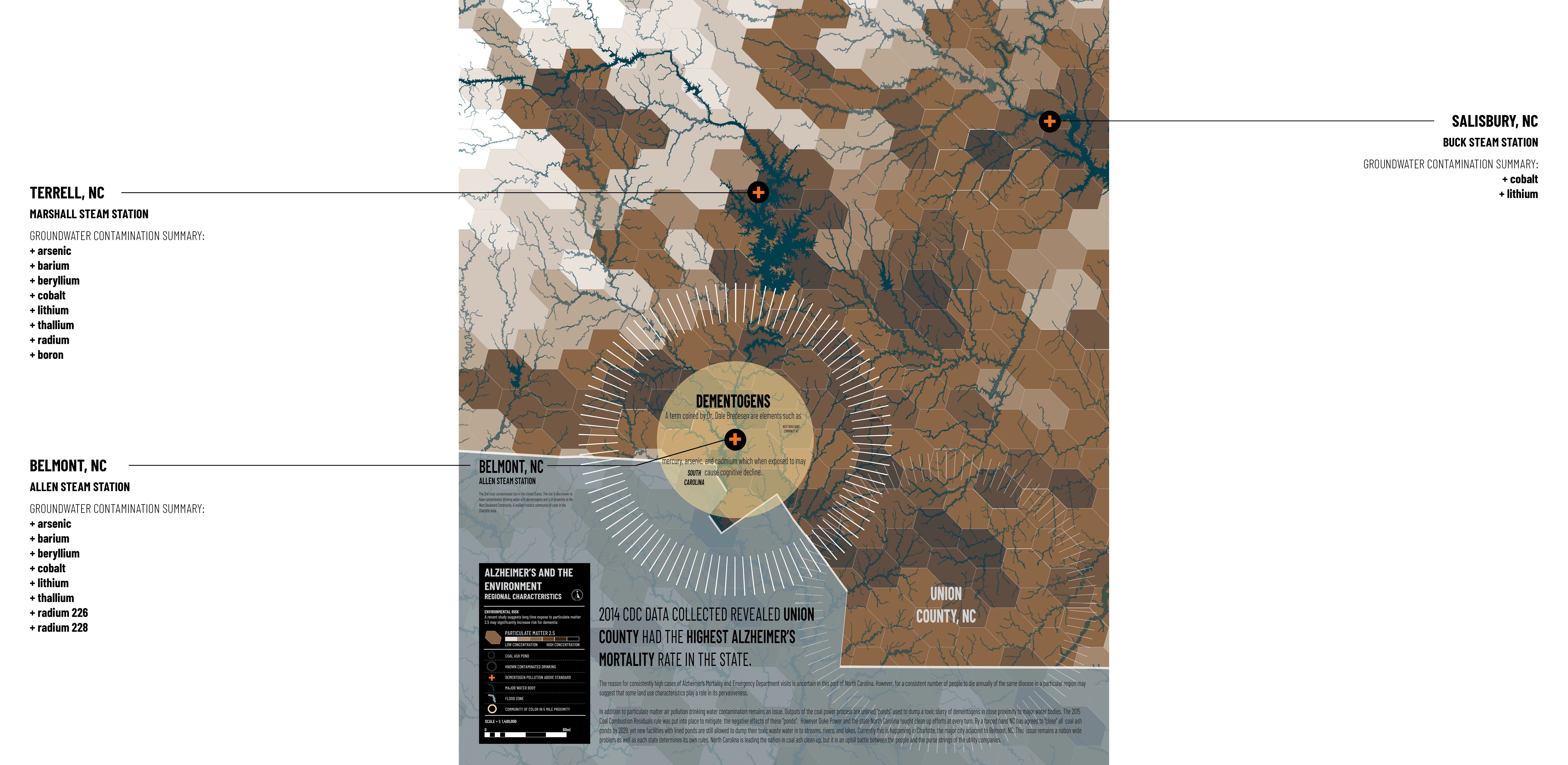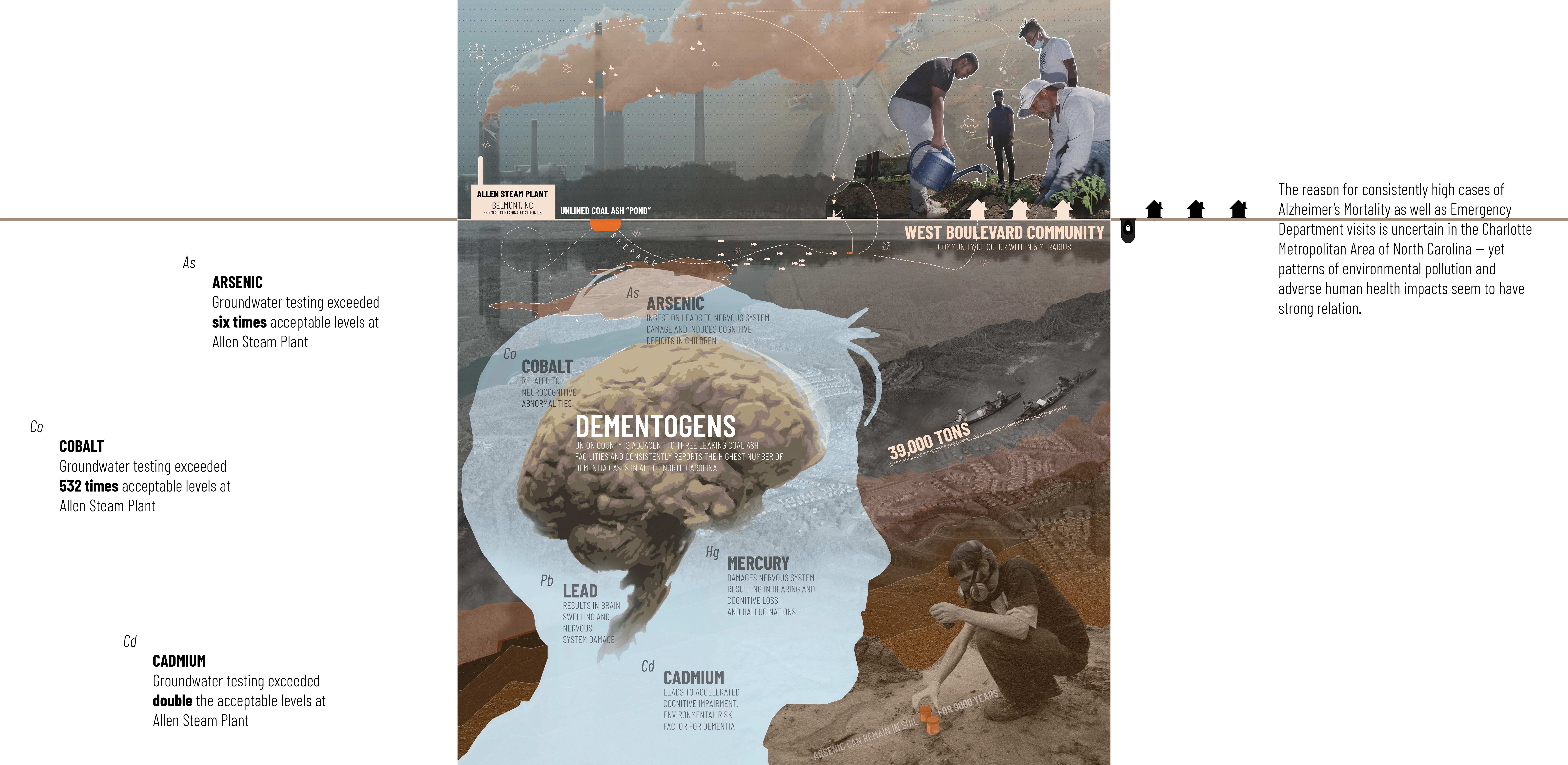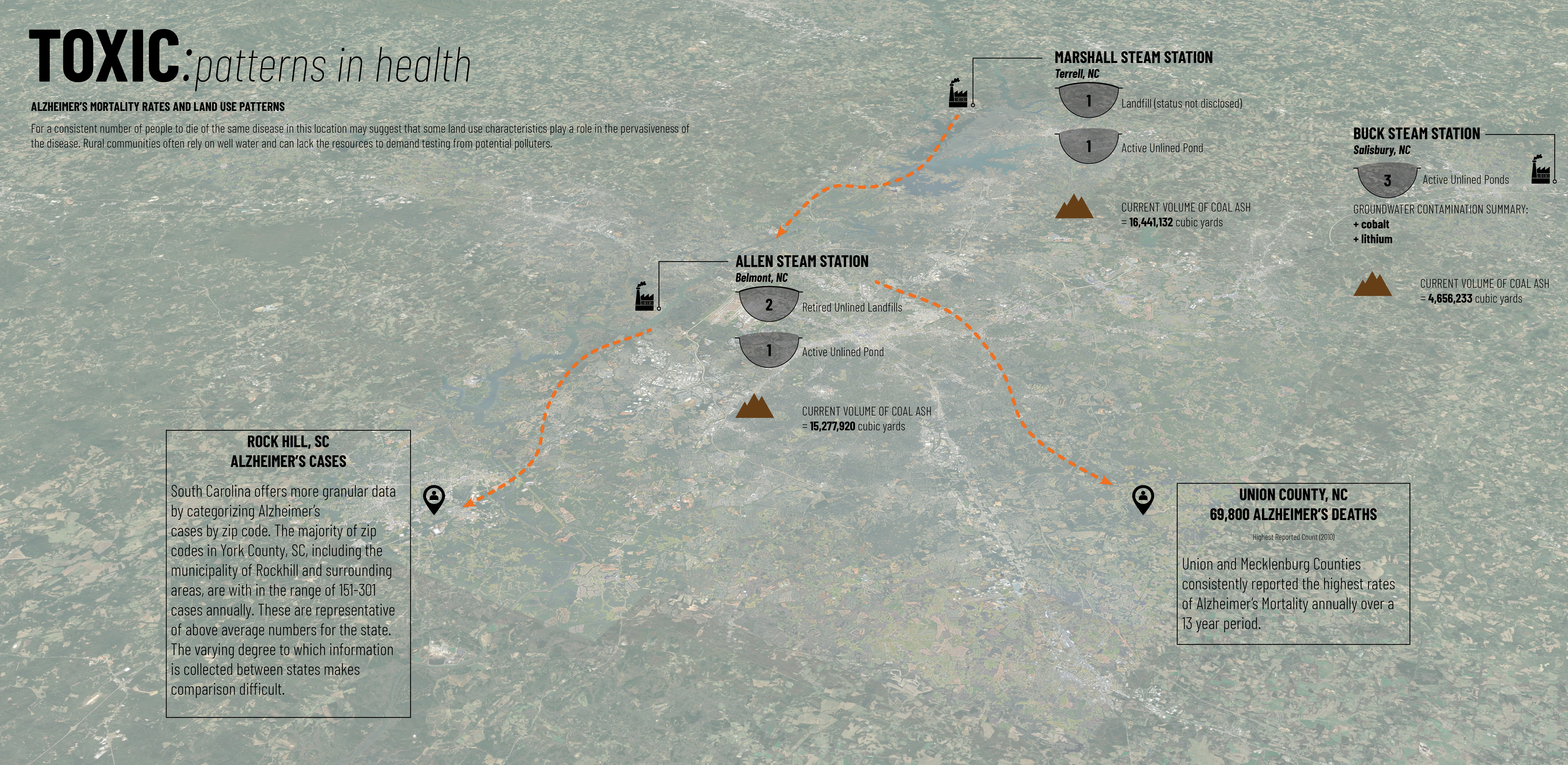 Through a review of multi-disciplinary research and visualization of information through mapping, various industrial sources in the United States were first identified and overlaid with heightened rates of Alzheimer’s mortality. Coal power plants became a salient source of contamination related to the disease. According to data points from Earthjustice, six out of the ten most toxic coal ash ponds in the nation known to contaminate the environment are within a 5-mile radius of communities of color. Hence, a Coal Power Plant near Charlotte, NC, the second most contaminated site in the US, emerged as a case study for this study due to an exceptionally high rate of Alzheimer’s mortality in downgradient municipalities and its adjacency to a community of color. A consistent number of people dying of the same disease may suggest that some land use characteristics play a role in the pervasiveness of the disease in this region.