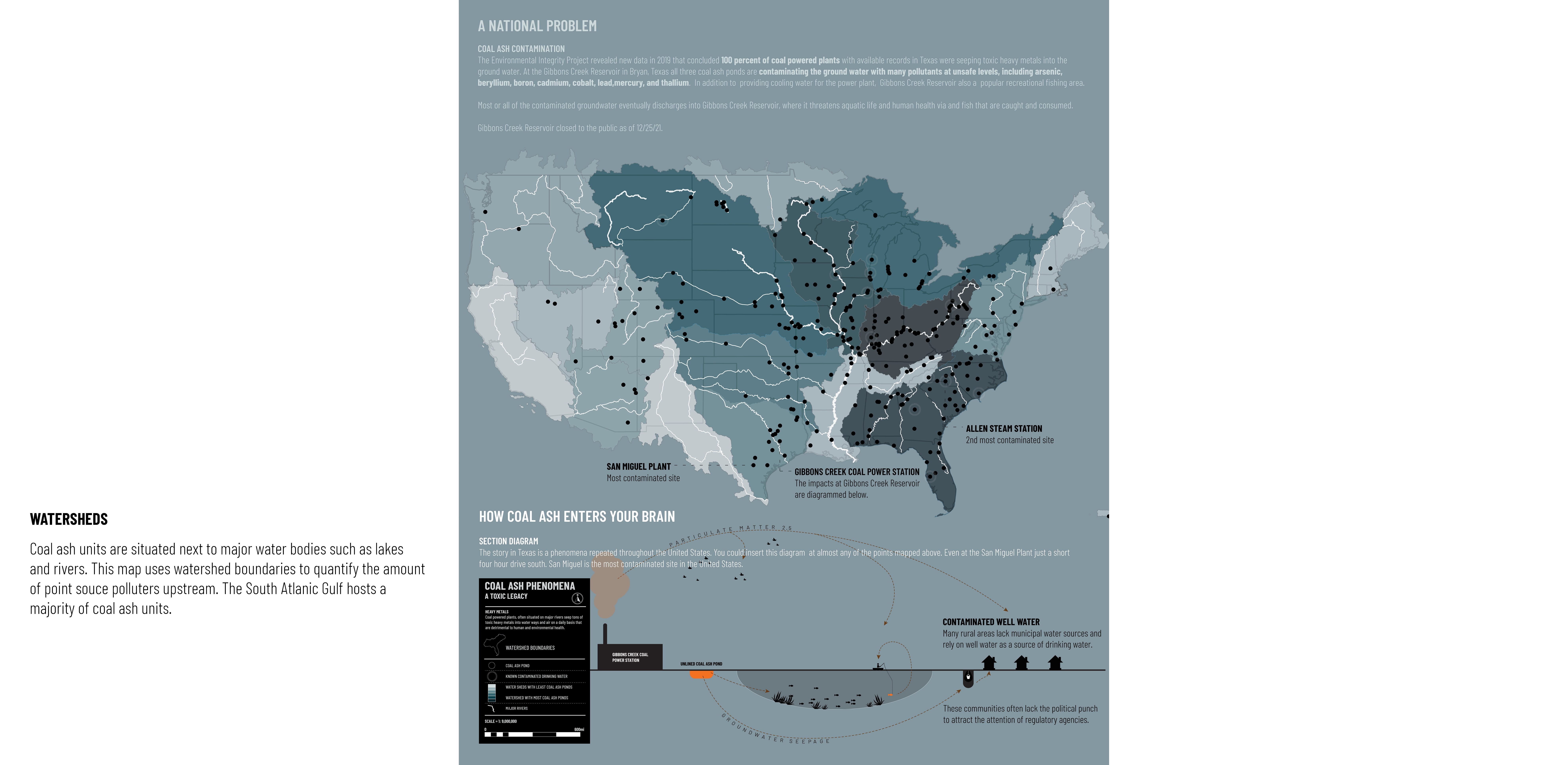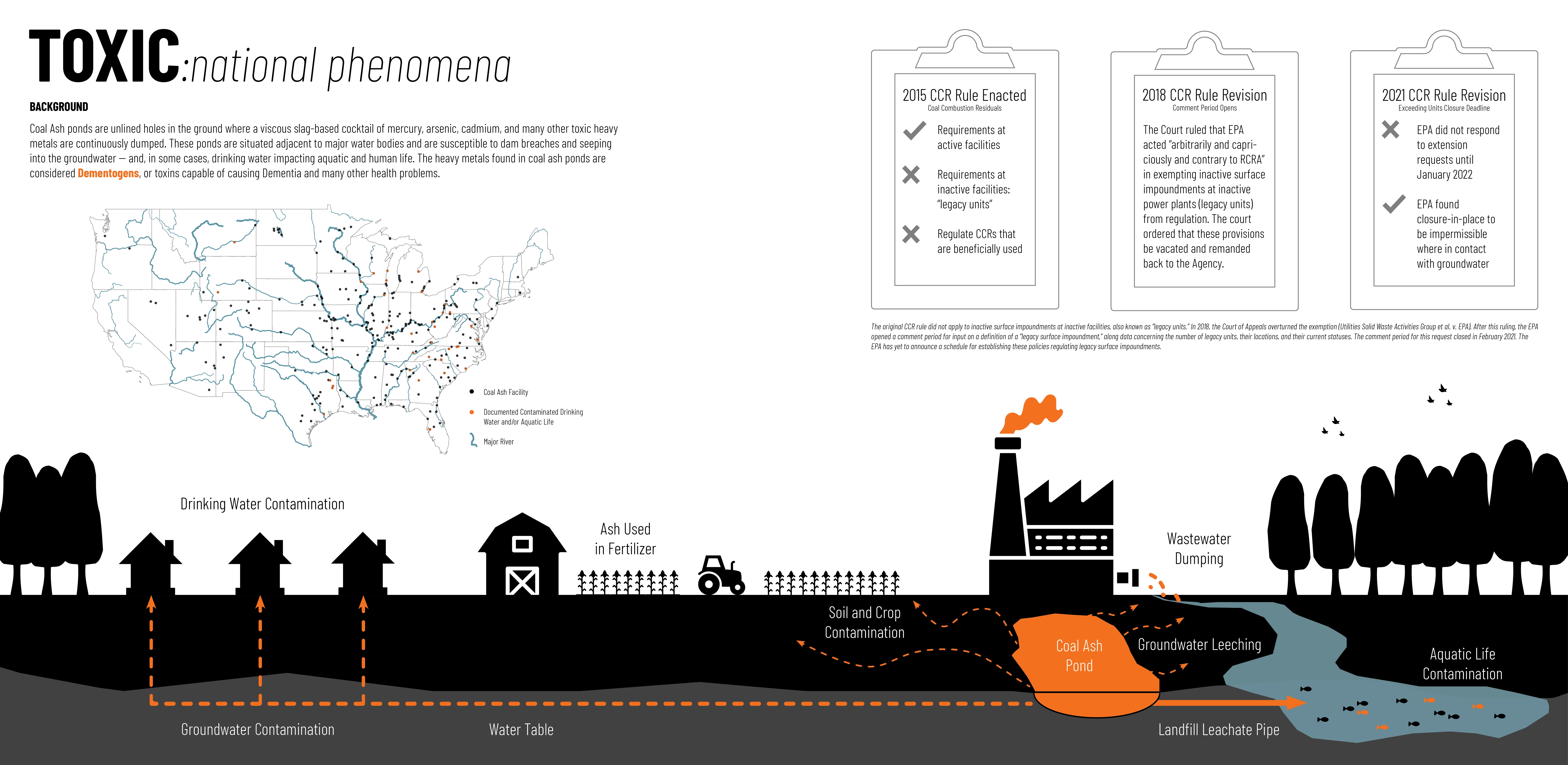 This project creatively investigated the connection between coal ash ponds and Dementia through map-based visual storytelling. Then, modeling was used to understand if landscape-based solutions, like constructed wetlands, could mitigate the spread of Dementogens across a site. Jurors were impressed by the multi-phase creative research inquiry and final outcomes.