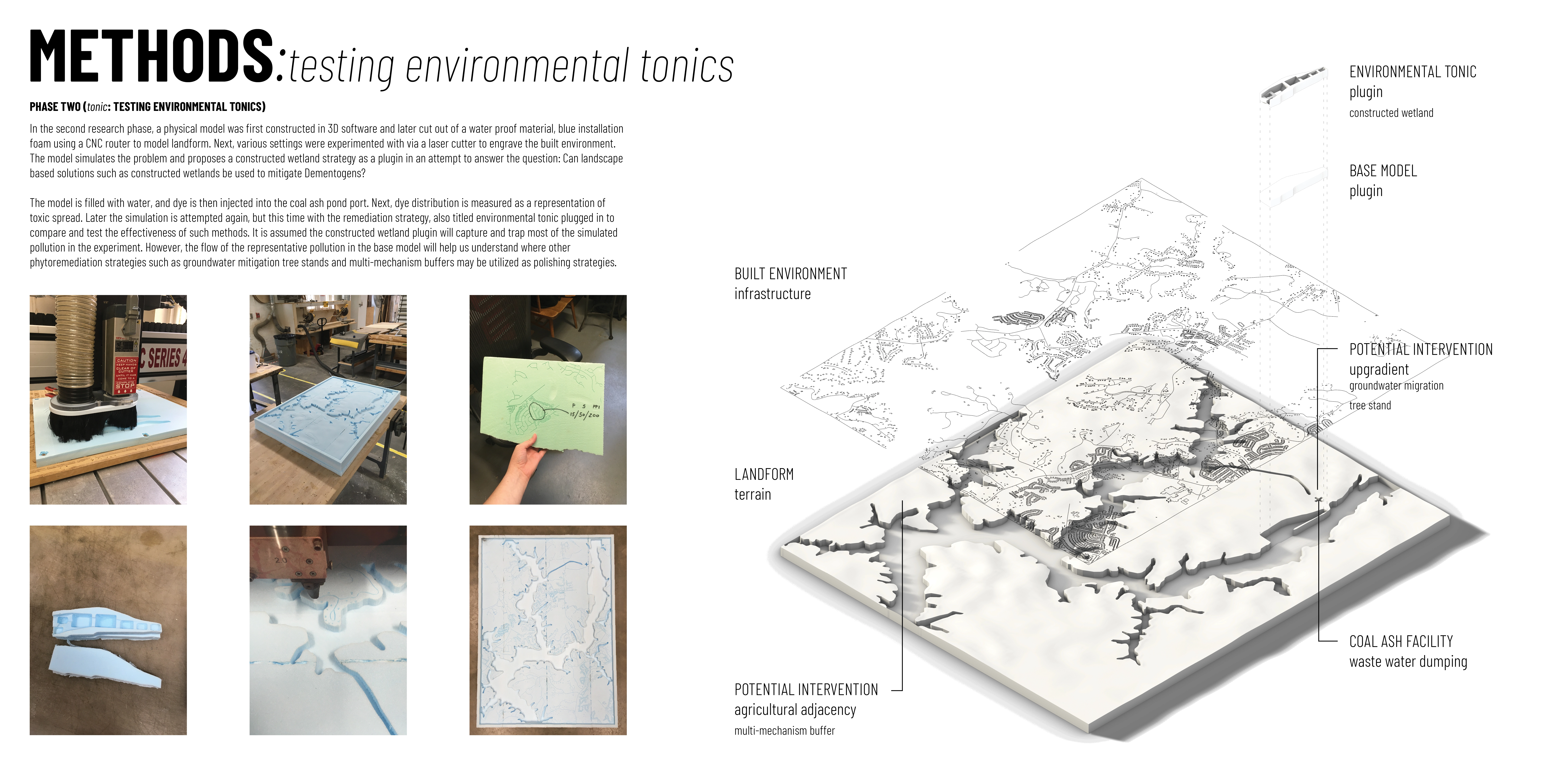 In the second phase (i.e. tonic: Testing Environmental Strategies), a physical model of the selected power plant area was constructed to simulate the built environment and propose various strategies as plugins. The model was first filled with water, and dye was then injected into the coal ash pond port. The dye distribution was measured as a representation of toxic spread. Later the simulation was attempted again by plugging in the new constructed wetland strategy to compare and test the effectiveness of potential landscape-based strategies as solutions.