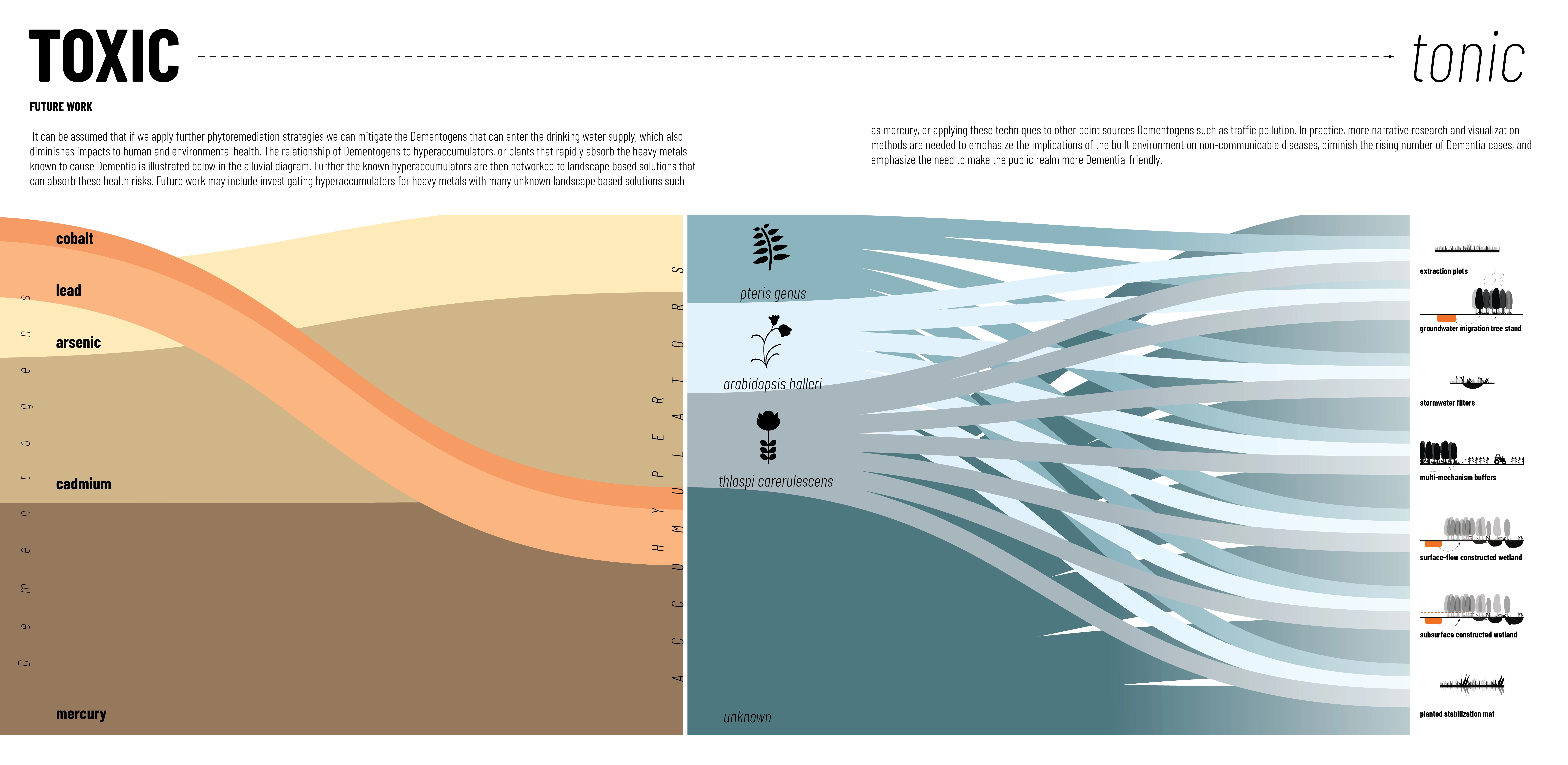 The number of Americans with Alzheimer’s is expected to increase to 14 million by 2060. Furthermore, by 2034 the number of adults will exceed children in the United States for the first time. Alzheimer’s and related Dementias bear a disproportionate burden on women and people of color. There is an imperative and urgent need to search for the point source of “Dementogens,” or categories of toxins that can lead to Dementia. However, little research exists on mitigating environmental pollutants related to Dementia using landscape-based solutions in landscape architecture and related disciplines. Through map-based visual storytelling, this research investigates coal ash ponds as a point source related to this growing public health concern. It uncovers the patterns of disproportionate disease rates affected by structural racism in the built environment. The study also examines the possible benefits of landscape-based alternatives, or environmental tonics to mitigate Dementogens by testing the ability of these strategies to diminish the TOXIC impacts of the built environment on human health.
