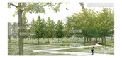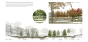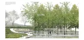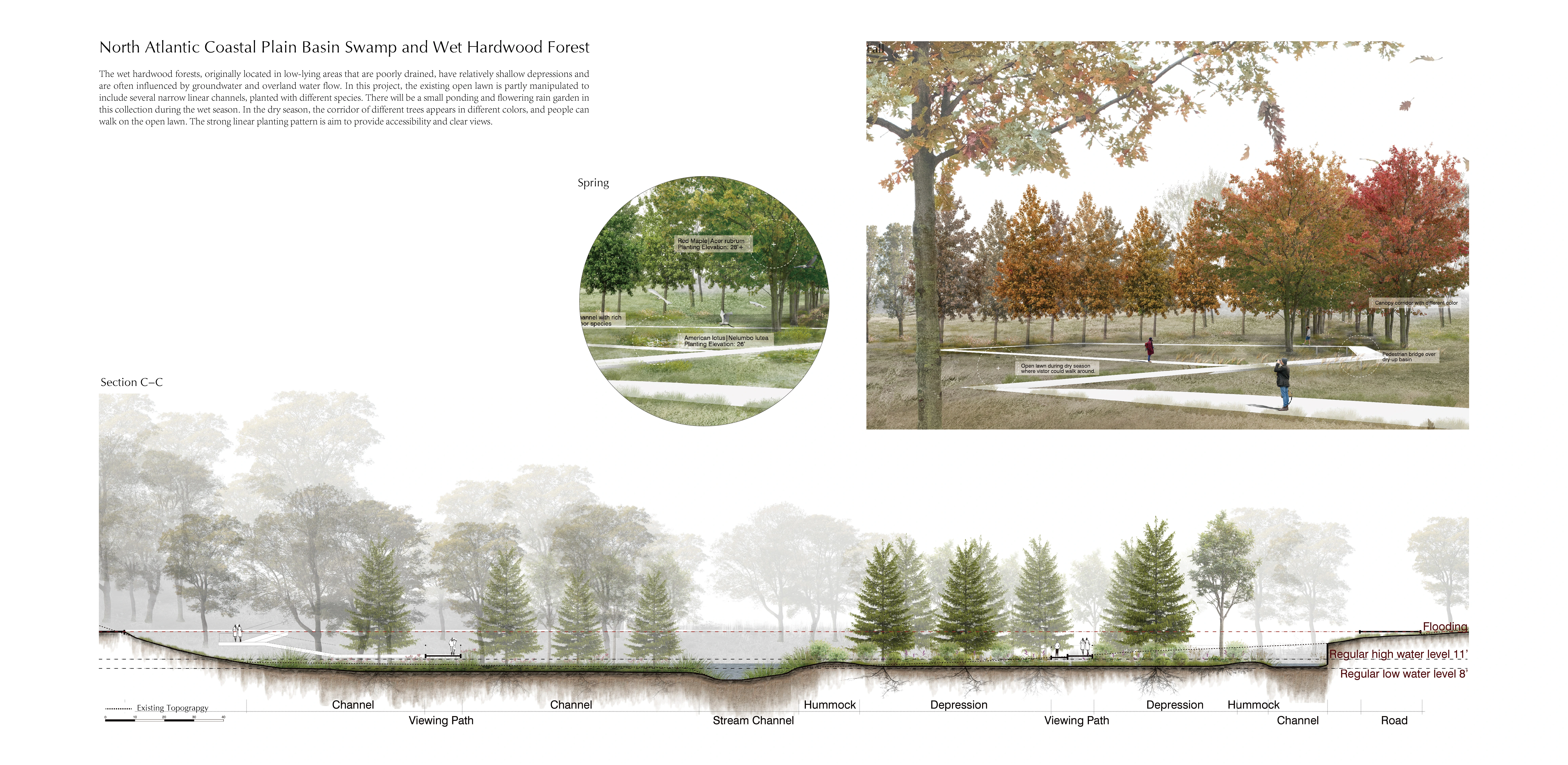 North Atlantic Coastal Plain Basin Swamp and Wet Hardwood Forest - The wet hardwood forests, originally located in low-lying areas that are poorly drained, have relatively shallow depressions and are often influenced by groundwater and overland water flow. In this project, the existing open lawn is partly manipulated to include several narrow linear channels, planted with different species. There will be a small ponding and flowering rain garden in this collection during the wet season. In the dry season, the corridor of different trees appears in different colors, and people can walk on the open lawn. The strong linear planting pattern aims to provide accessibility and clear views.