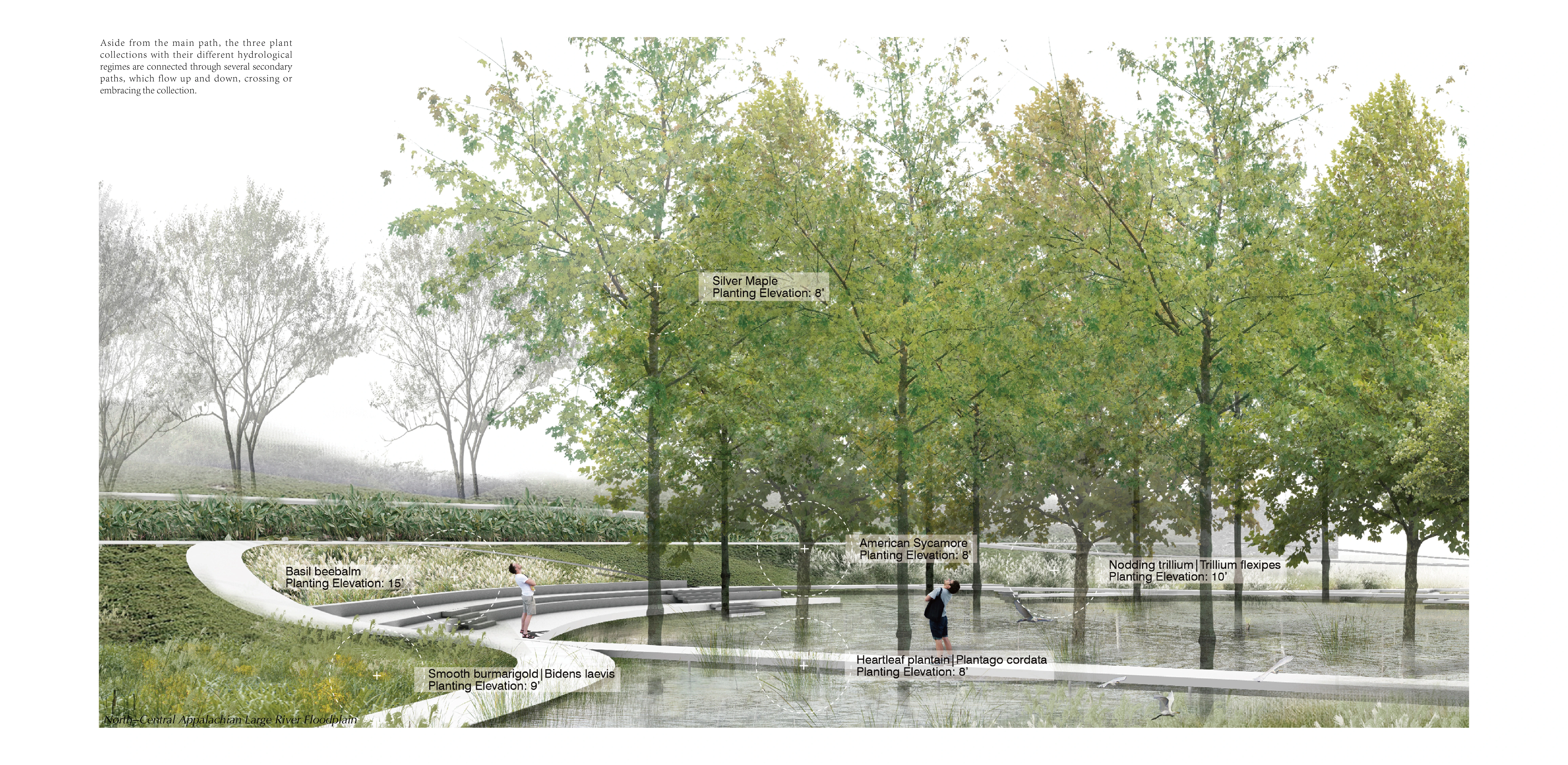 North-Central Appalachian Large River Floodplain - The extent to which the floodplain is under water varies with the seasons. At the lowest elevation, it is mostly underwater. Selected dominant canopy species including silver maple and sycamore grow along the edge of or within the shallow pond. It ponds during spring and summer. Flowering groundcover species are planted on the terraced bank, in contact with water under the canopy. During the fall with its low water levels, the pond becomes a muddy basin. Some trees may topple because of the flooding in the wet season.