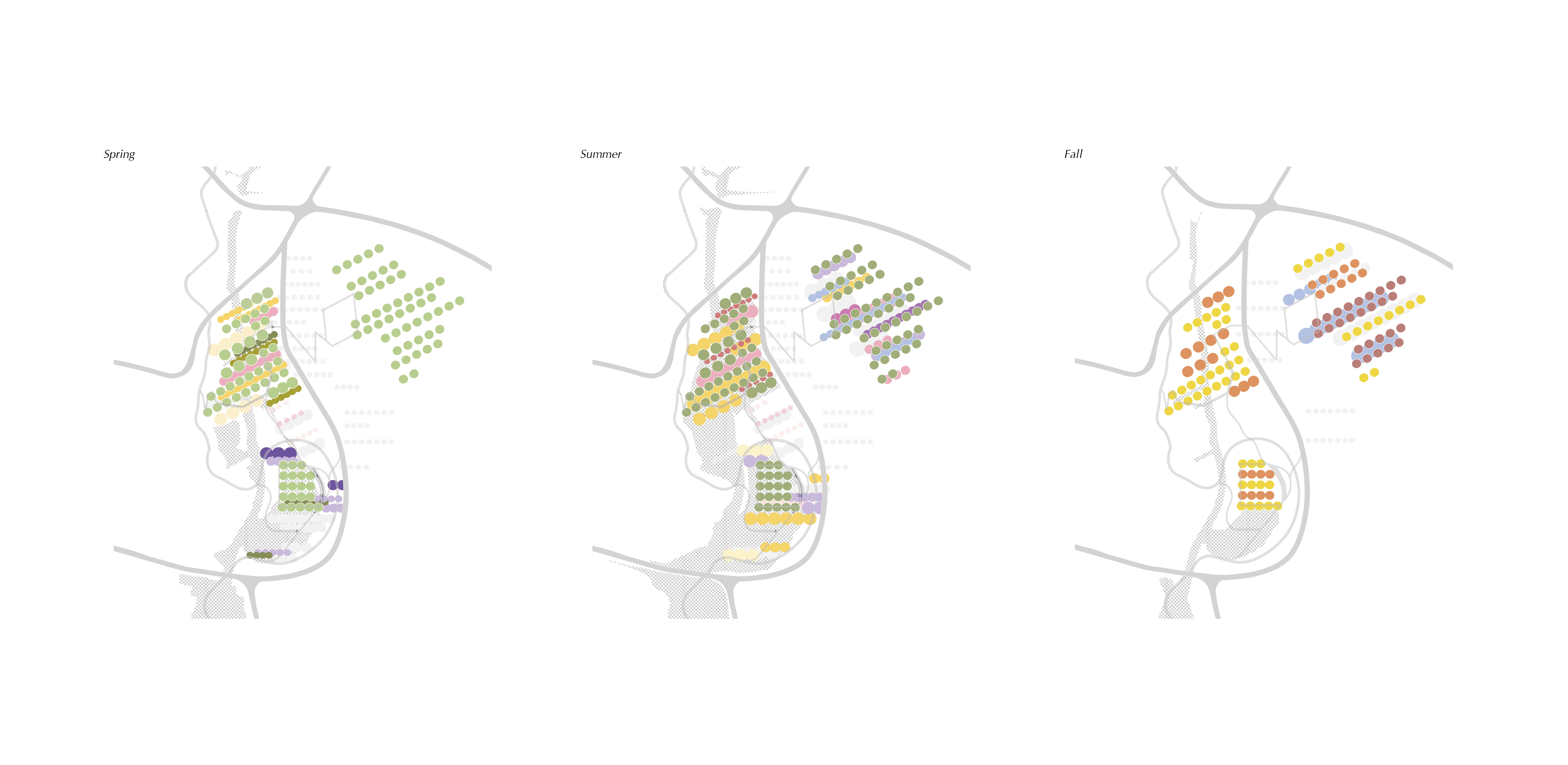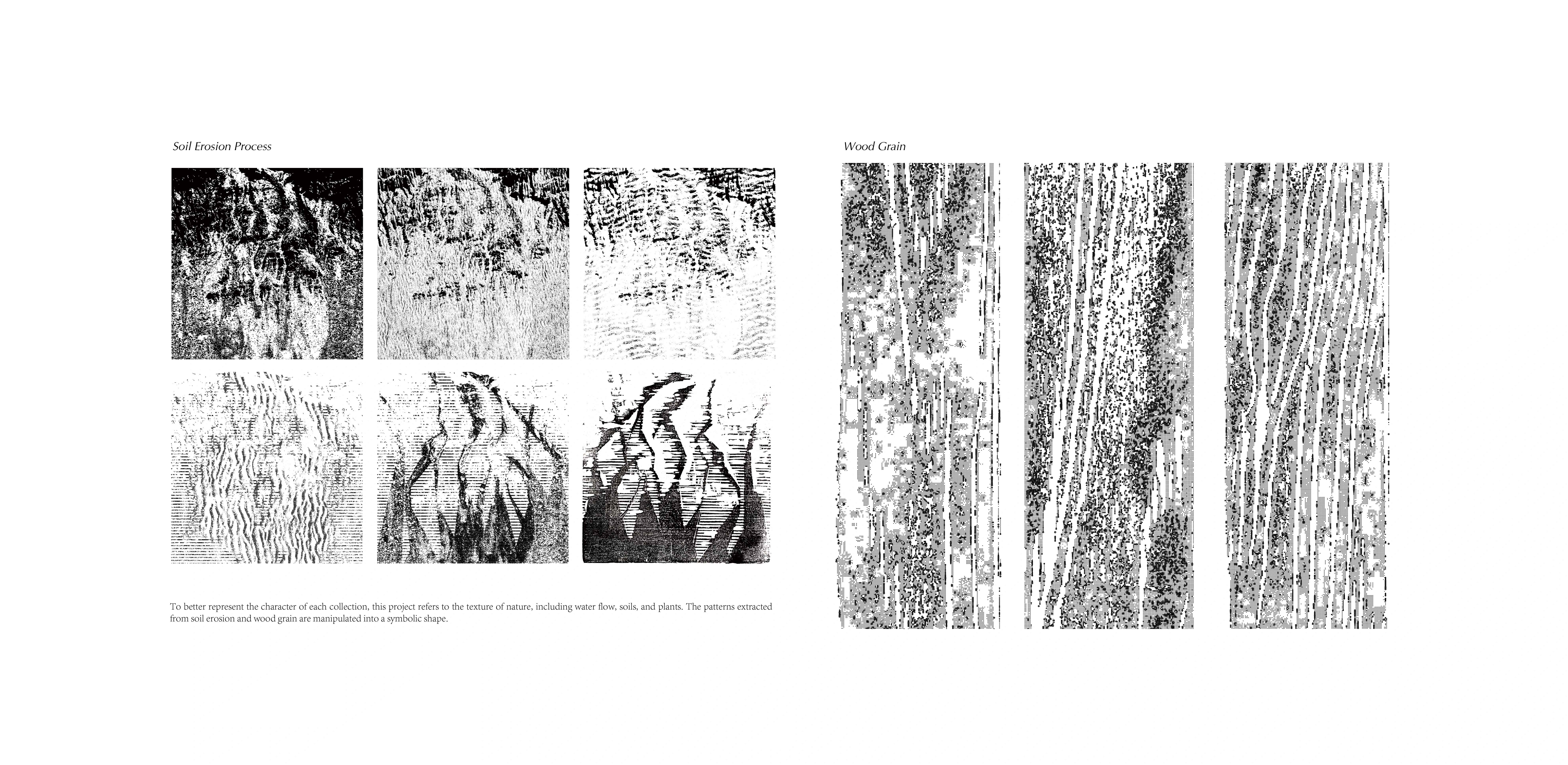 To create an immersive experience that better represents the character of each collection, this project refers to the texture of nature, including water flow, soils, and plants. The patterns extracted from soil erosion and wood grain are manipulated into a symbolic shape. Following the existing topography and elevation, this pattern helps create an internal hydrological system that collects water upstream and retains moisture on the site. Cross-stream strips connect the higher ground with the river’s edge and allow visitors to move between the two as well.