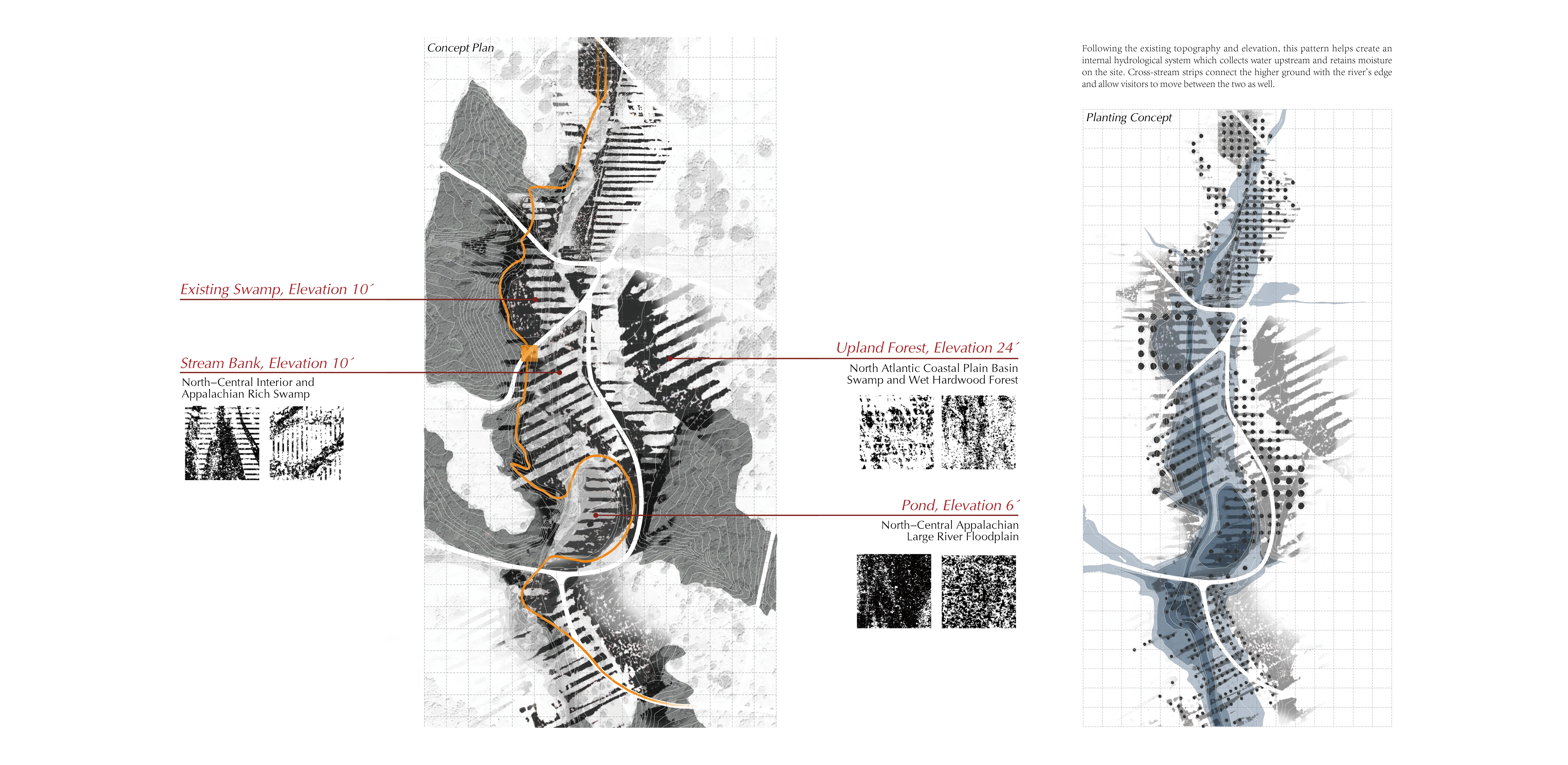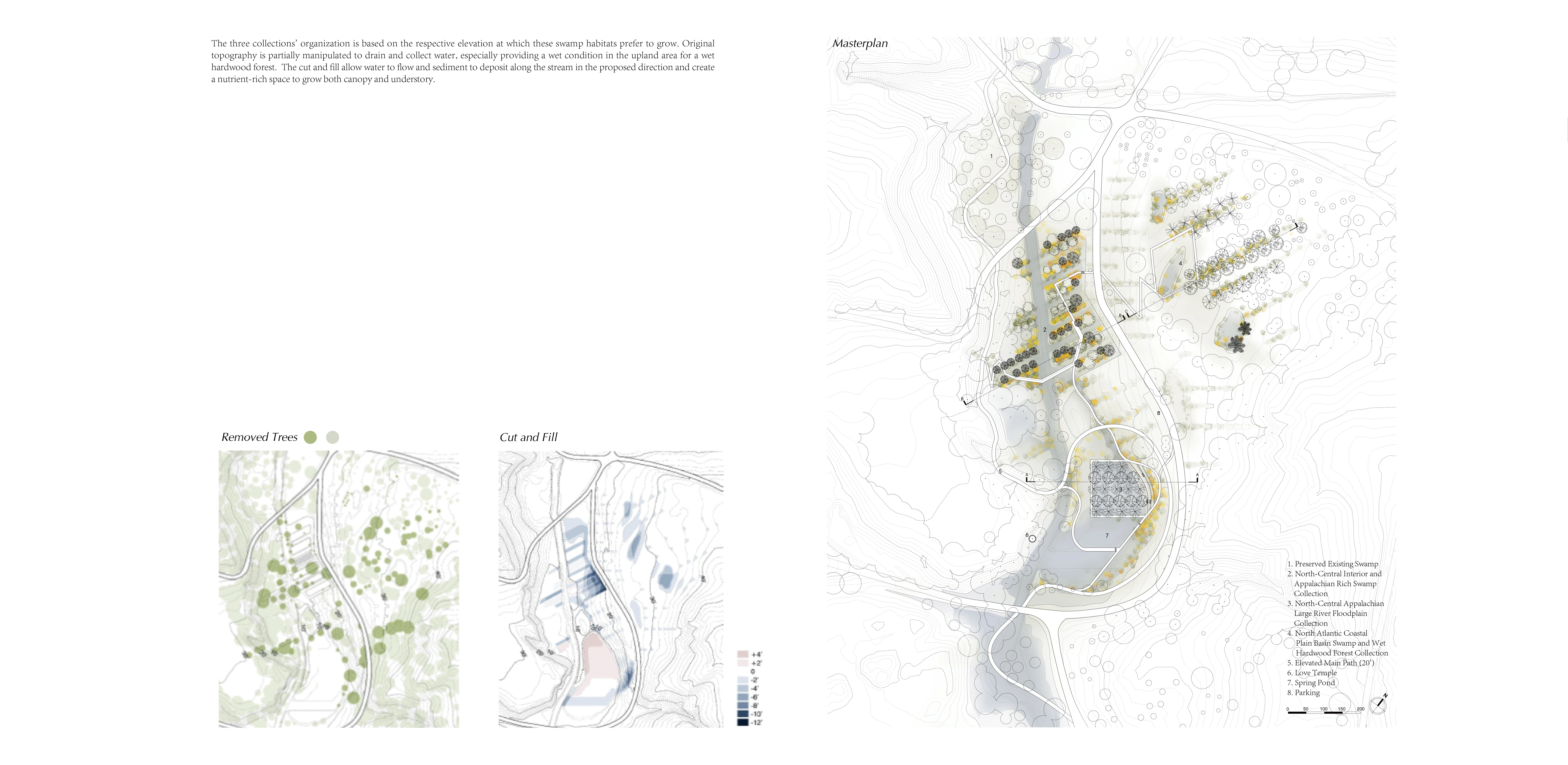 The three collections’ organization is based on the respective elevation at which these swamp habitats prefer to grow. Original topography is partially manipulated to drain and collect water, especially providing a wet condition in the upland area for a wet hardwood forest. The cut and fill allow water to flow and sediment to deposit along the stream in the proposed direction and create a nutrient-rich space to grow both canopy and understory.