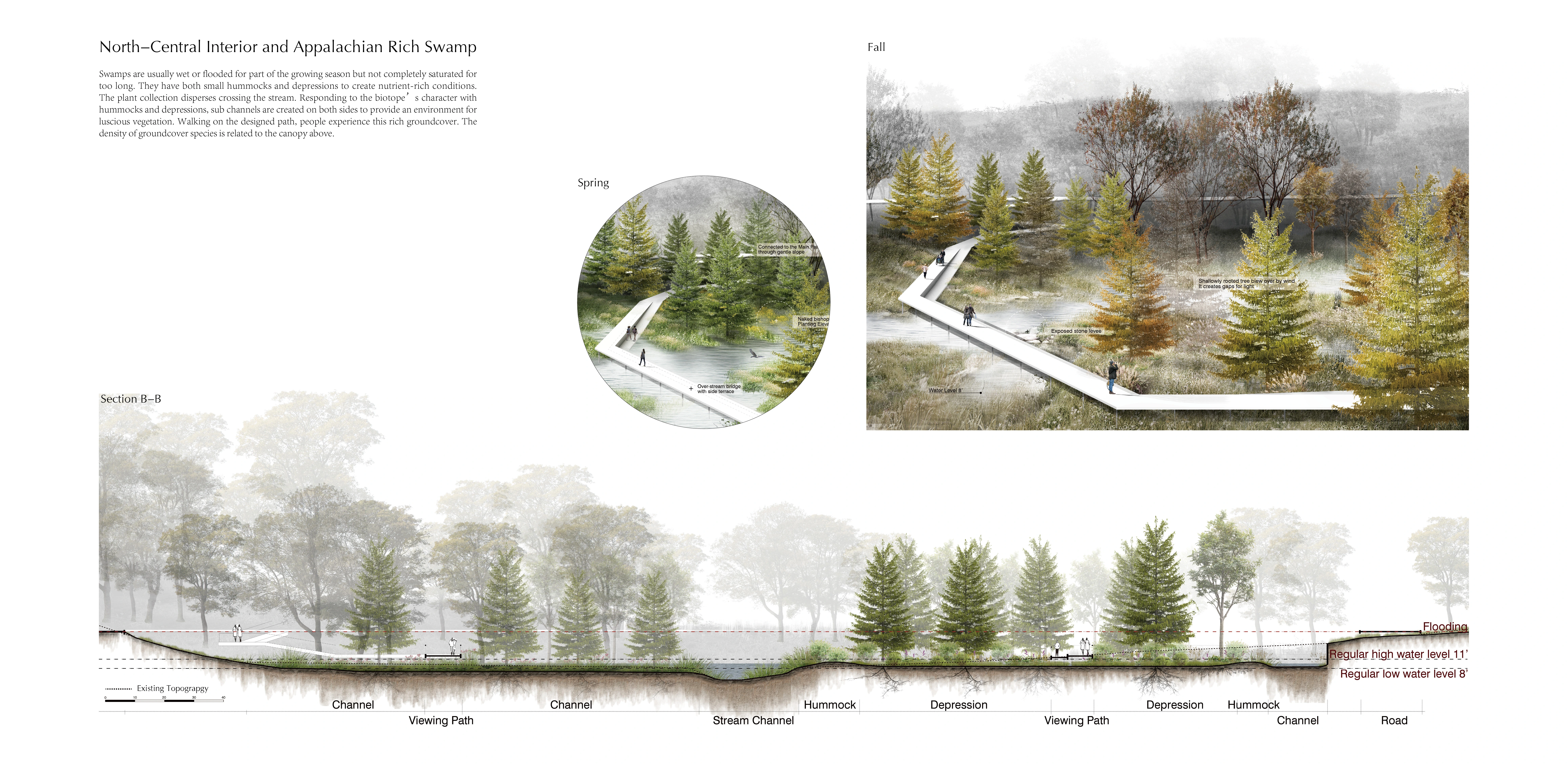 North-Central Interior and Appalachian Rich Swamp - Swamps are usually wet or flooded for part of the growing season but not completely saturated for too long. They have both small hummocks and depressions to create nutrient-rich conditions. The plant collection disperses crossing the stream. Responding to the biotope’s character with hummocks and depressions, sub channels are created on both sides to provide an environment for luscious vegetation. Walking on the designed path, people experience this rich groundcover. The density of groundcover species is related to the canopy above.