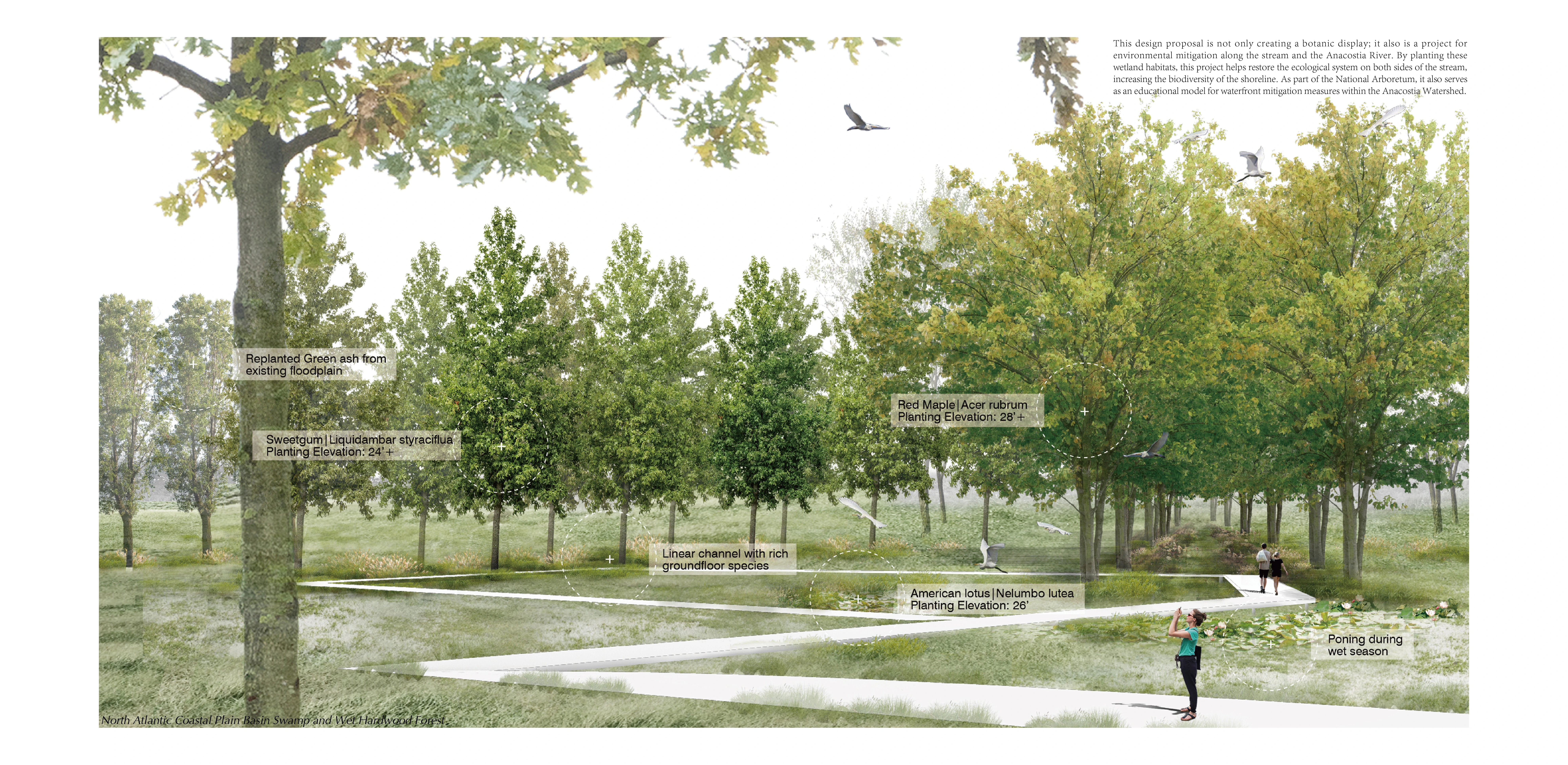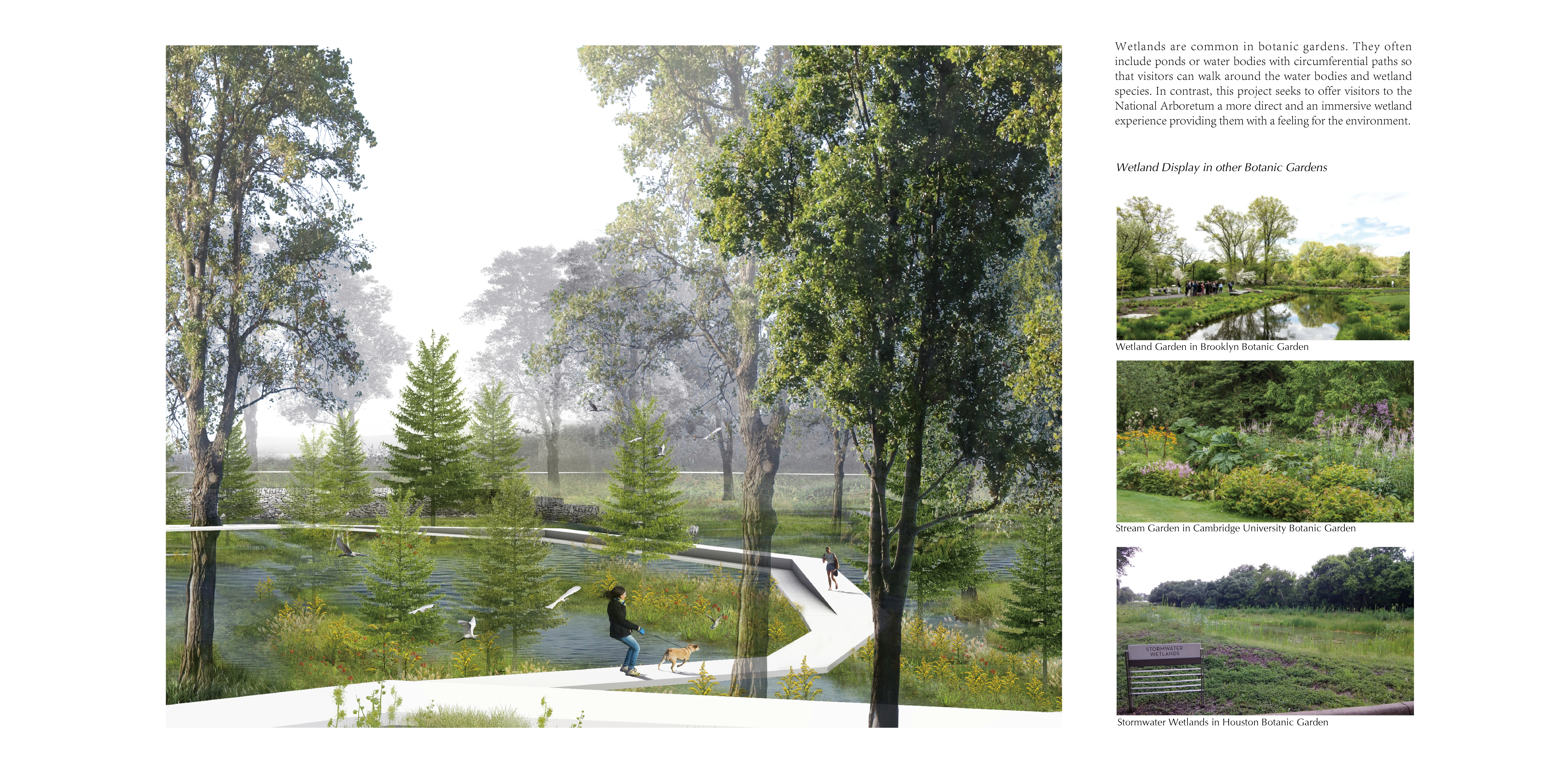 The National Arboretum is located on the west side of the Anacostia River, surrounded by natural wetlands. However, these areas are isolated and not easily accessible to locals and visitors. The wetlands along the Anacostia River are invisible, inaccessible, and their size continues to decrease. Wetlands are common components of botanic gardens. There are often displayed as ponds or water bodies with circumferential paths. However, to educate people about wetlands, it is important to provide them with more direct and immersive experiences of this biotope type so they can feel the environment as a whole.