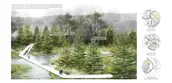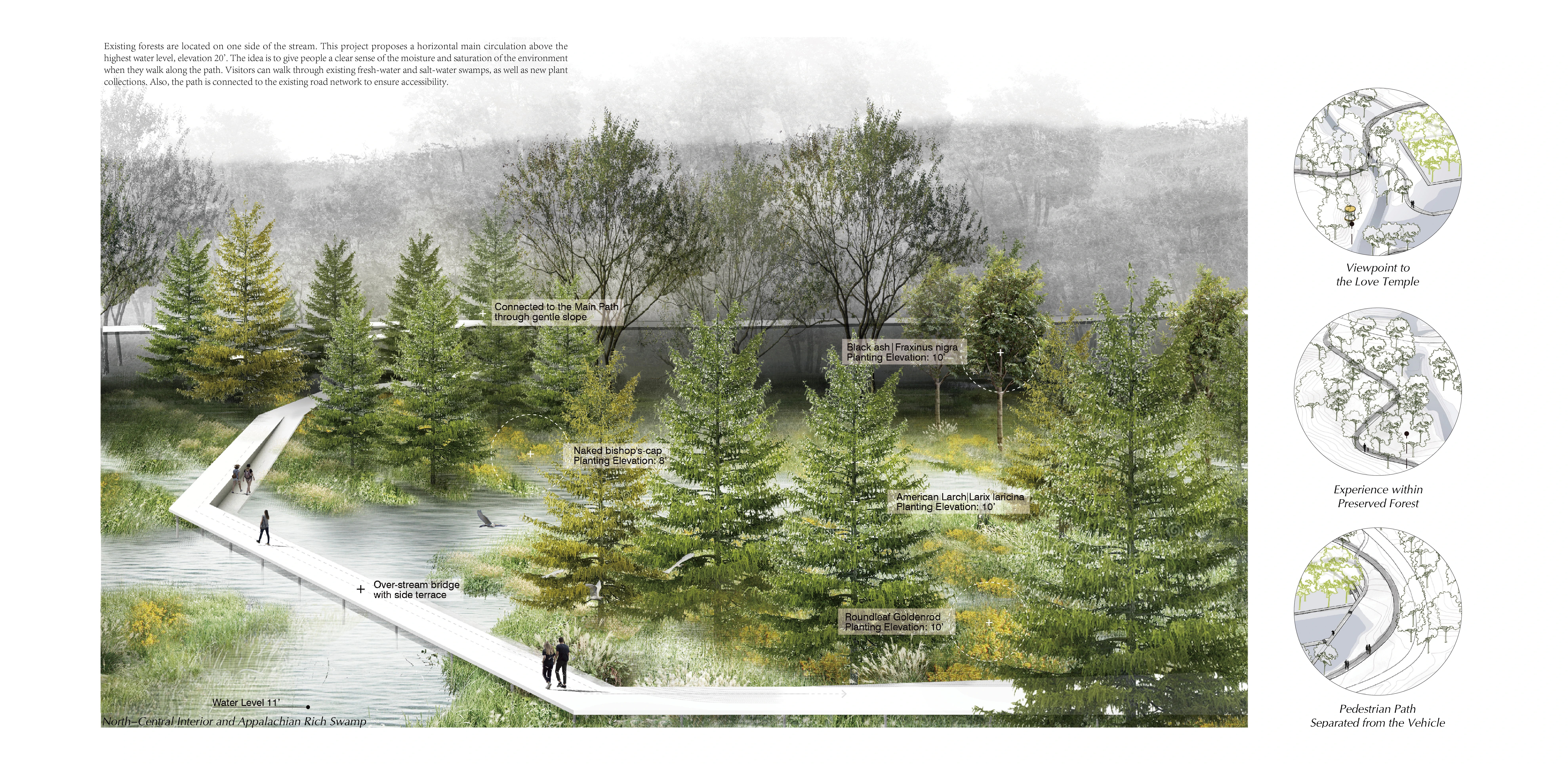 Existing forests are located on one side of the stream. This project proposes a horizontal main circulation above the highest water level, elevation 20’. The idea is to give people a clear sense of the moisture and saturation of the environment when they walk along the path. Visitors can walk through existing fresh-water and salt-water swamps, as well as new plant collections. Also, the path is connected to the existing road network to ensure accessibility.