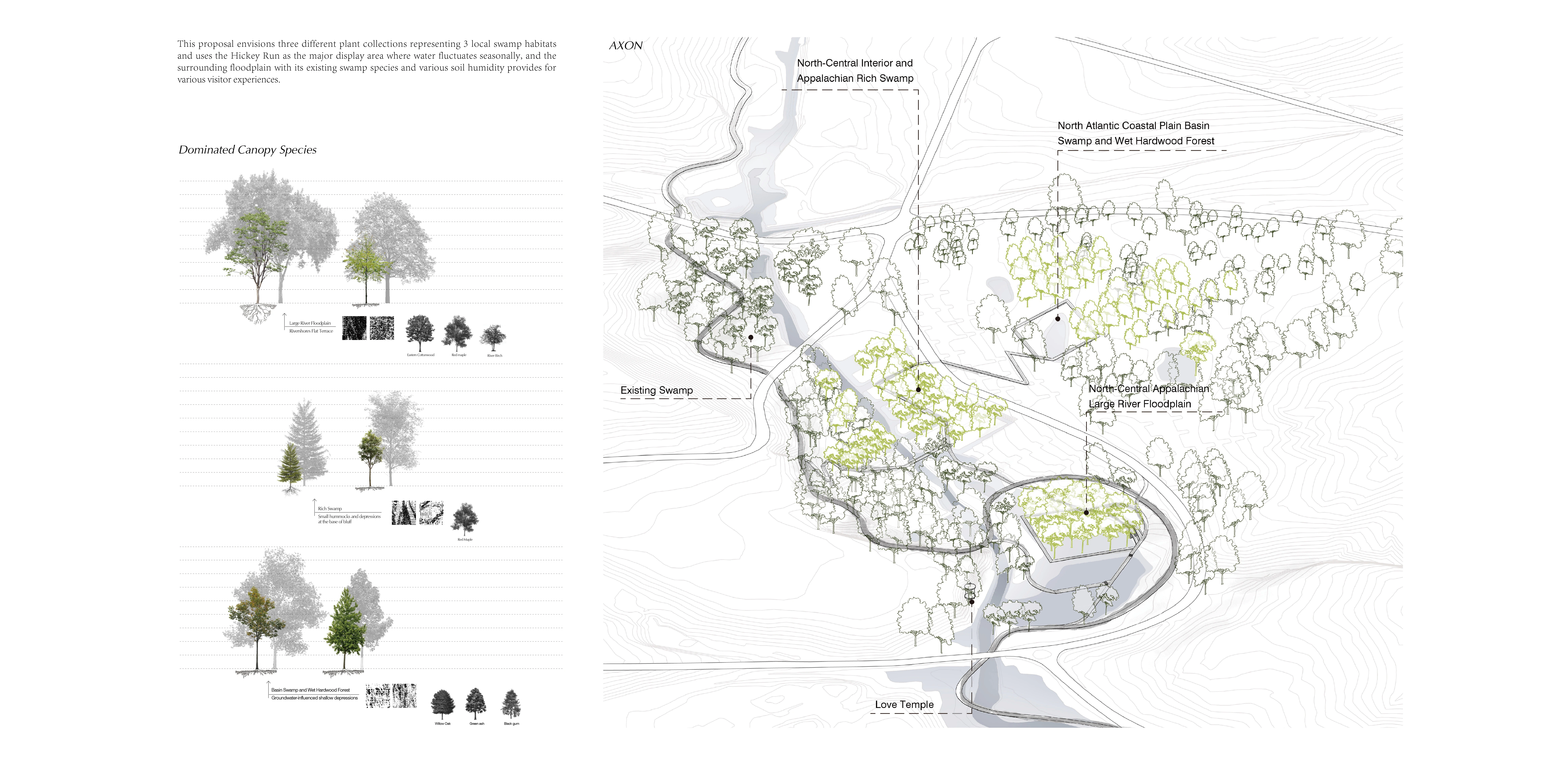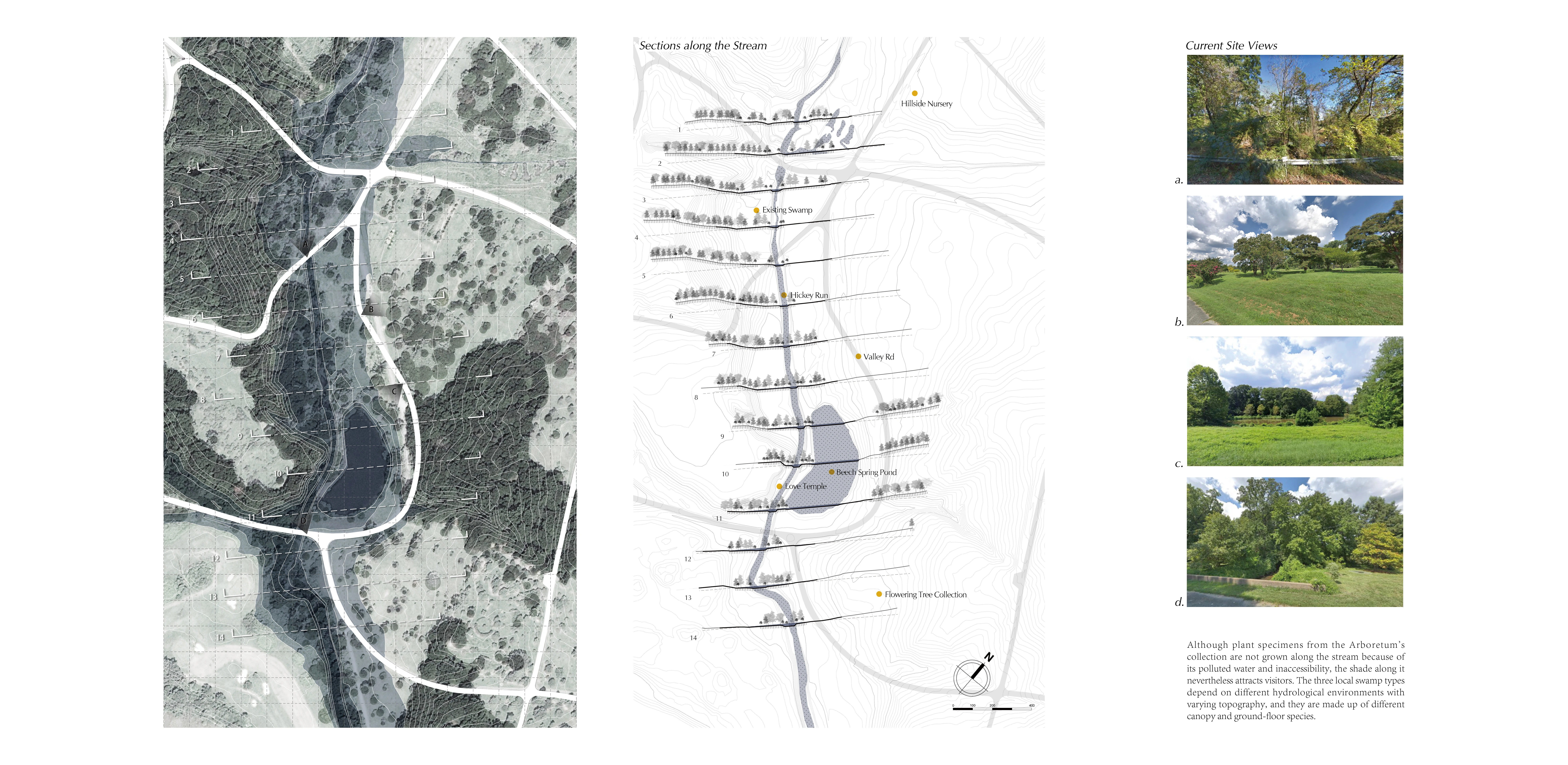 This proposal envisions three different plant collections representing 3 local swamp habitats and uses the Hickey Run as the major display area where water fluctuates seasonally, and the surrounding floodplain with its existing swamp species and various soil humidity provides for various visitor experiences.