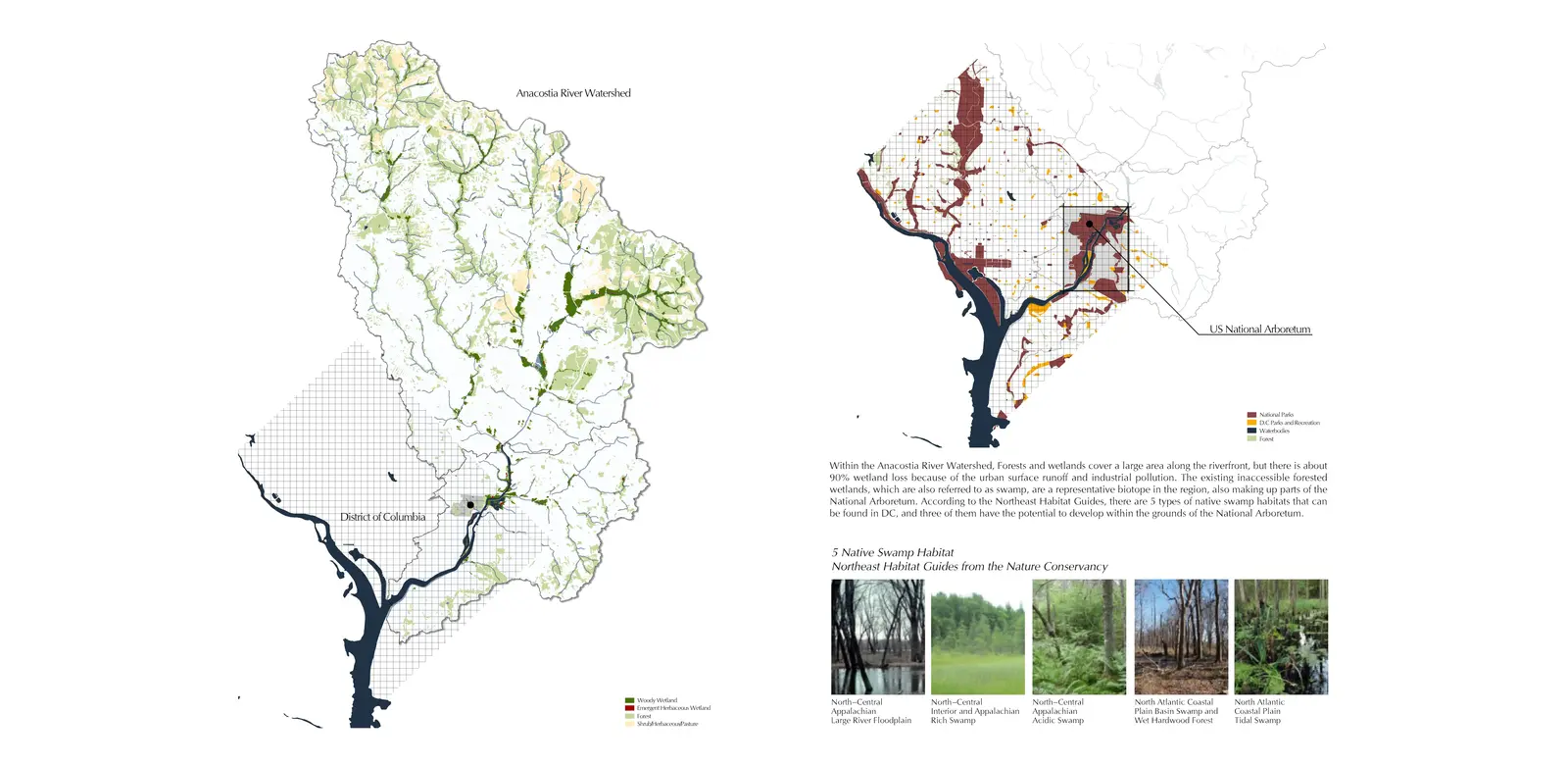 Within the Anacostia Watershed, Forests and wetlands cover a large area along the riverfront, but there is about 90% wetland loss because of the urban surface runoff and industrial pollution. The existing inaccessible forested wetlands, which are also referred to as swamps, are a representative biotope in the region, also making up parts of the National Arboretum. According to the Northeast Habitat Guides, there are 5 types of native swamp habitats that can be found in DC, and three of them have the potential to develop within the grounds of the National Arboretum.