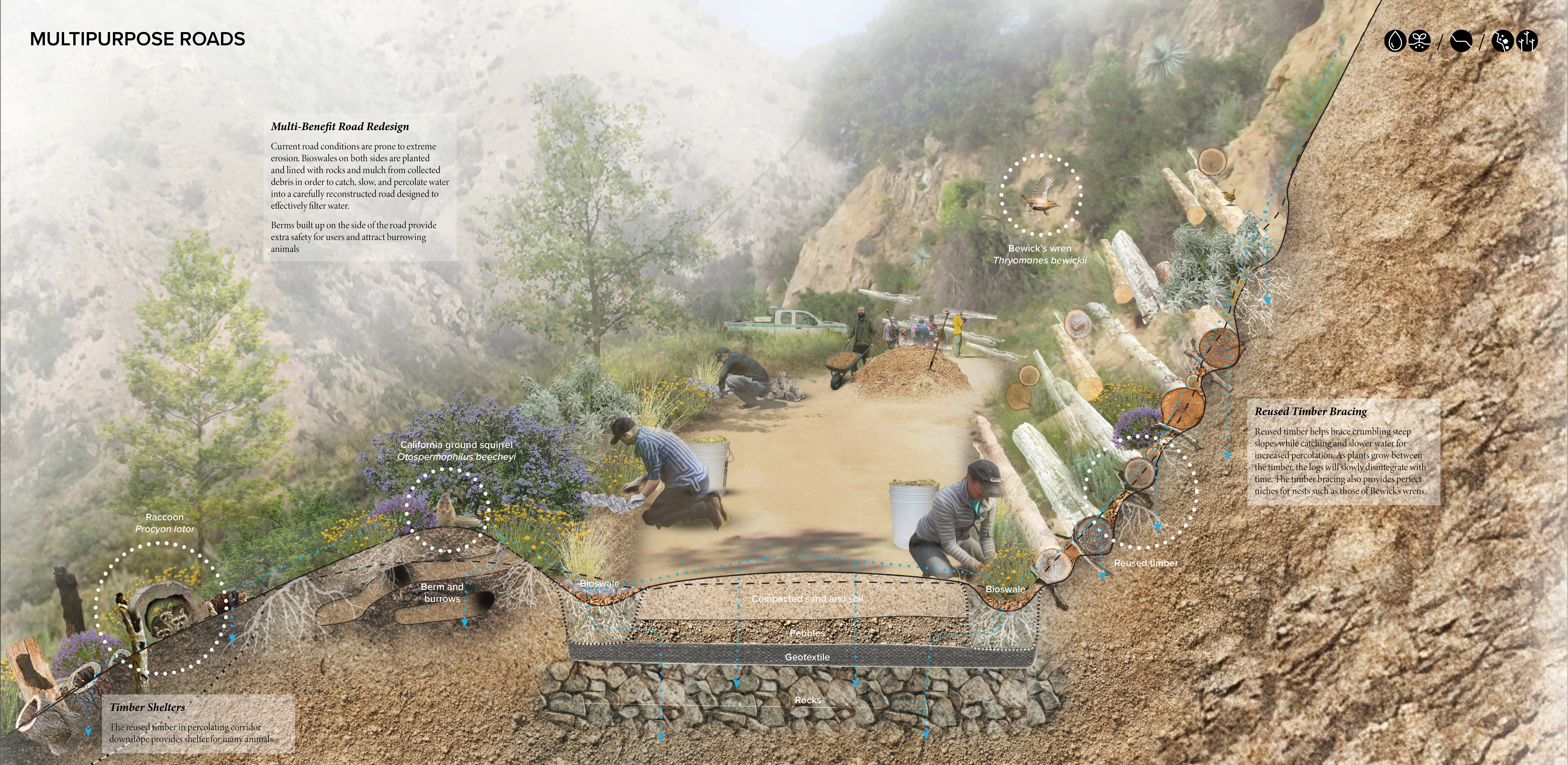 Along steeper slopes and narrow canyons, zeedyk structures and boulder infiltration matrices slow water, reduce erosion, and help catch seeds that germinate and initiate regrowth of native flora. Multipurpose roads and trails are lined by bioswales that capture and infiltrate runoff into a percolating road typology. Steep slopes are braced by reused timber terracing to disperse the water runoff while creating nesting habitat. Berms enhance user safety while attracting burrowing animals whose tunnels increase percolation.