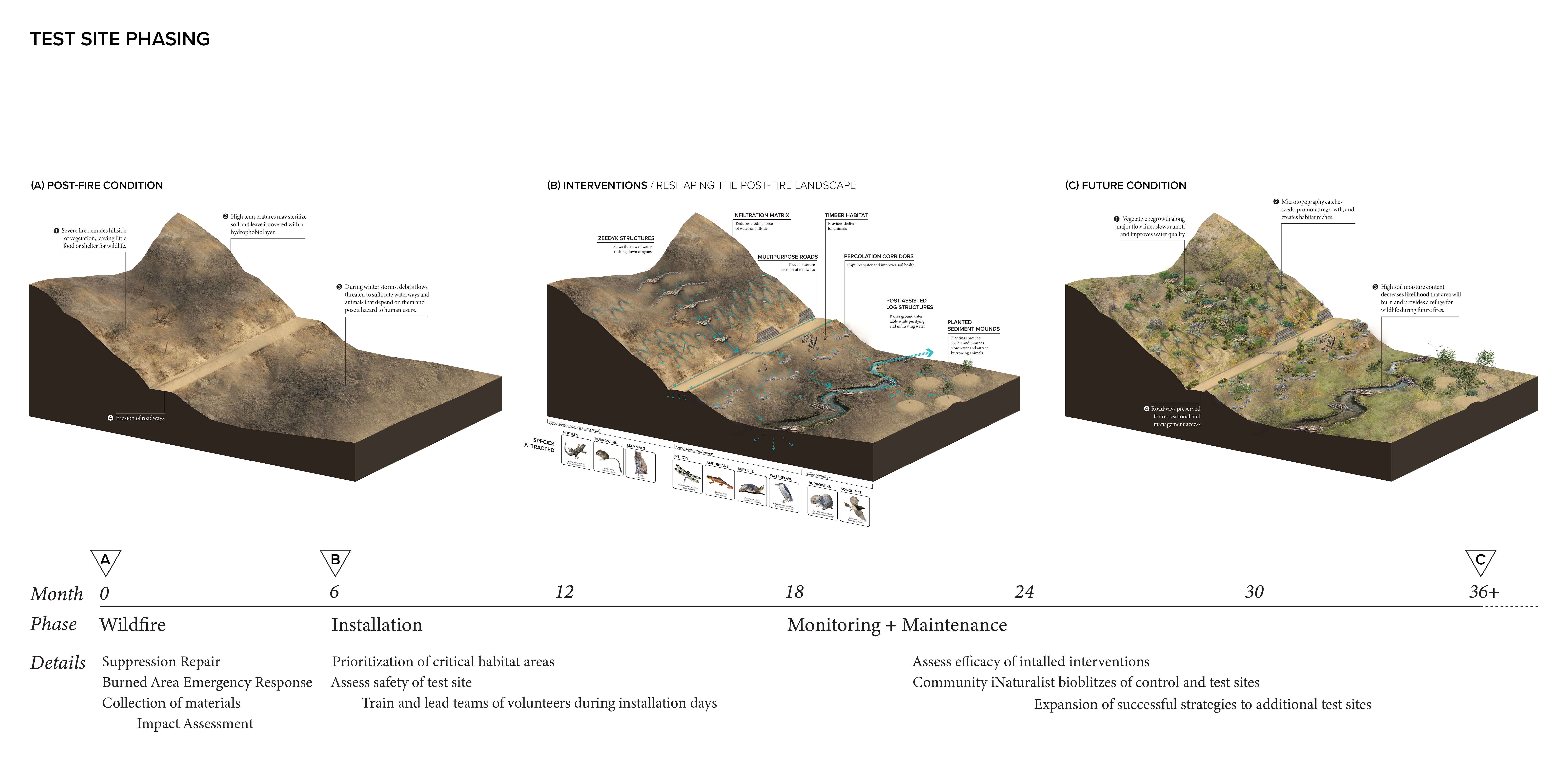 These animals’ adaptations to and relationships with wildfire inspired the goals of a new framework for coexisting with wildfire by catalyzing regeneration of habitats niches to support ecological resilience. Framework goals include increasing soil moisture (BEAVER), developing a mosaic of ecosystems (WOODPECKER), promoting dynamic stability (BEETLE), and supporting soil ecosystem services (GROUND SQUIRREL). We then developed interventions that reshape the land over time through natural processes, promote recovery and adaptation, and provide for wildlife. These interventions respond to local topography while strategically reusing "waste" materials produced by wildfire cycles and management.