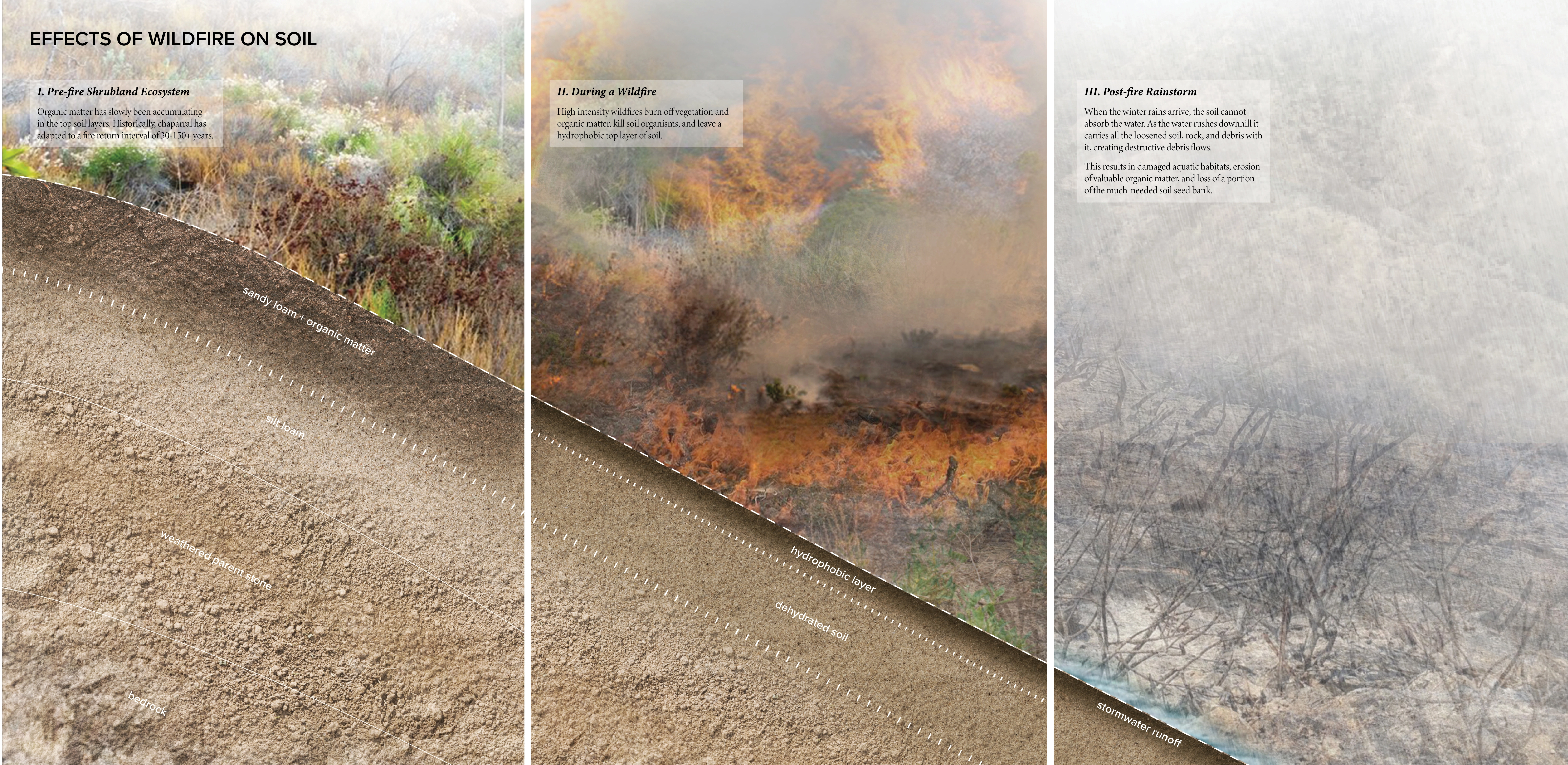In this new framework for coexisting with wildfire systems, interventions respond to local topography, strategically reuse materials produced by wildfire cycles, and engage the community in land care. The post-fire landscape is re-imagined as an opportunity to reshape the land over time through natural processes, promote recovery and adaptation, and provide for wildlife.