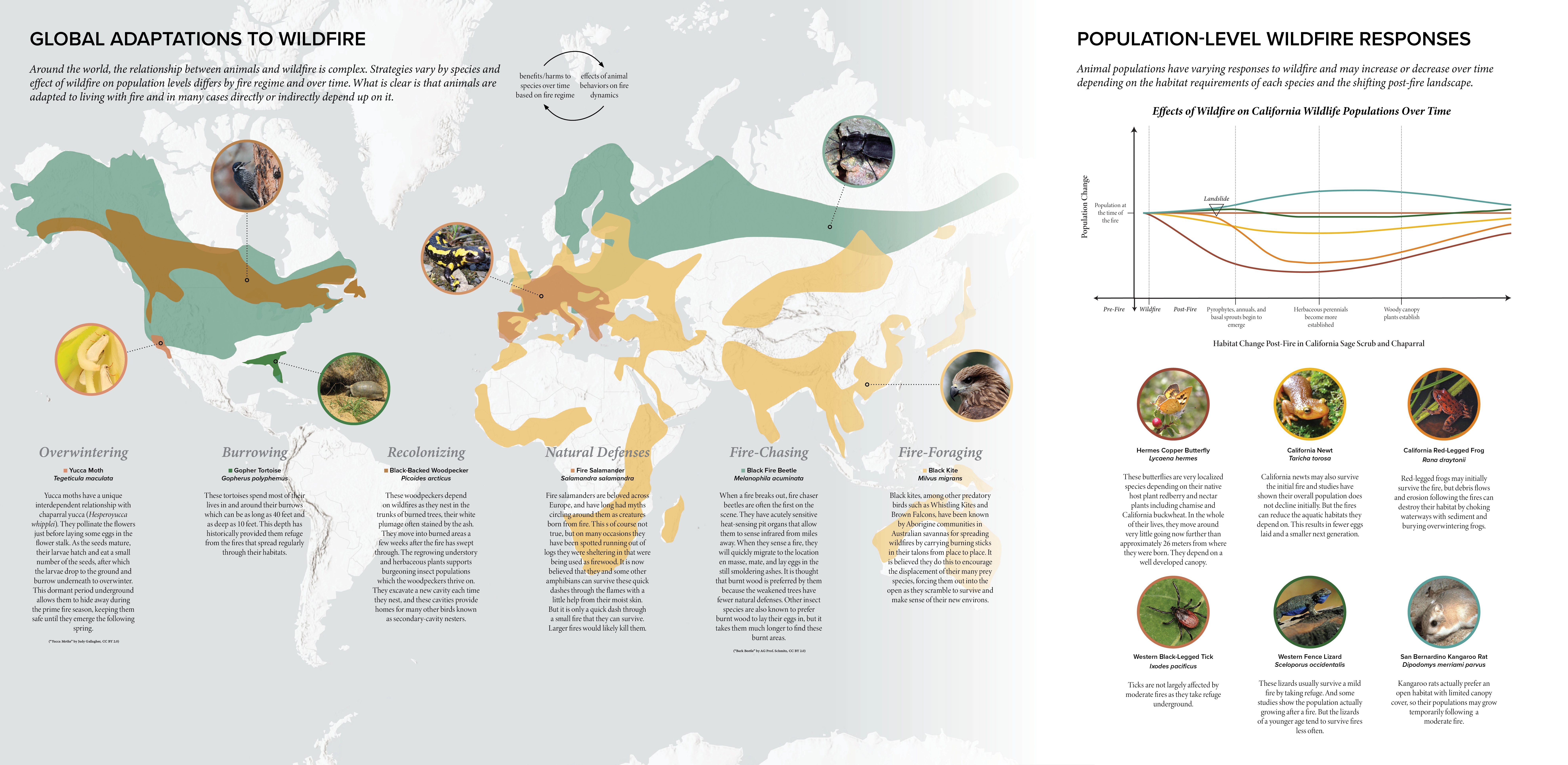During a year-long research and design inquiry, we started investigating wildlife adaptations to fire. We were amazed by the complex strategies that wildlife have developed around the world, from gopher tortoises whose deep burrows provide refuge during a fire to black kites that spread burning tinder to scatter prey. In California, species populations may benefit or suffer from wildfires depending on their individual habitat requirements. For example, while the kangaroo rat may actually benefit from a fire as they prefer a more open habitat, other animals such as the endangered red legged frogs may survive the fire in their aquatic habitats, but suffer from the debris flows that follow.