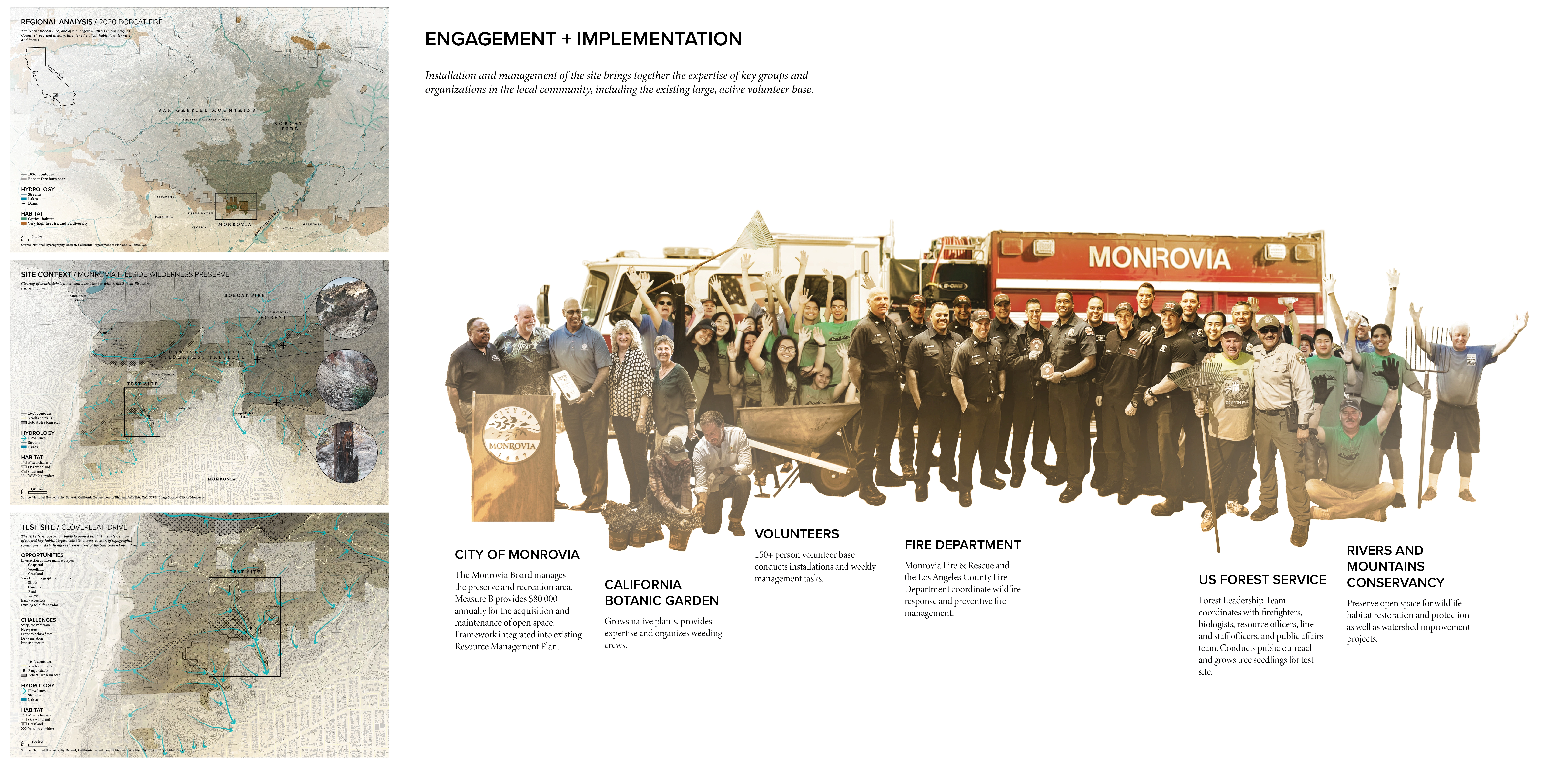 To identify a test site for our framework, we homed in on the Monrovia Hillside Wilderness Preserve, a beloved, community-managed preserve and hiking spot affected by the 2020 Bobcat Fire, one of the largest wildfires in Los Angeles County’s recorded history. The Bobcat Fire left in its wake debris flows, erosion, and burnt brush and timber that we could recycle into our strategies. At Cloverleaf Drive, which is easily accessible to pedestrians and vehicles, several key habitat types intersect, and there are a variety of topographic conditions and challenges representative of the San Gabriel Mountains.