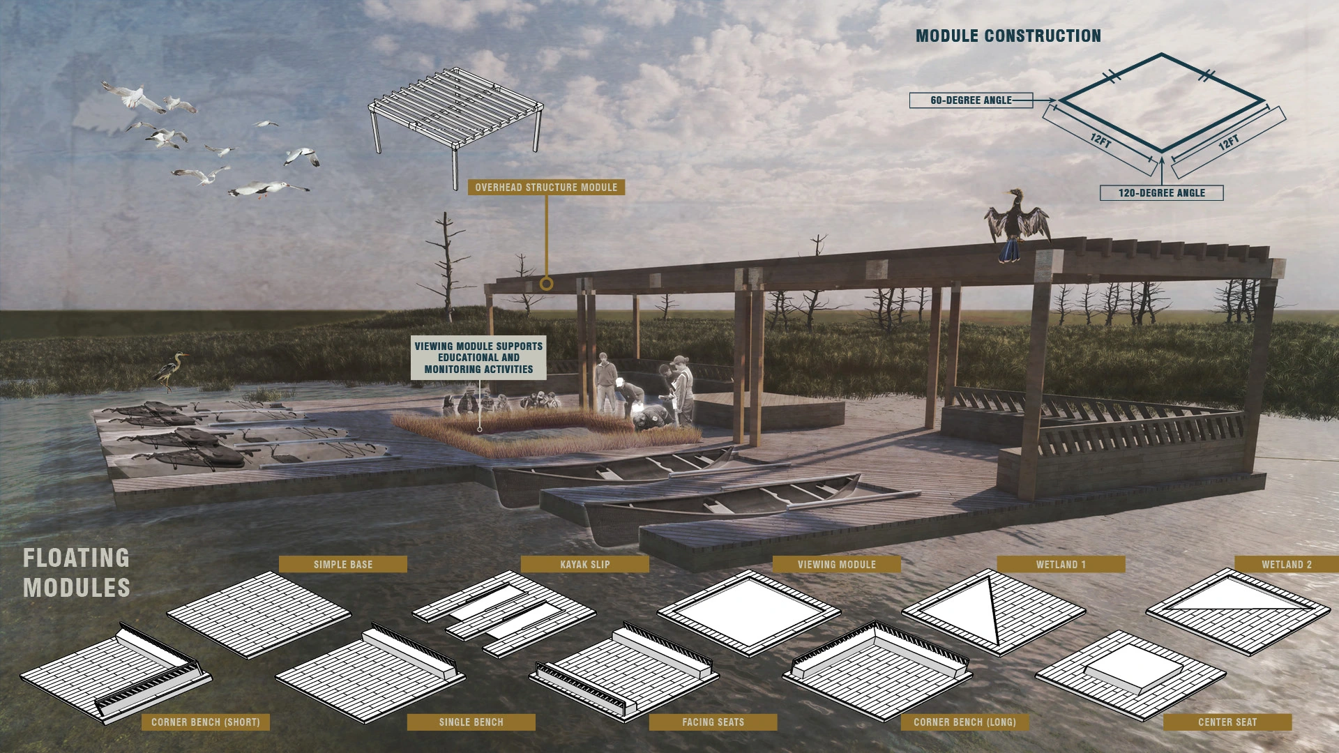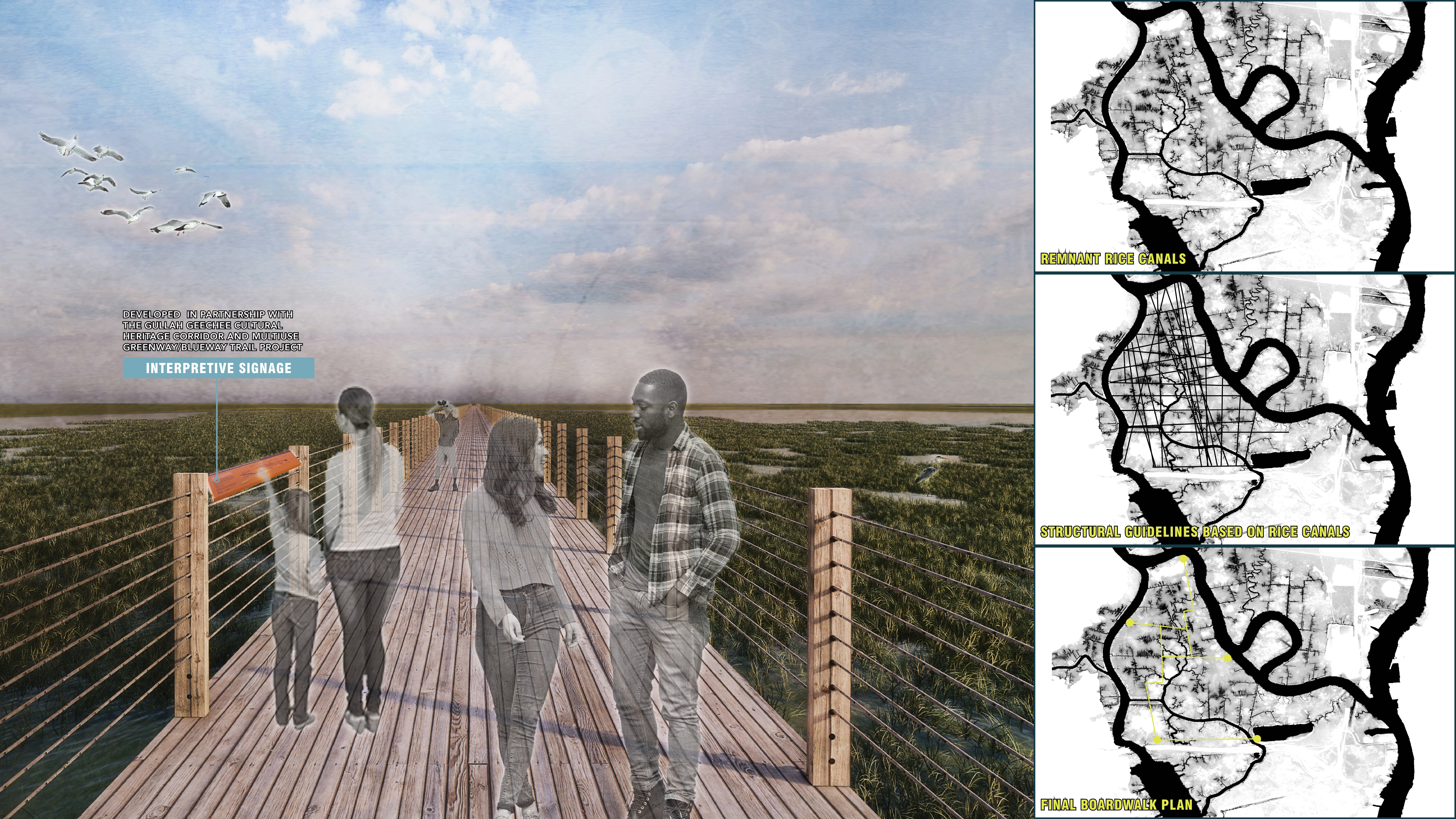 Eagles Island is a landscape of brutality and exploitation: from the forced Gullah Geechee labor that dug the rice canals and cultivated Carolina Gold Rice, to the piling of toxic dredge spoils, to the current short-sighted plans to build a hotel amidst a sensitive ecosystem. But this landscape is also one of possibility. Our team envisions a future where design facilitates healing these harms through three main goals: connect, adapt, and inspire.