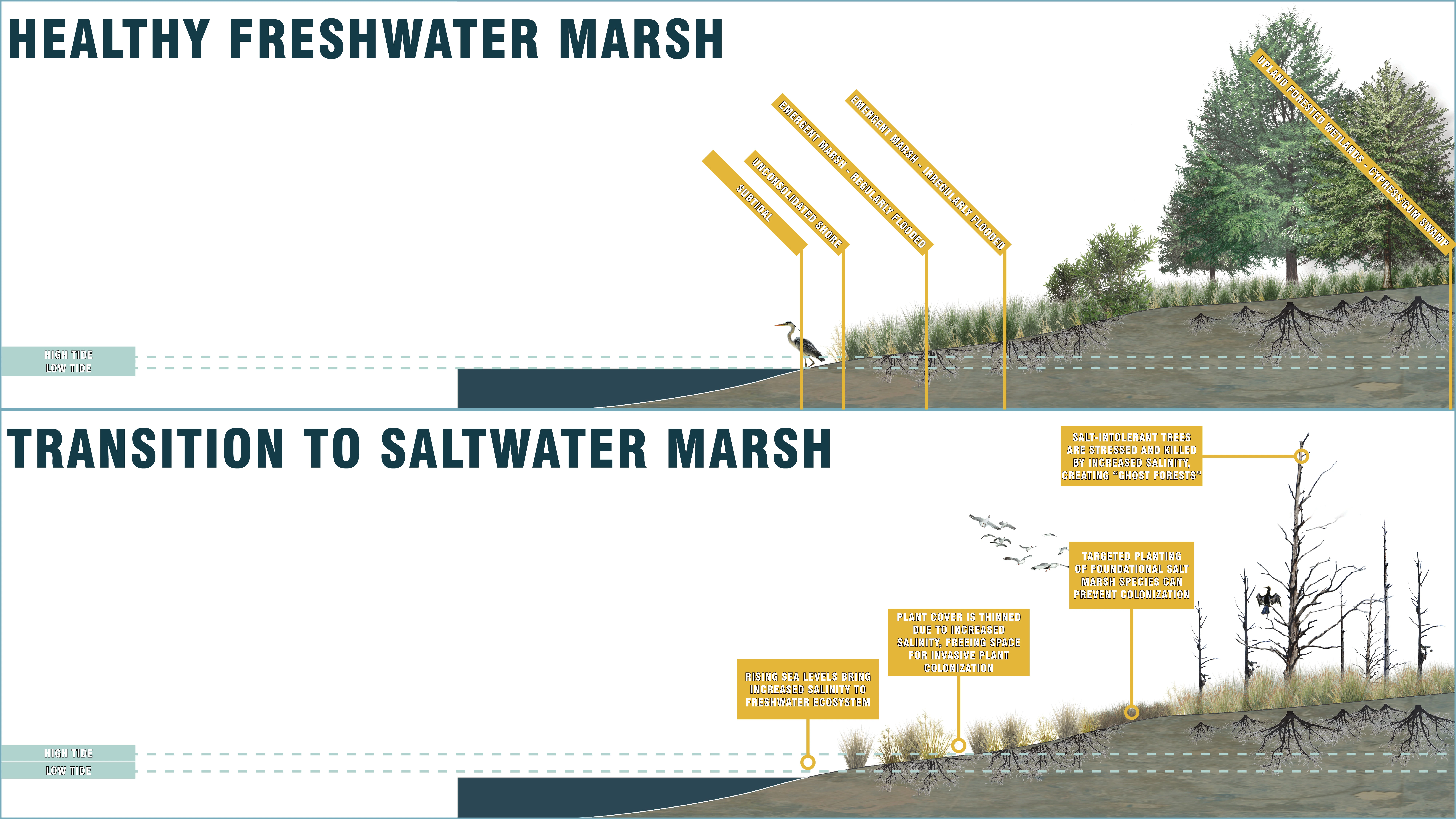 One of the most significant drivers of change at Eagles Island is sea-level rise. The latest NOAA projections published in February 2022 indicate that sea level will rise at least one foot by 2050, regardless of interventions to lower greenhouse gas emissions. By using NOAA marsh migration maps, we gained a better understanding of what the future conditions might look like on Eagles Island – how the current tidal freshwater marsh will transition to saltmarsh and later to unconsolidated shore. Shifts in USDA hardiness zones and salinity indicate future shifts in habitat range for flora and fauna, and analyzing these shifts inspired our multi-generational approach to the site.