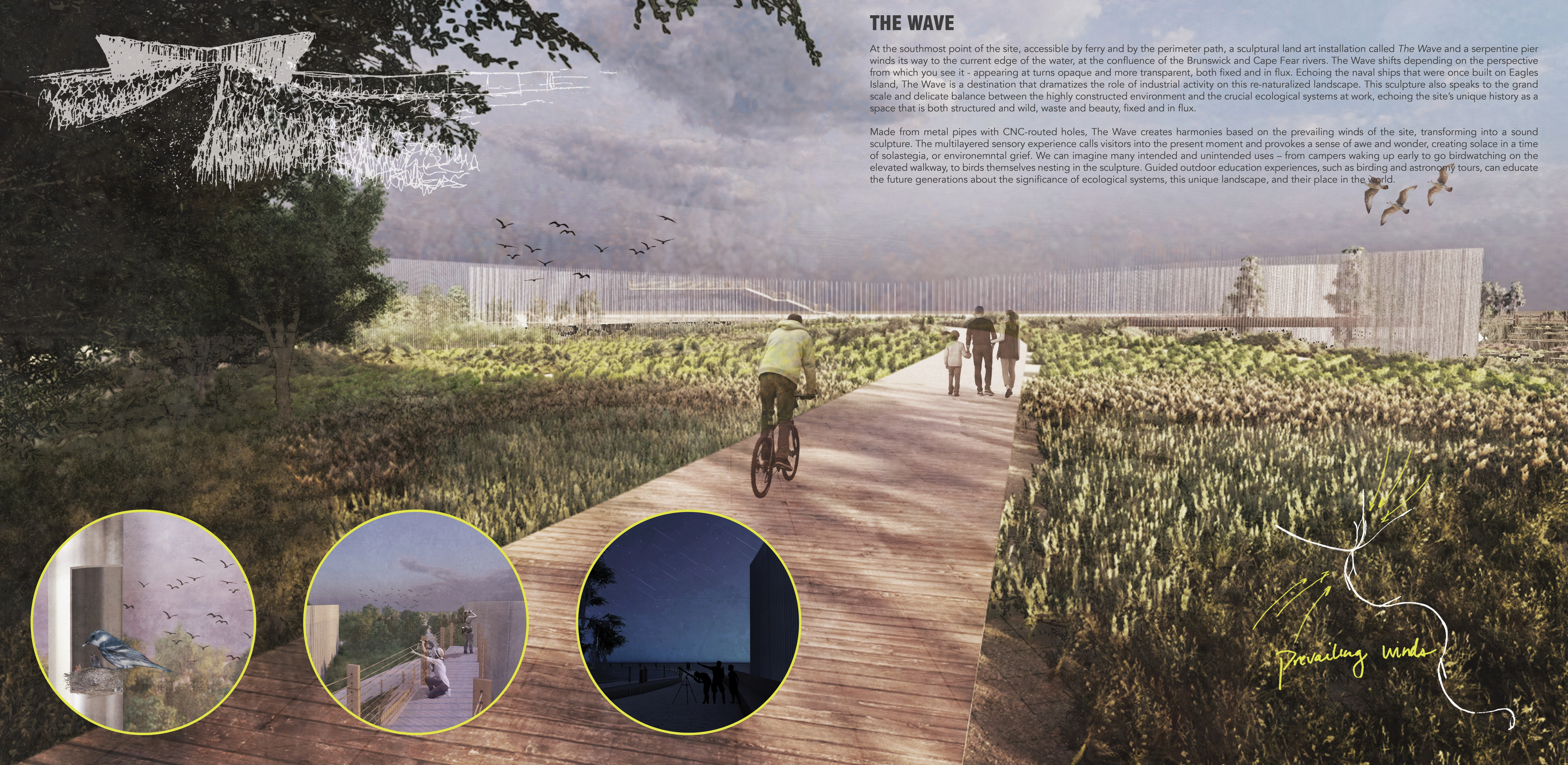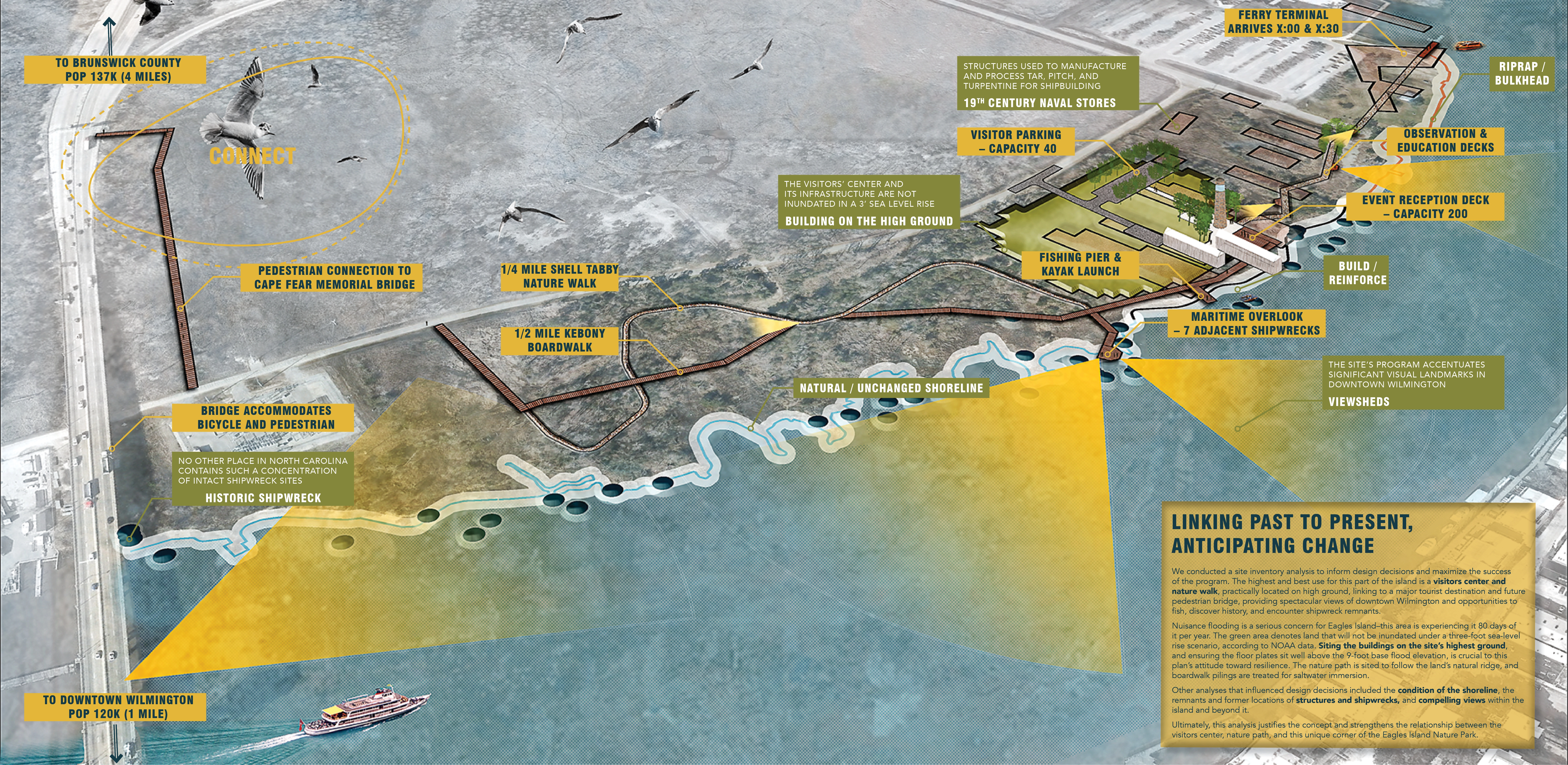 The proposal challenges the plan for a hotel on the high ground near the Battleship, North Carolina, instead using this land for a Visitors' Center. The Center is a major node, introducing visitors to the complex natural systems at work throughout the island and providing access to the reimagined dredge spoils and historic rice canals as the launch point of our park ferry system. Accessible by a ferry from downtown Wilmington, the Center draws people to the island.