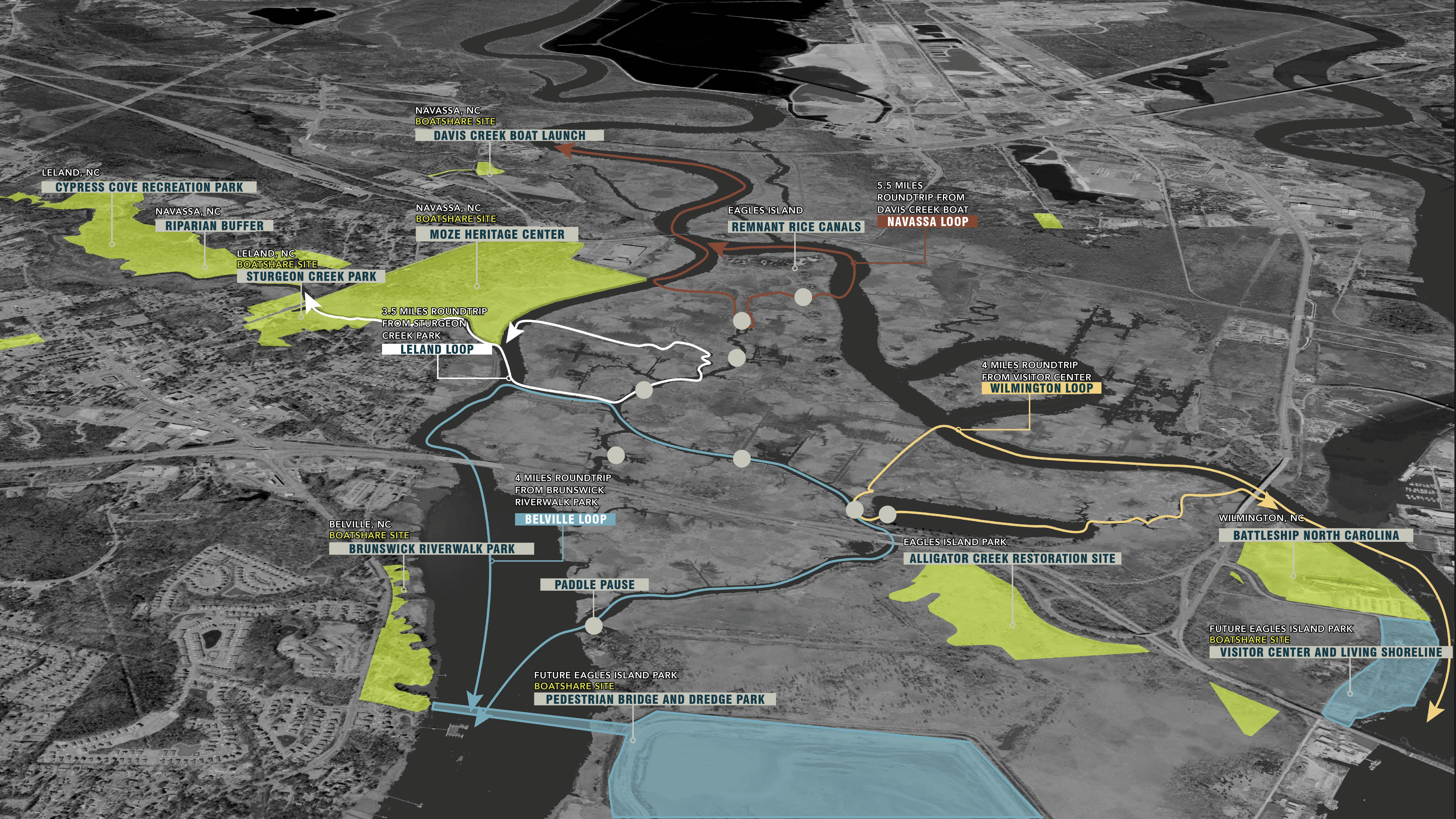 The plan supports connections to other community centers, reaching out along the western edge of the park to engage Belville, Leland, and Navassa across the Brunswick River. A pedestrian bridge from Brunswick Riverwalk Park in Bellville will provide community access directly to the reimagined dredge spoils, with this site chosen because of its proximity to a Belville school and potential to facilitate educational experiences. A concentration of boat-share rental sites in Leland and Navassa parks will allow these communities to explore the remnant rice canals built by the Gullah Geechee people.
