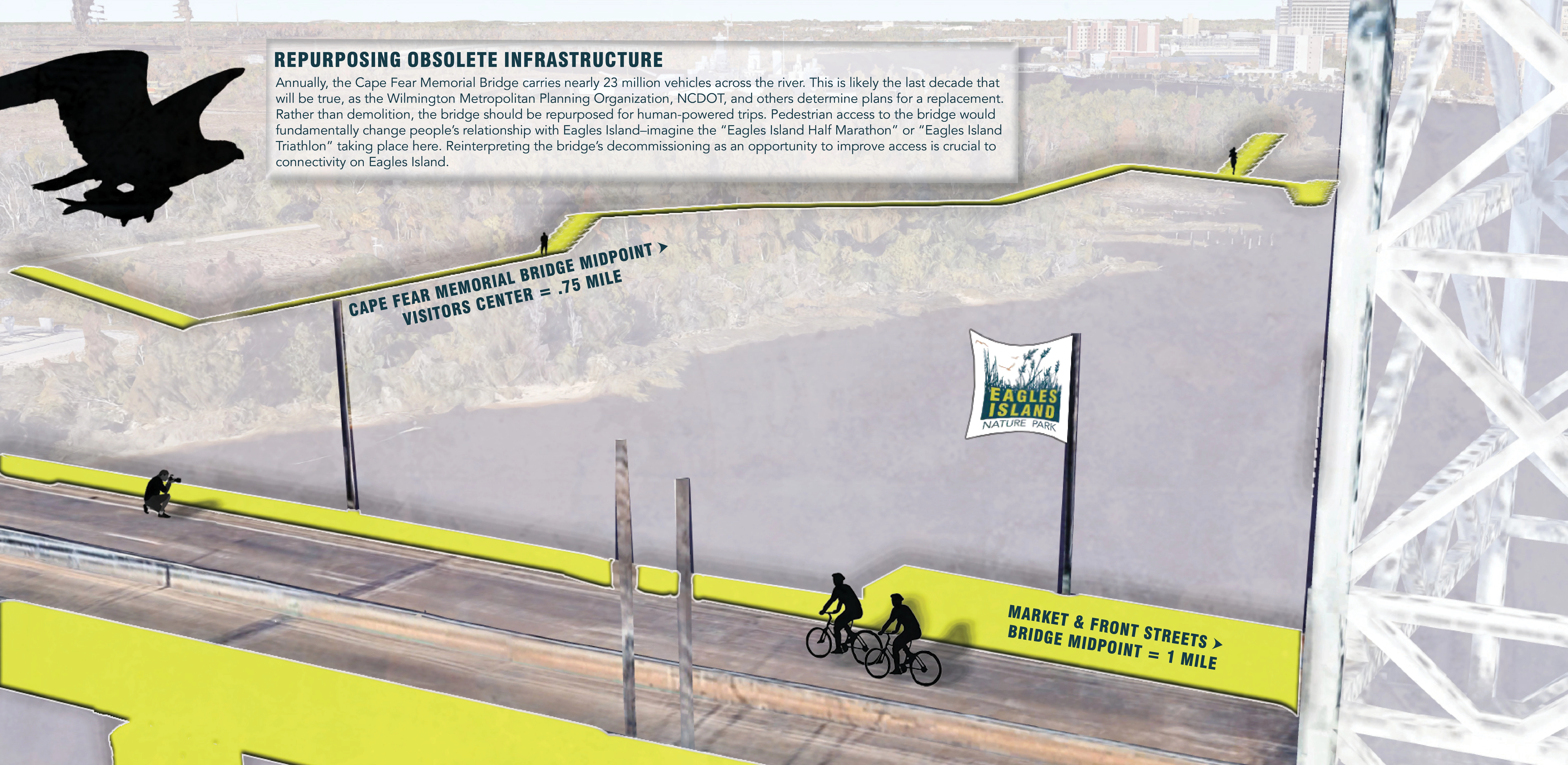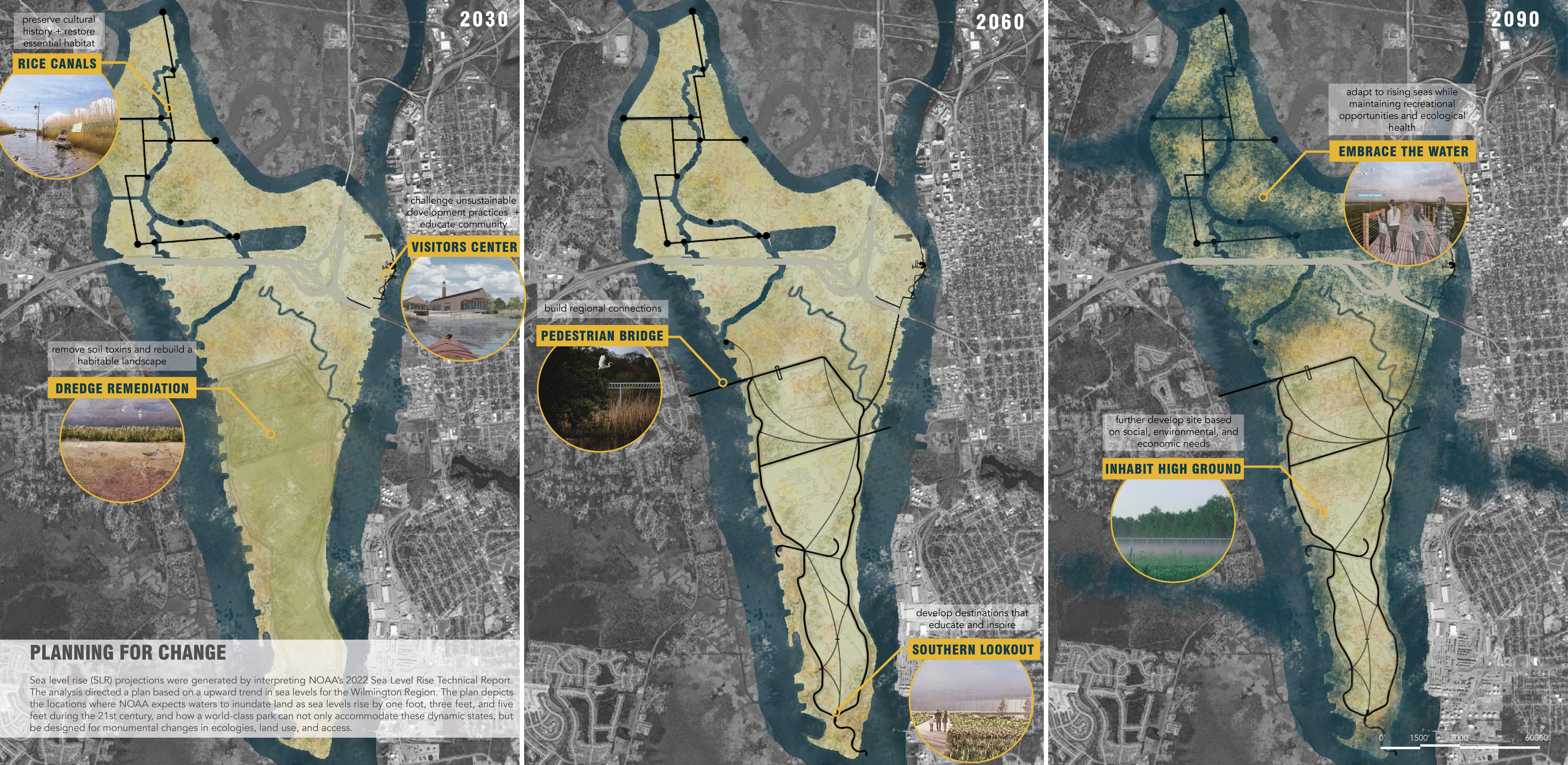 Adaptation drives the park’s design. The living shoreline surrounding the Visitor’s Center buffers against storm surge and, over time, evolves with rising water levels. Adaptive reuse of the Cape Fear Memorial Bridge saves the structure from demolition after its decommissioning and creates a vital, multi-modal connection between the park and its adjacent communities. Phytoremediation of the dredge spoils transforms a waste landscape into renewed habitat that supports a healthy upland ecosystem. Implementation of flexible floating dock systems, called Paddle Pauses, enable exploration of the rice canals in the near-term while allowing for new, future programs to support the developing ecological and cultural realities. By embracing future conditions, rather than fighting against them, this park proposal benefits multiple generations.