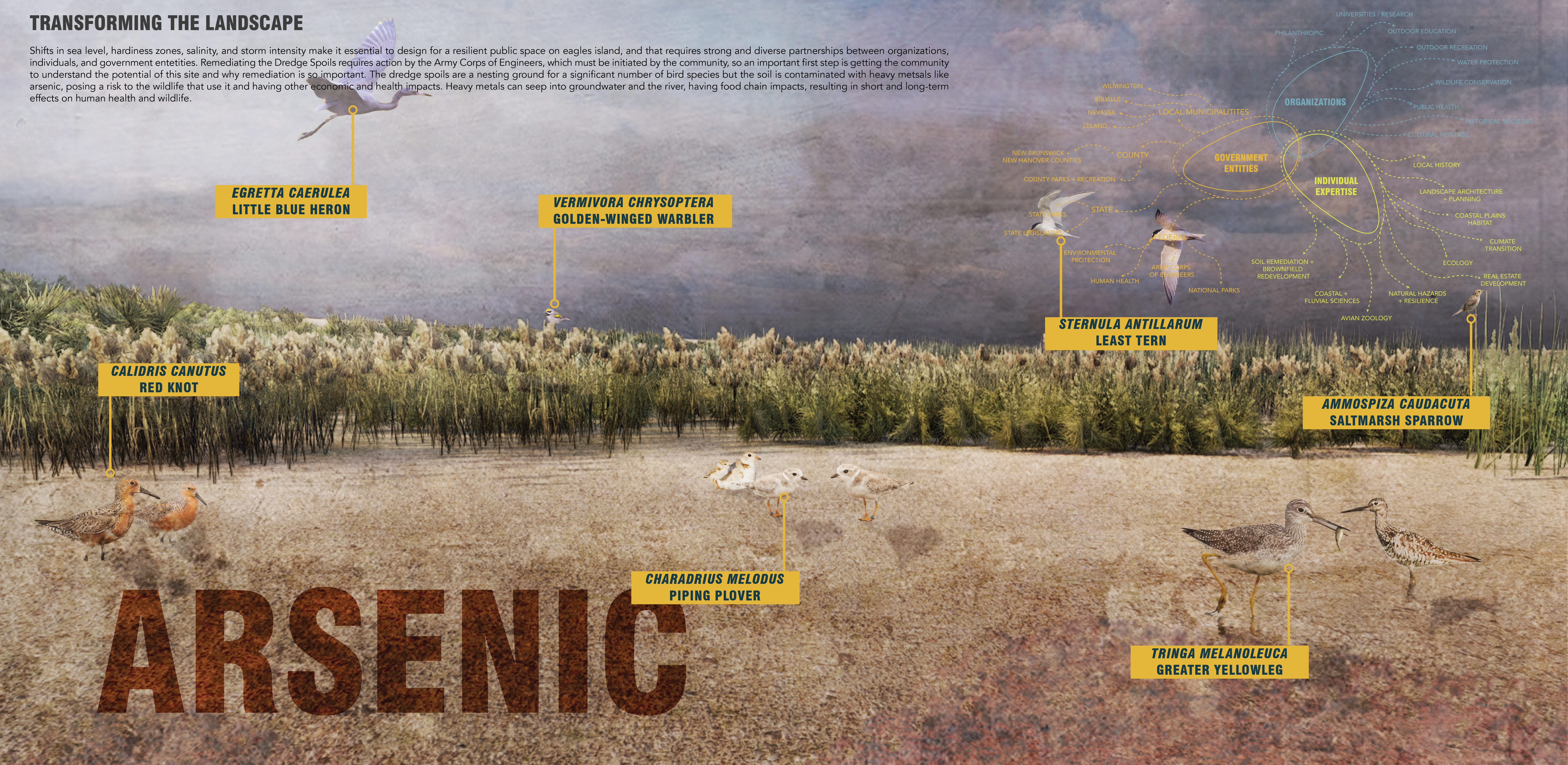 Analyzing extant habitat and vegetation revealed that Eagles Island is the largest area of tidal freshwater marsh habitat in North Carolina. This ecosystem serves as an important nursery for spawning aquatic and marine species. Much of the site also provides critical breeding, migratory, and all-season habitat for a number of bird species, and the dredge spoils area has been designated as a global-priority Audubon Important Bird Area (IBA). The dredge spoils, slated for decommissioning in 2032, are contaminated with heavy metals such as arsenic, posing a risk to the wildlife that use it and having other economic and human health impacts. Zooming out and examining the island’s position within the larger Cape Fear watershed revealed the likely reasons for the polluted spoils: the watershed is home to nearly a third of North Carolina’s population, is heavily industrialized, and receives runoff from a significant amount of farmland.