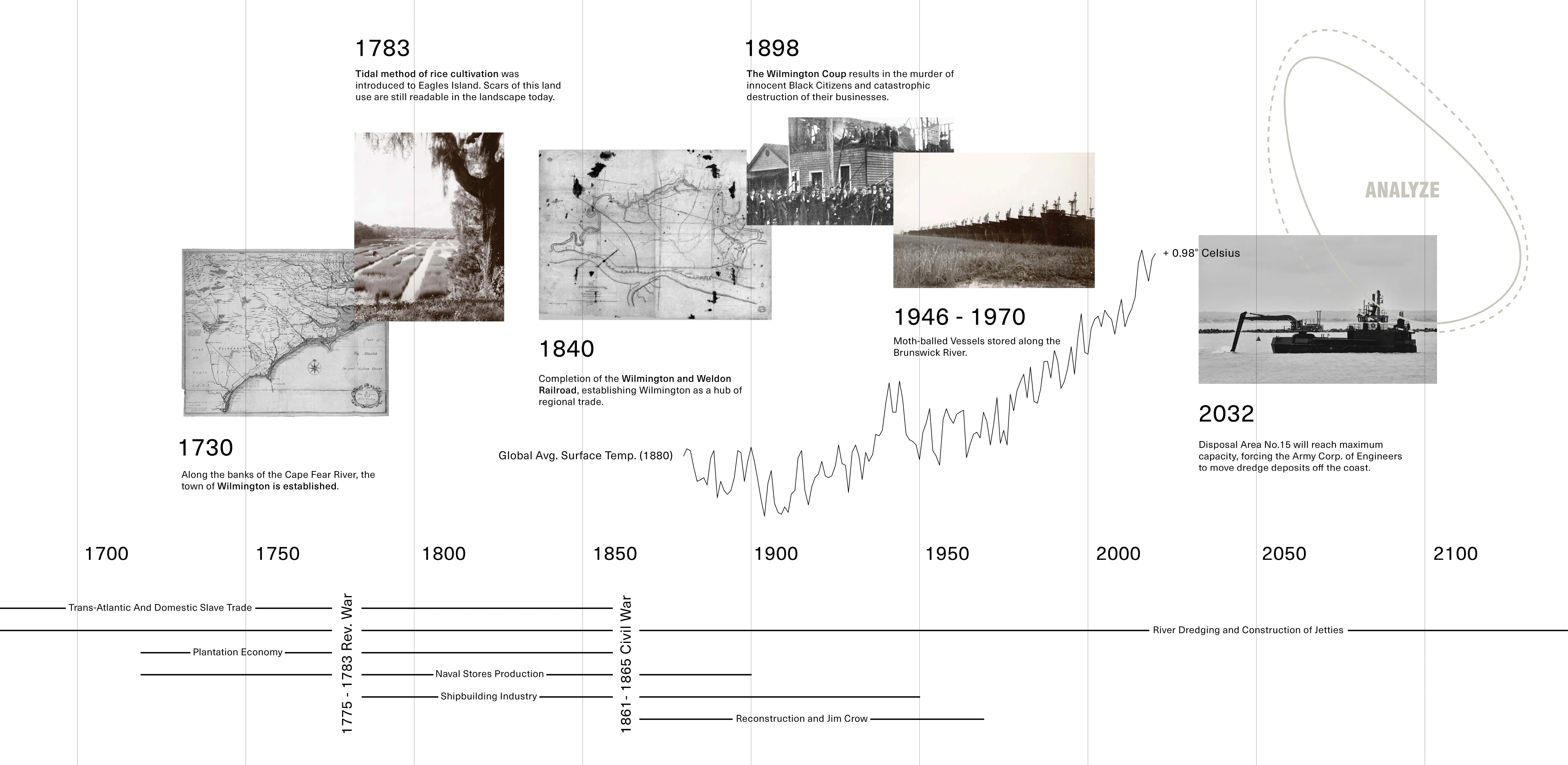 Eagles Island has suffered collateral damage for economic development in the Wilmington region since colonial times. By using archival maps of the area, we determined the location of historic rice canals, former naval stores and shipbuilding operations, and more recent dredge disposal, which all informed proposed plans for the site. We studied projected economic pressures on the island through examining regional and national population trends and census projections.