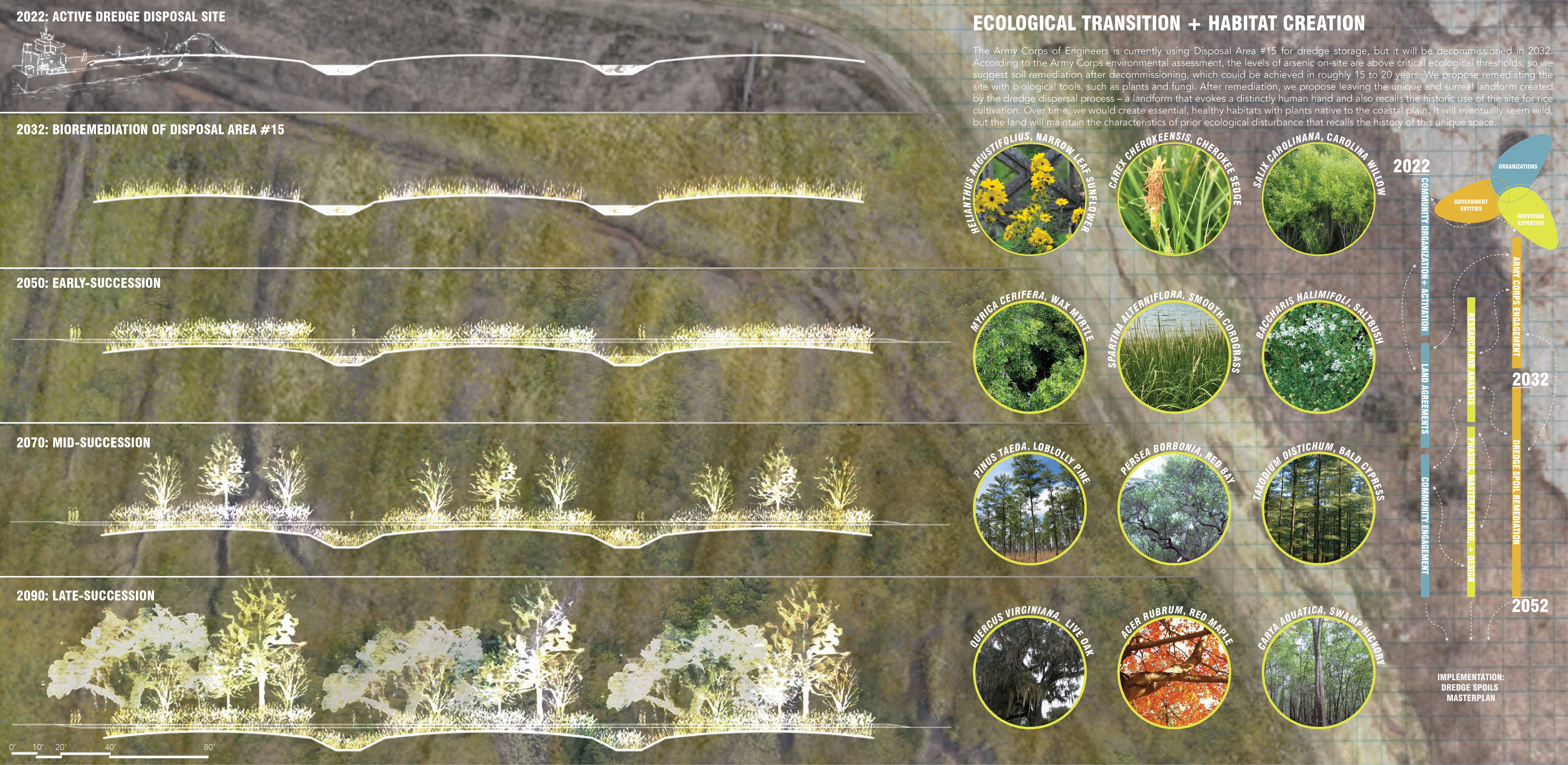 Eagles Island sits at the confluence of the Cape Fear and Brunswick rivers in Wilmington, North Carolina, a coastal city with a growing population known for its historic charm and nearby access to pristine beaches. The northern end of the site retains the scars of remnant rice canals that were once part of a rice plantation, constructed and cultivated by enslaved Gullah Geechee peoples. A proposed regional Gullah Geechee Heritage Trail will link local culturally historic sites in Navassaand Southport, NC, with the potential to link to the historic rice canals of Eagles Island through blueway and greenway trails. The southern end of the site is currently being used to store dredge spoils from the Cape Fear river, but is set for decommissioning in 2032. Surrounded by an earthen berm 24 feet above the surrounding sea level, it is a surreal wasteland. Its toxic soils and unique landform reveal the heavy hand of humans in shaping our world and natural systems – an embodiment of the anthropocene.