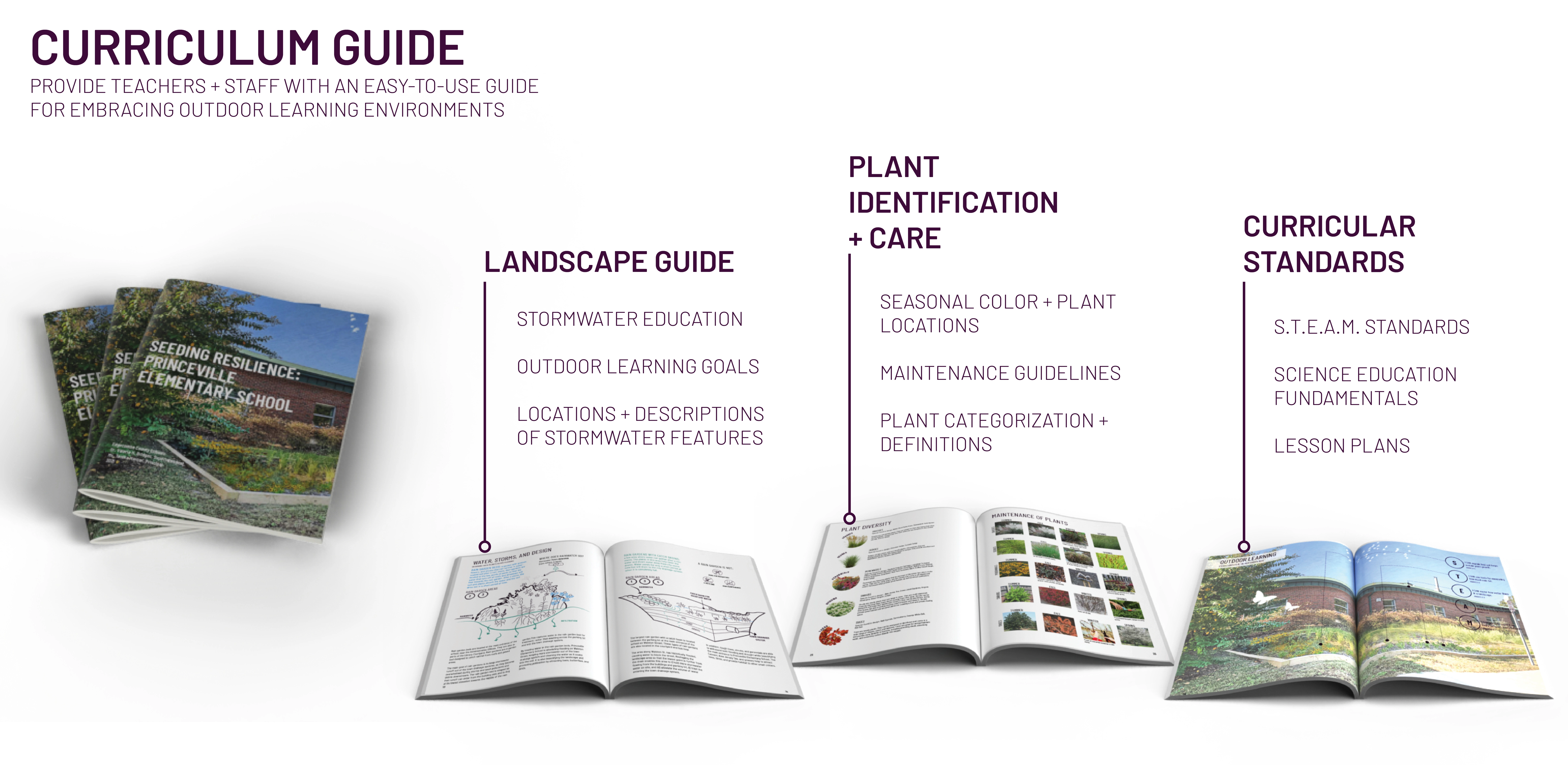 The designs of the rain gardens were informed by research and engineering considerations. Stormwater calculations were completed to ensure the total runoff volume of a 1” rain event will be captured. Additional research was conducted into plant materials to: i) ensure suitable plants for the different microclimates and hydro-zones and ii) prioritize native and pollinator-friendly plants, both of which connect to and enrich the school's existing STEAM curriculum.